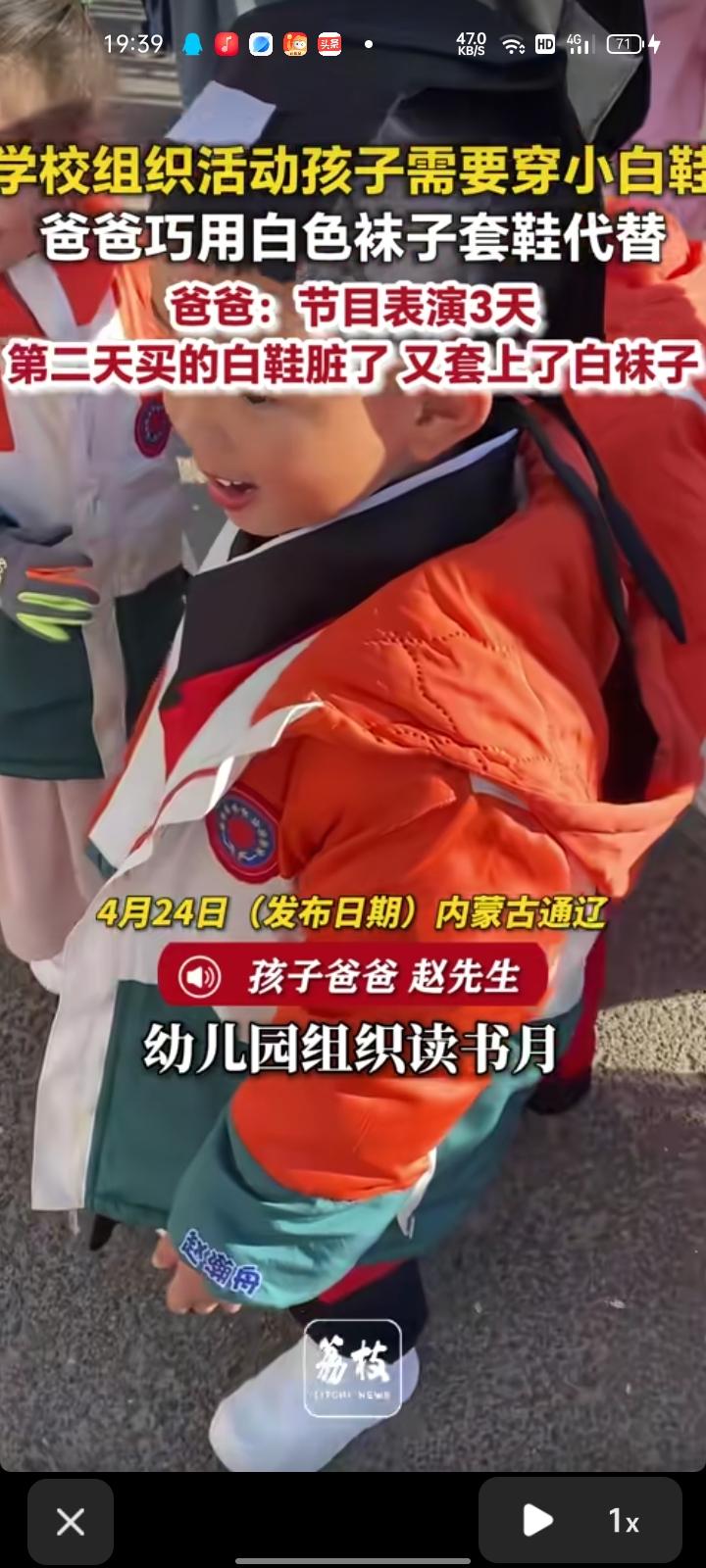 4月21日,内蒙古通辽。孩子爸爸赵先生称,幼儿园组织读书月,孩子需要穿小白鞋,但家里没有。灵机一动在房间里找一双白色袜子套在鞋上。节目一共演了三天,第二天买的白鞋脏了,第三天又套上了白袜子