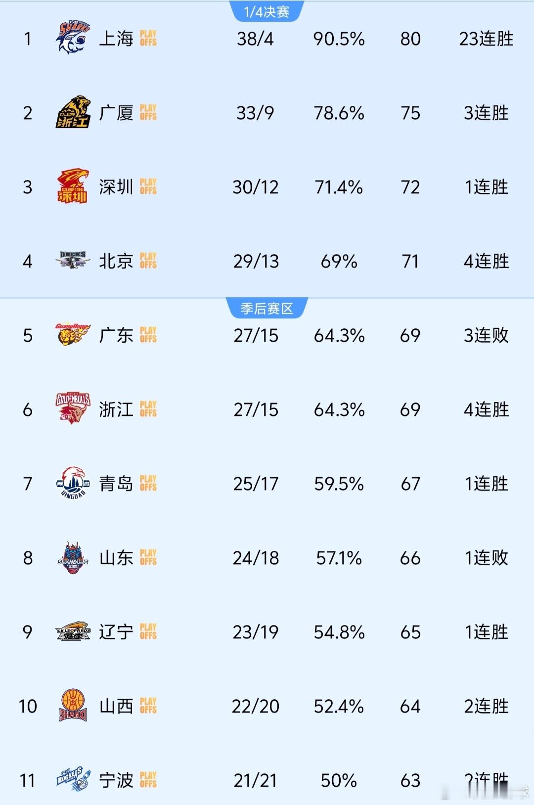 广东队最终以27胜15负的战绩排在联盟第5