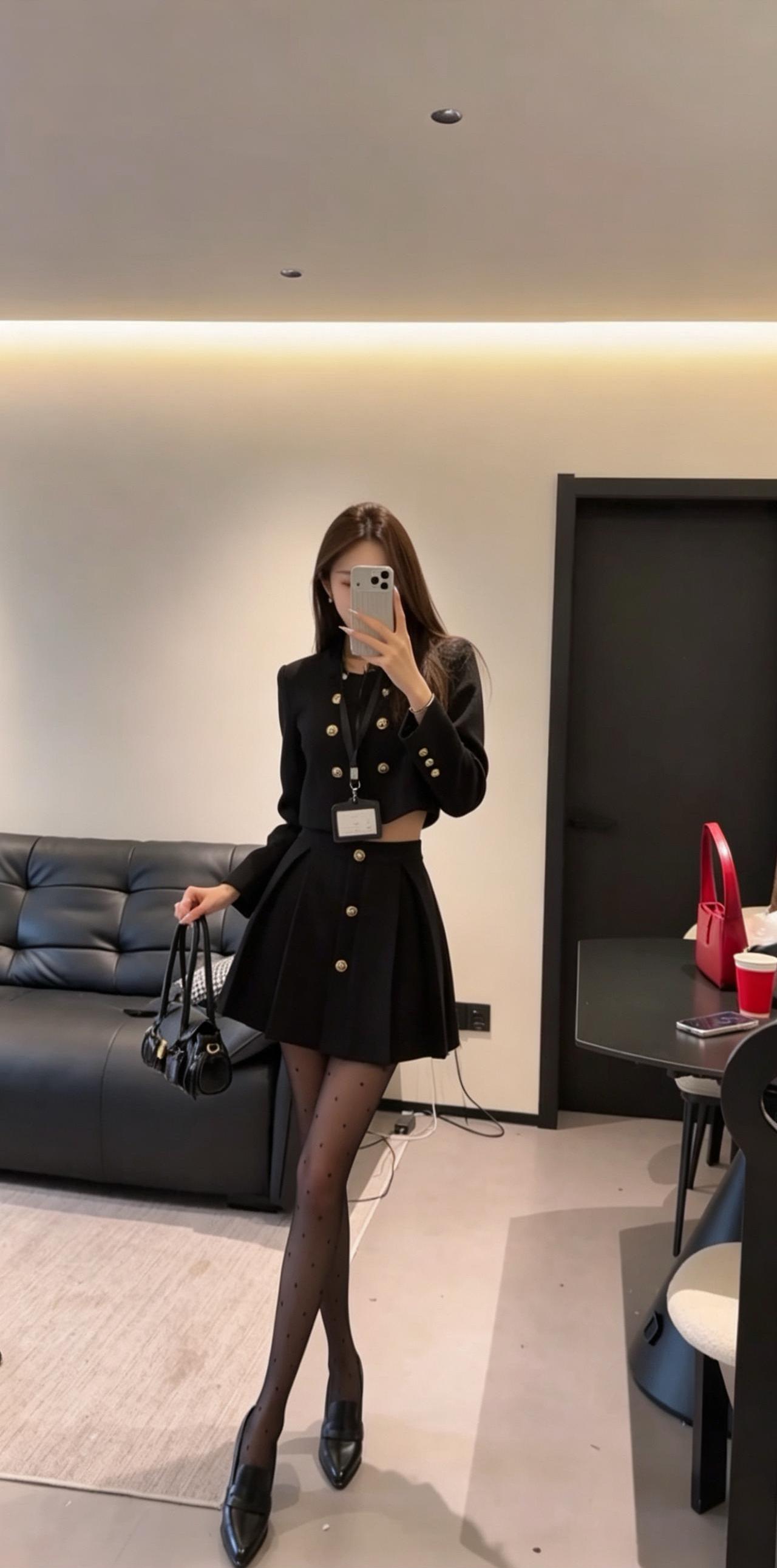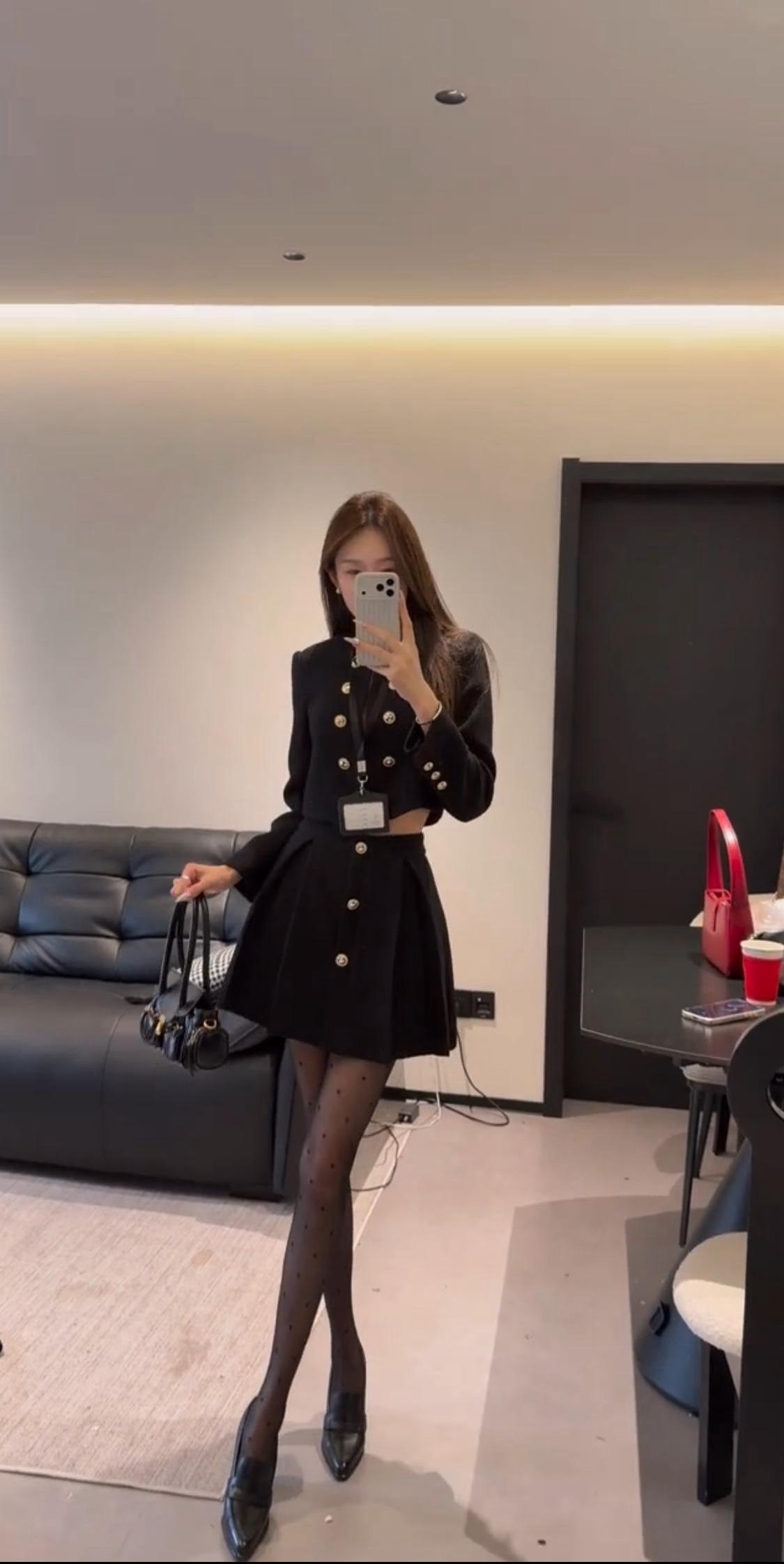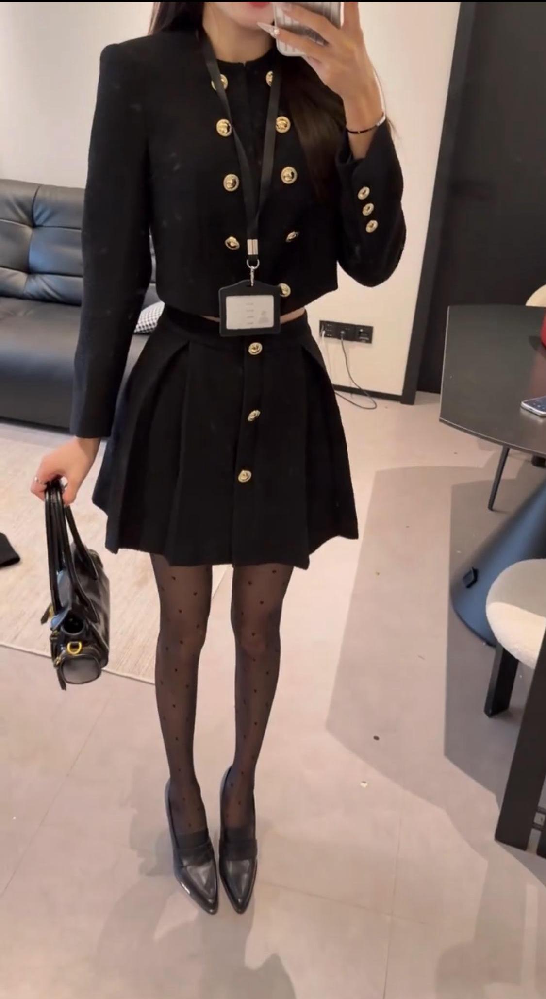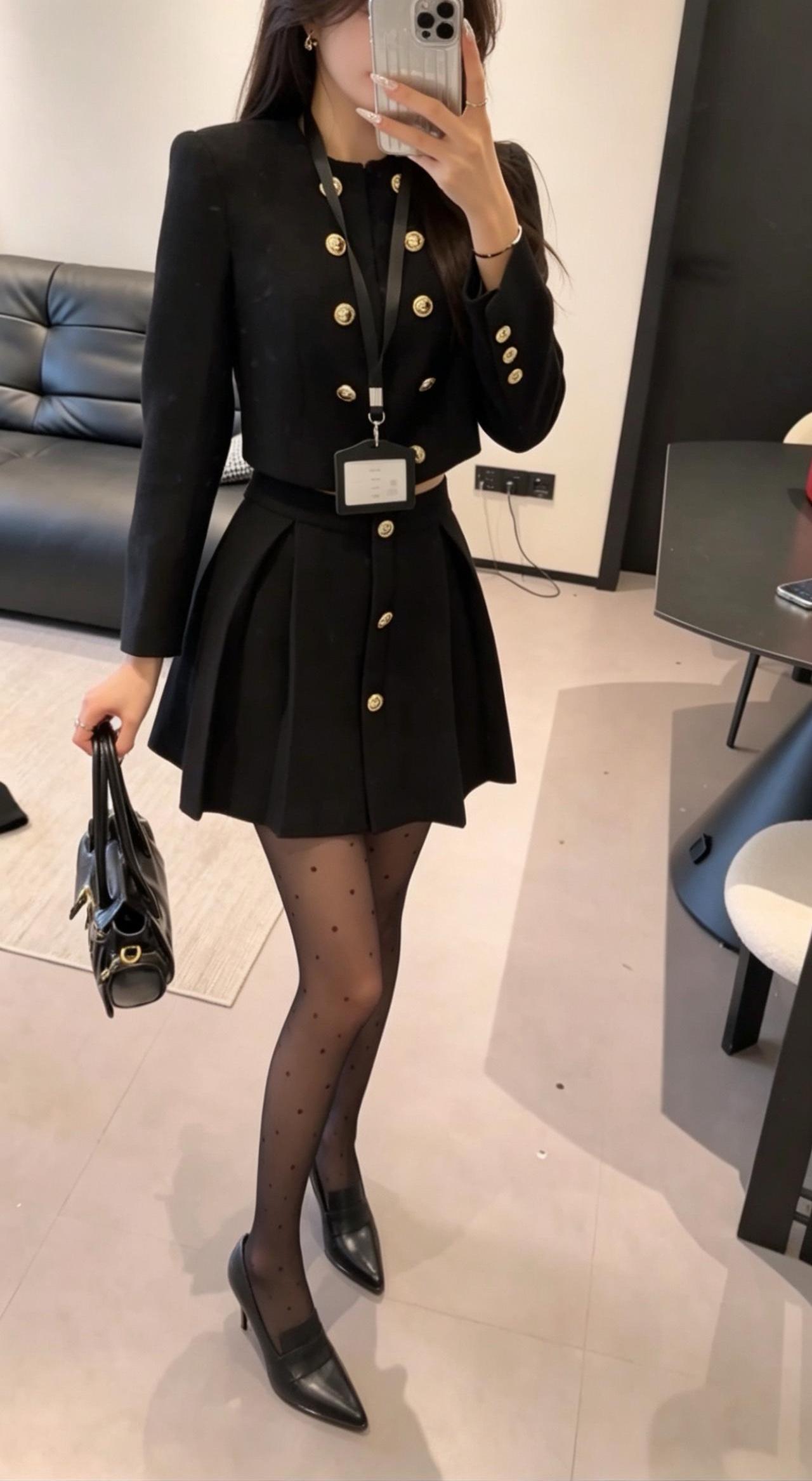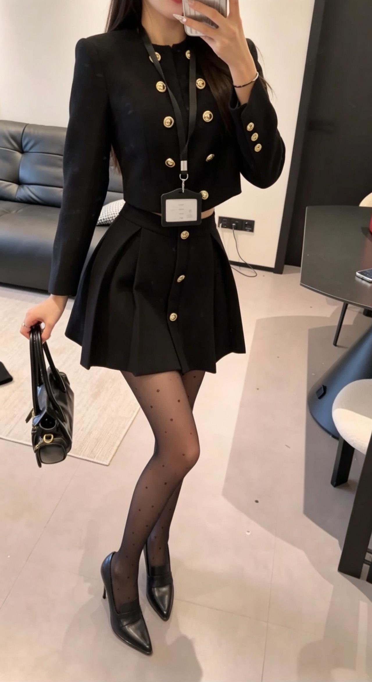 正常穿搭推荐,无不良引导。 今日推荐是通勤少女风。 • 核心单品:短款金扣小香风外套搭配高腰百褶短裙,自带高级贵气感。短款衣身+高腰裙装的组合,是显高显瘦的王牌搭配,能轻松优化身材比例,打造利落又高挑的视觉效果。 • 点睛搭配:波点黑色打底裤与尖头高跟的组合,弱化了套装的正式感,增添了柔媚的女人味。波点黑色打底裤打破了纯黑的单调感,和金色纽扣形成“黑白+金色”的经典配色,让整体造型的高级感直接拉满。 • 整体风格:属于「又纯又欲的通勤少女风」,完美平衡了干练与温柔、正式与精致,是不挑身材、适配多种场景的百搭款。 二、适配场合 • 日常通勤/职场:适配度拉满!小香风自带的正式感,既符合职场得体的着装要求,又不会像刻板西装那样呆板,干练又有气质,轻松打造专业又优雅的职场形象。 • 约会/下午茶:套装的贵气感搭配黑色打底裤的柔媚感,自带氛围感,拍照超出片。同时又不会过于暴露,是约会时自带好感度、温柔又有气质的穿搭选择。 • 轻聚会/姐妹局:自带精致贵气感,在聚会中轻松脱颖而出。搭配高跟鞋气场拉满,无论是单人照还是合照都很出片,轻松成为全场焦点。 • 轻商务场合:搭配同色系低跟鞋,就能弱化整体的性感感,保留干练气质,适配非正式的商务洽谈、部门聚餐等场景,得体又不失个性。