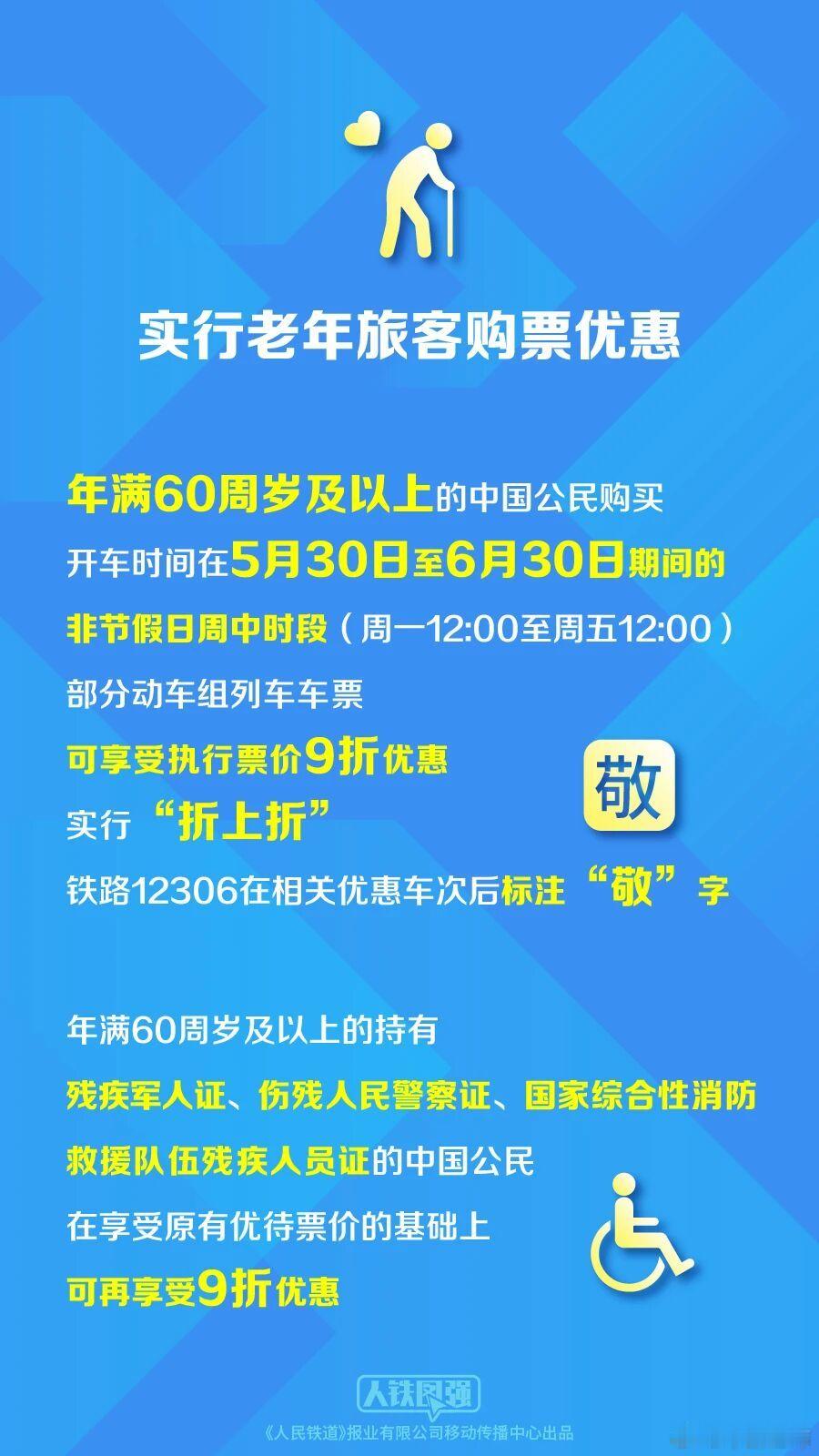 【12306回应超60岁坐高铁打9折】60岁以上部分高铁打九折4月24日,中国铁路发文推出老年旅客购票优惠。其中,5月30日至6月30日对年满60周岁及以上中国公民周中时段乘坐部分动车组列车实行票价可享受执行票价9折优惠,实行“折上折”“折上折”优惠。此外,12306客户端4月至5月发放5.19元、51.9元、519元三档满减券,使用范围覆盖专区上架的全部旅游专列产品。针对此优惠政策,12306客服对表示,目前具体铁路部门还没有收到相关通知,目前暂时没有60岁老师购票折扣优惠,只能享受三倍积分,估计后续我们才会接到该政策通知。