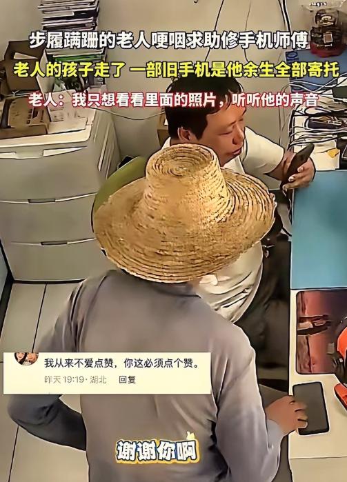 泪目!湖北黄冈,一位老人拿着离世仅21天儿子的旧手机,蹒跚来到手机店请求维修。只有一只手的店主接过一看,竟是老款机型,足足费力拆装了一个多小时才修好。 本以为要花不少钱,结果当他听到老人的一句话后,结账时,店主一个举动让老人当场红了眼眶!陈立的手机维修铺开在湖北黄冈,他这个人有点特别,天生只有一只手,可拧螺丝,焊线路,换屏幕,干起活来比两只手的人还利索。 那天早上铺子刚开门,就进来一个头发花白的老大爷,走路都有点晃晃悠悠的,他怀里紧紧抱着一个红色塑料袋,裹了好几层,像是抱着什么宝贝。他缓缓打开袋子,映入眼帘的是一部陈旧的手机。岁月的摩挲让它的边角泛起光亮,仿佛在诉说着往昔的故事。 老大爷把手机小心翼翼地放在柜台上,声音都在发抖,问陈立,老板,你能不能帮我看看这个手机。 陈立拿过来一瞧,心里就凉了半截,这是二零一八年前后的老机型,早就停产了,想找个配件都难如登天。 他试着按了一下开机键,屏幕黑漆漆的,一点反应都没有。老大爷就站在柜台前,手一直哆嗦,他说,我儿子走了,二十一天前走的,肺癌,才五十八岁。 老人家的眼泪一下子就涌了上来,他说手机里存的全是儿子的照片和视频,他跑了好几家店,都说修不好了,可他晚上睡不着觉,就想翻出来看看儿子。 陈立听完这话,心里咯噔一下,他也是当爹的人,他太懂这种感觉了。他把两个等着换屏幕的年轻人请到旁边坐着稍等一下,跟老大爷说,您把手机先放这儿,我来试试看。 他仅余单臂,修复这般老旧手机本就困难重重,每一个操作都需付出更多心力。况且,连适配的配件都难觅踪迹,这无疑让维修工作更是难上加难。 他拆开后盖,发现主板进水了,还有短路的地方,换作别人早就直接劝老人放弃了。可陈立二话没说,蹲下身子,拿着镊子和手电筒,一点一点地清理那些水渍和锈迹。 旁边有人劝他先吃饭,他说不饿,一头扎进去就是将近两个小时。 终于,短路的地方修好了,他插上充电线,屏幕奇迹般地慢慢亮了起来。 陈立赶紧把老大爷喊过来,一起打开了相册,一张中年男人的笑脸出现在屏幕上。老大爷看到照片的一瞬间,整个人都绷不住了,眼泪哗哗地往下淌,嘴里不停地念叨着,是我的娃,是我的娃。 等老大爷情绪好点了,陈立才说费用的事,老大爷从兜里掏出一个手帕,打开来是一沓叠得整整齐齐的零钱,十块的,五块的,皱巴巴的。 他把钱一股脑推到柜台上,说老板你开个价,不管多少钱我都给。陈立却把钱又推了回去,他说,大爷,这钱我不能收,我也是当爹的,我懂您这心情。 临走前,陈立还特别细心地把旧手机里所有的照片和视频都备份到了老人的新手机上,又传到了云端,手把手教他怎么看。 几天后,老大爷又来了,这次提着自家种的青菜和土鸡蛋,硬是要塞给陈立,推都推不掉。陈立说,他自己从小身体有缺陷,没少受过别人的帮助,淋过雨的人,才更懂得给别人撑伞。 一部旧手机确实不值钱,修起来又费工夫又不赚钱,但对一个父亲来说,那里面装着的,是儿子留在这世上唯一的念想,是后半辈子所有的思念。
