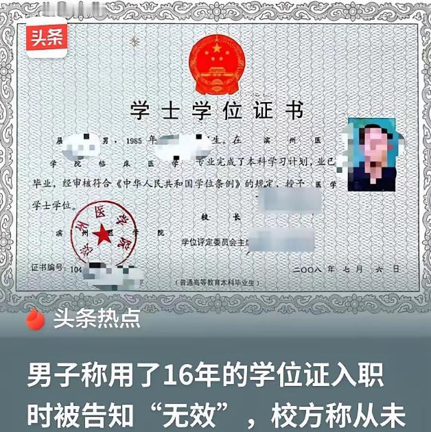“离大谱!” 山东烟台,男子换工作时发现查不到自己的学位信息、也无法进行认证,遂联系了自己的母校,结果被告知母校根本没有授予过他学位证。 因为这张学位证已经用了整整16年,多次因入职、转编、资质审核等办理学位网上认证,均顺利通过,男子懵了,与学校多次理论未果后,为了证明学位证的真伪,直接把自己举报了! 展先生干了一件所有人都觉得他疯了的事,他跑去人社局,把自己给举报了,说自己手里的学位证来路不明,请求组织上好好查一查。 这事还得从二零二五年八月的那个下午说起,展先生坐在电脑前办学历认证,屏幕上突然跳出来一行红字,查无此人。 他脑子嗡的一声,以为自己输错了,又仔細核对了一遍编号,重新输入,结果还是一样。他手里那本用了十六年的学位证书,一下子变得无比沉重,他这十六年的医生生涯,难道都是建立在一张假证上的吗。 他立马给母校打电话,学校那边查了半天档案,最后给了他一个让他无法接受的答复,说二零零八年的学位授予名单里压根儿就没有他的名字,相关的会议记录和领证登记表也全都是空白。 展先生彻底懵了,他明明记得,自己是在二零零九年回学校,亲手从老师那里接过这本证书的,上面的红章,钢印,编号,一个都不少。 往昔,他于学校不慎犯错,遭留校察看一年之惩处。虽按时取得毕业证,然而学位证却因这一经历,延迟一年方才领取。可这确实是学校发给他的啊。 拿着这本证,他进了医院,评了职称,拿到了事业编,后来还跳槽去了更好的医院,这十六年来,这张证书就是他的通行证,从来没有人怀疑过它的真假。 问题就出在,以前那个年代,查学历学位都是看纸质原件,只要上面的章和钢印没问题,就都认。可现在不一样了。 所有信息都上了网,系统直接跟学校的档案挂钩,档案里说没有你,那你就等于是没有。展先生这一下就被卡在了新旧制度的缝隙里。 他拿着证书跑了好几趟学校,可学校就咬死了档案里没有,不承认这张证,也不给补办。展先生被逼急了,这才想出了自己举报自己这一招。 他知道这么做有风险,万一最后被认定是伪造证件,别说工作了,可能还要负法律责任。但他顾不了那么多了,他就是要通过官方的力量,把当年的事情查个水落石出,他要为自己这十六年的清白讨个说法。 这事说到底,最荒唐的不是证书的真假,而是一个靠着这张证书勤勤恳恳工作了十六年的人,一路通过了无数次官方审核,最后却因为系统的一次升级,就被全盘否定了。 这就像你用一把钥匙开了十六年的门,突然有一天,锁换了,然后有人告诉你,你这把钥匙从来就不是这扇门的。 展先生现在还在等着调查结果,他不是在闹事,他只是想弄明白,自己这十六年,到底算什么。