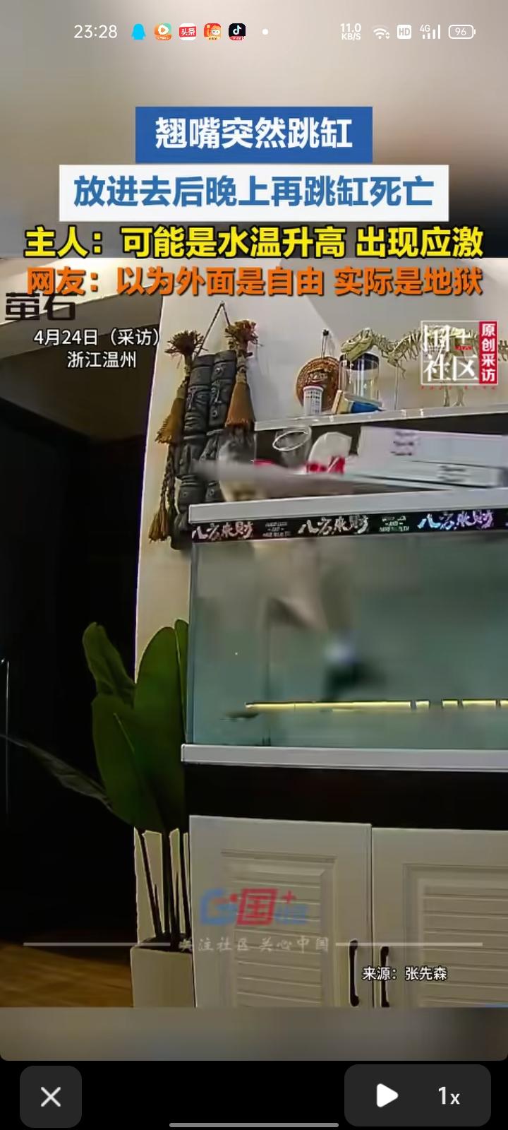 4月21日,温州乐清市。监控画面显示,翘嘴突然跳缸,鱼放进去后晚上再跳缸死亡。 鱼主人张先生称,事发时他和朋友在店里喝茶,鱼突然蹦出来了。估计是水温升高,然后出现应激。后面把它放进去了,到了晚上它又开始跳,然后第二天就死掉了、
