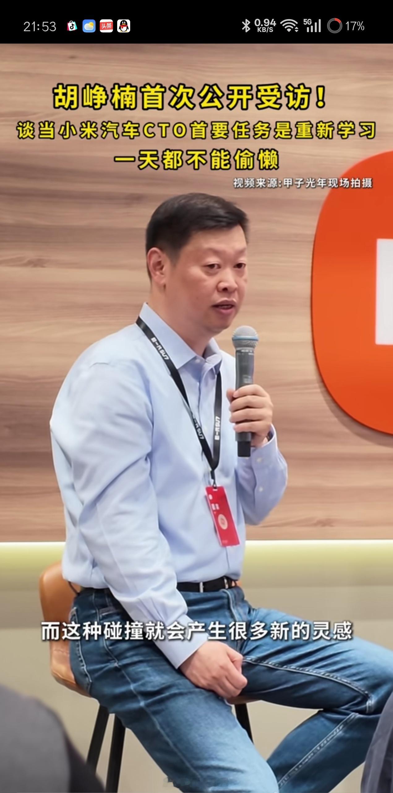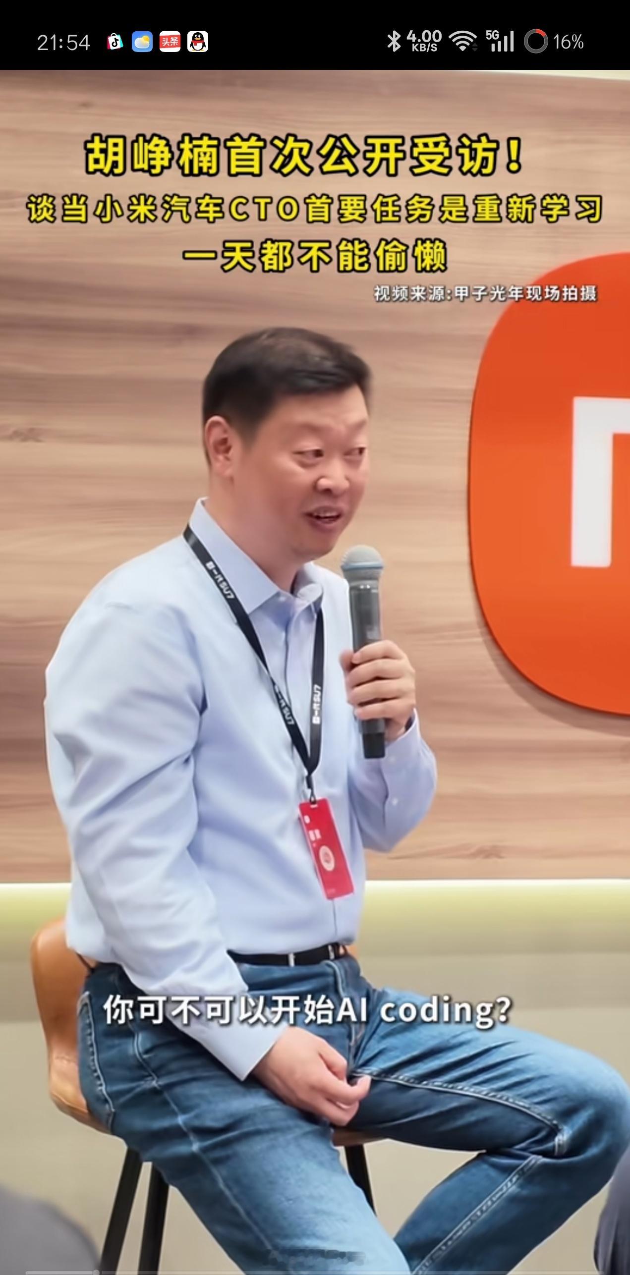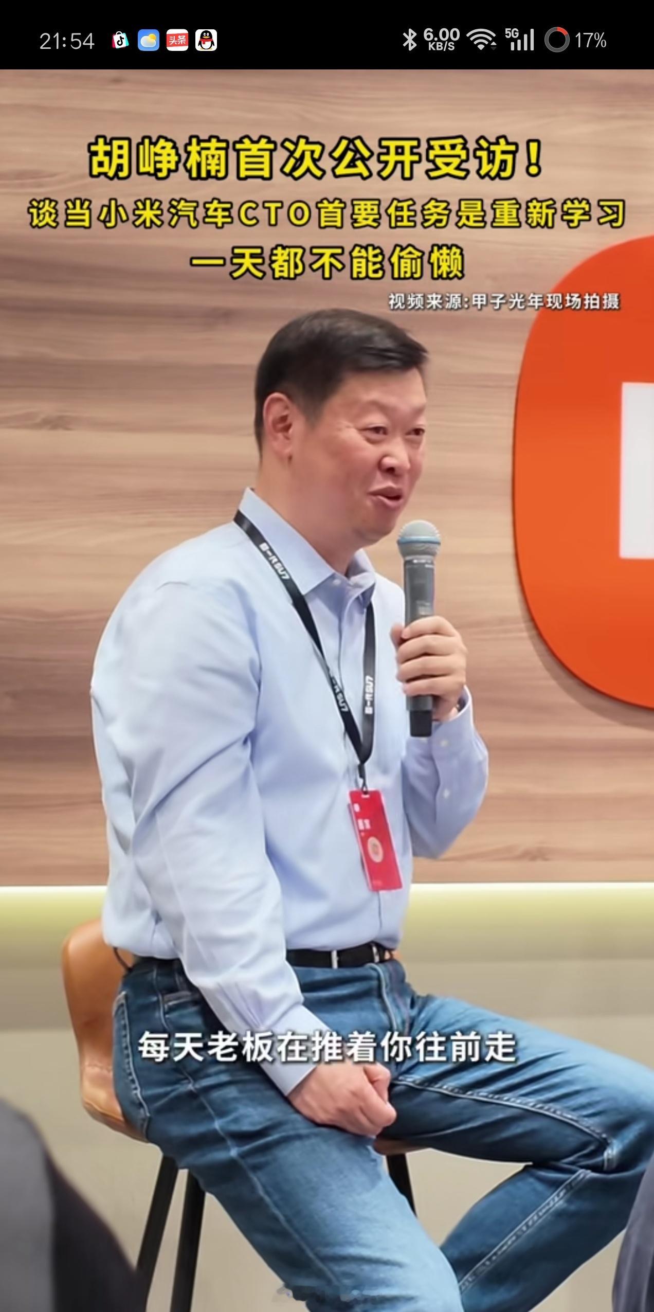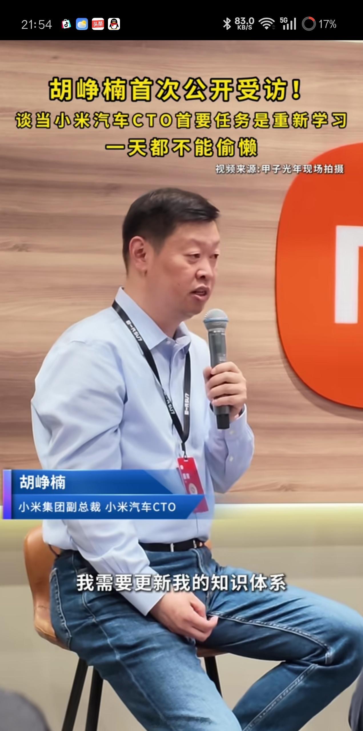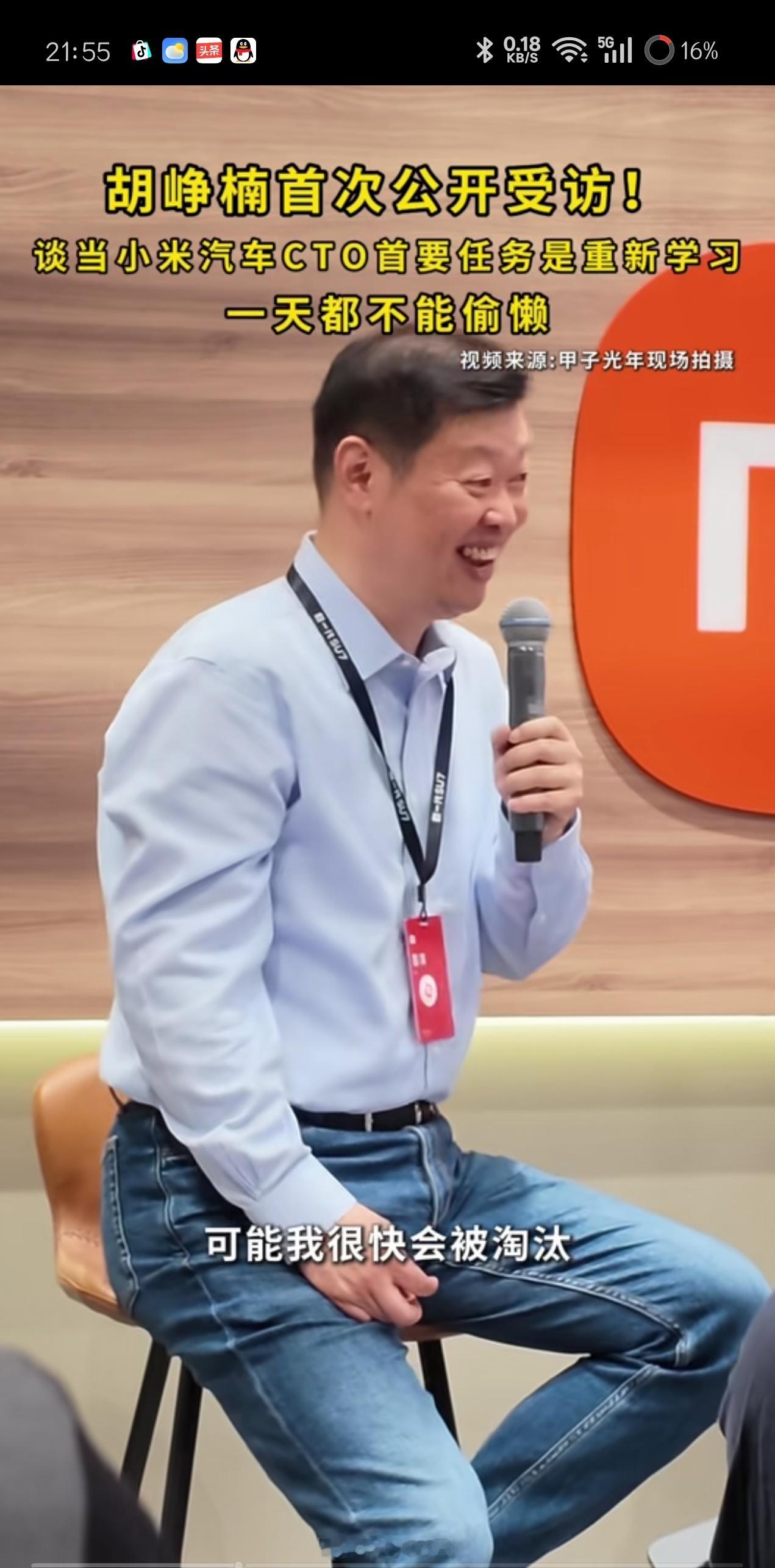 刚刷到甲子光年采访小米汽车CTO胡峥楠,笑死了,胡峥楠坦言:每天被老板(雷军)推着往前走,一天都不能偷懒,我要更新知识体系,不进步可能我很快被淘汰