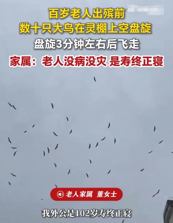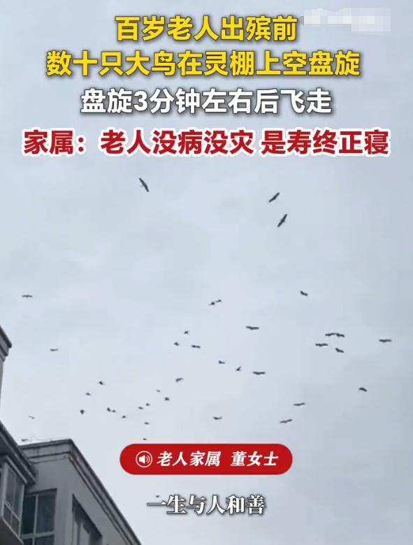 “102岁老人下葬,一群大鸟在空中盘旋哀鸣!”江苏徐州,一位102岁的老人安详离世。万万没想到,就在准备起灵下葬的时候,天空突然飞来一群鸟,哀鸣盘旋,持续数分钟后才散去。 这一幕让在场的老人家属和邻里感慨万千。老人的儿子红着眼眶说:“我父亲一辈子行善积德,连鸟儿都来送他最后一程。” 这背后到底有着怎样的故事?让我们从头说起。 老人是出了名的老好人,几乎没跟人红过脸。邻里之间有矛盾,他去调解;家人之间有争执,他去化解。大家都说,老爷子心善,是个有福之人。 果不其然,老人活到了102岁,一生无病无灾,寿终正寝。用当地人的话说,这就是最好的归宿。 出殡那天,按照当地风俗,家人在院子里搭起了灵棚。哀乐低回,邻里们陆陆续续赶来吊唁。老人一辈子没当过官,也没发过大财,但来送他的人却不少。大家都说,这是个好人,值得送一程。 就在众人准备起灵的时候,天空突然出现了异象。 从小区南门方向,突然飞来一群大鸟,在灵棚上方盘旋。大家起初没太在意,毕竟这个季节鸟儿本来就多。可紧接着,鸟越聚越多,从从十几只变成了好几十只,到后来黑压压一片。 这些鸟个头不小,羽毛灰褐色,双翅展开来足有半米长,在上空一圈圈地盘旋,一边飞一边发出类似哀鸣的叫声,声音低沉悠长,听得人心里一阵阵发酸。更神奇的是,这些鸟既不飞走,也不落下来觅食,仿佛在完成一种仪式。 现场有人掏出手机拍视频,有人愣在原地仰着头看,还有年纪大的老人擦起了眼泪。说:“我活了七十多年,从没见过这种事。” 大约持续了三分钟,这群鸟才像是完成了任务,扑棱着翅膀飞走了,消失在远方的天空里。 这到底是巧合,还是冥冥之中的天意? 这件事传开后,引发了广泛的讨论。有人说,这是老人一生行善积德感动了天地,连动物都来送他最后一程。 也有人试图从科学角度找解释,比如有记者为此采访了相关领域的专家。专家表示,这可能和候鸟迁徙有关。徐州地处我国东部候鸟迁徙通道上,每年春季,大量候鸟会从这里经过。出殡时可能恰巧碰到了迁徙中的鸟群,加上灵棚附近可能有食物残留或者特殊的气流条件,吸引了鸟群盘旋。 不过,在中国传统文化中,乌鸦反哺,羔羊跪乳,动物有灵性的故事在民间多不胜数。不管是不是巧合,这种景象出现在一位百岁老人的葬礼上,本身就是对老人一生行善的最佳告慰,也寄托了人们对“好人有好报”这一朴素信念的坚守。 截至发稿时,这段视频仍在网上流传。对科学而言,这或许只是自然界中一个能被解释的现象;但对逝者家属和乡亲们来说,这更像是一场特别的送别。