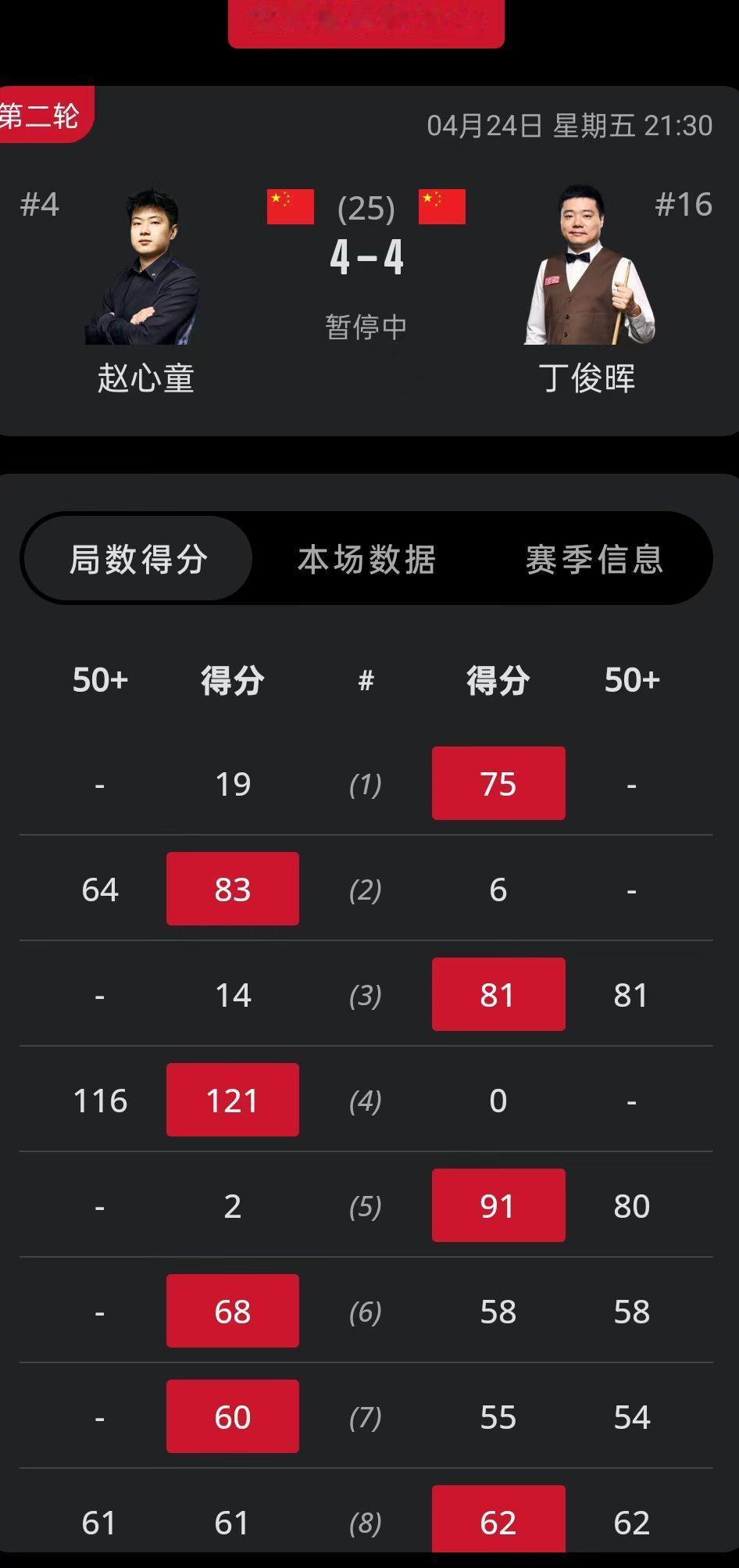 世锦赛,赵心童和丁俊晖第一阶段4-4战平。 双方也都发挥了自己的特点,赵心童长台犀利,但是会有简单失误。丁俊晖长台一般,但是更加稳健。 一开始赵心童就连续失误被罚8分,丁俊晖顺利拿下第一局。后面两人此起彼伏,分差一直拉不开。最后一局,赵心童有机会把比分拉大到5-3,但是简单黑球没进。丁俊晖一杆清台,1分逆转, 两人第二阶段比赛在今天晚上9点半。看看双方状态能否调整的更好。