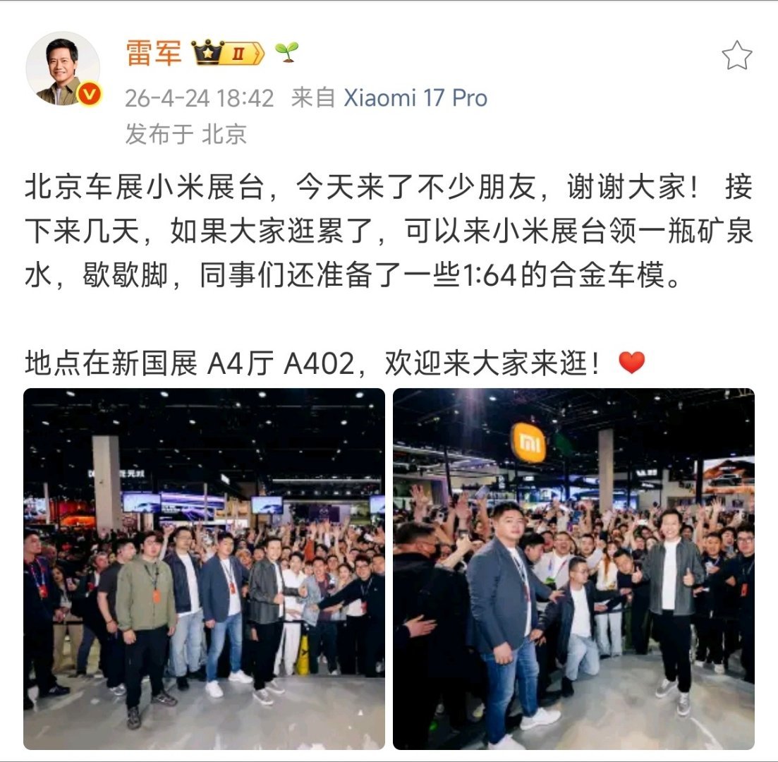 雷军晒北京车展合影北京车展首日落幕,今天小米展台可以说是相当热闹了,小米汽车全系车型一同亮相,同时还有 Xiaomi Vision GT 概念超跑国内首秀和小米 YU7 GT 的最新官宣,在整个车展中的关注度都是相当高的。
