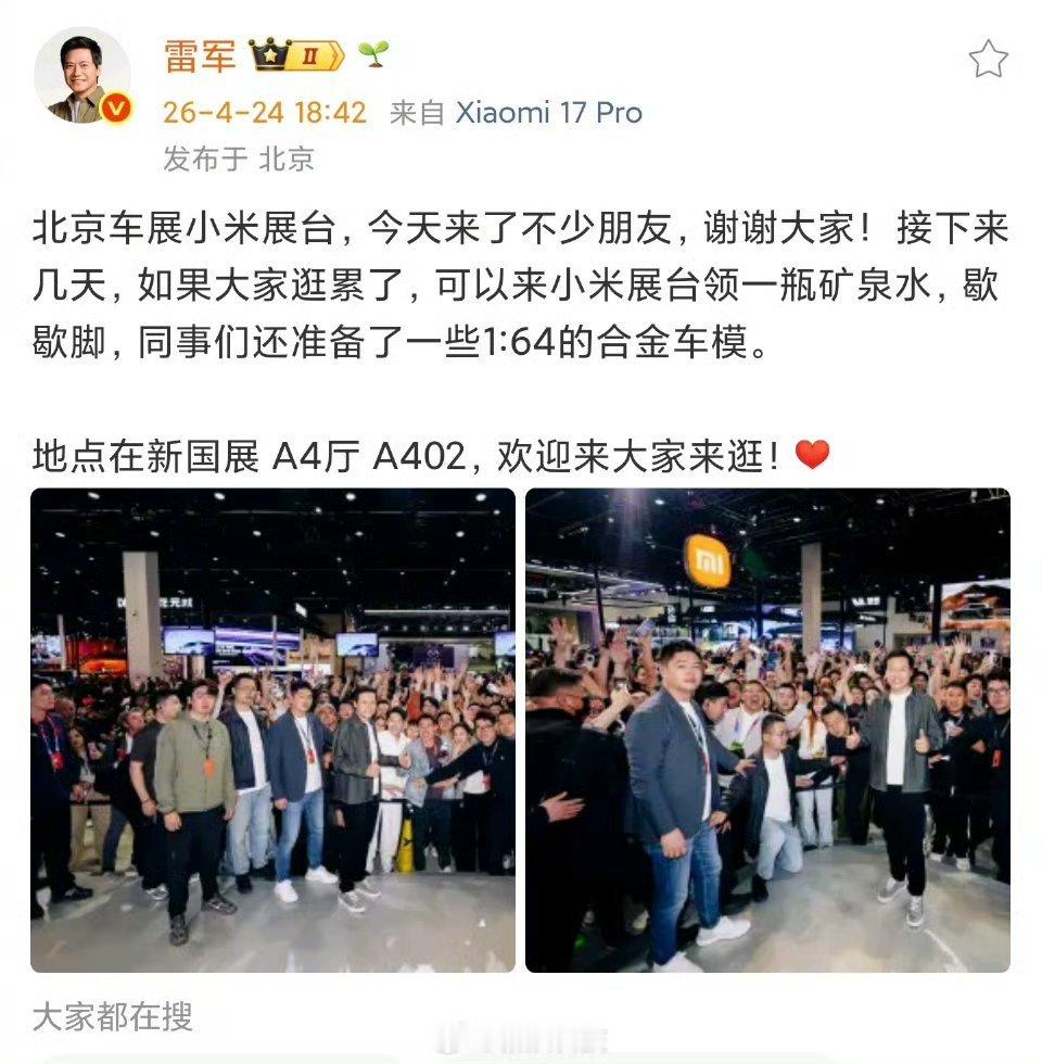 雷军晒北京车展合影今天是我第一次排队领小米的车模,跟你们说个好笑的事情,有好几个胸口挂着参展商的跟我一起排队领车模。不过考虑到前荣耀负责人赵明都笑呵呵来小米展台参观,那参展商排队领车模就不奇怪了