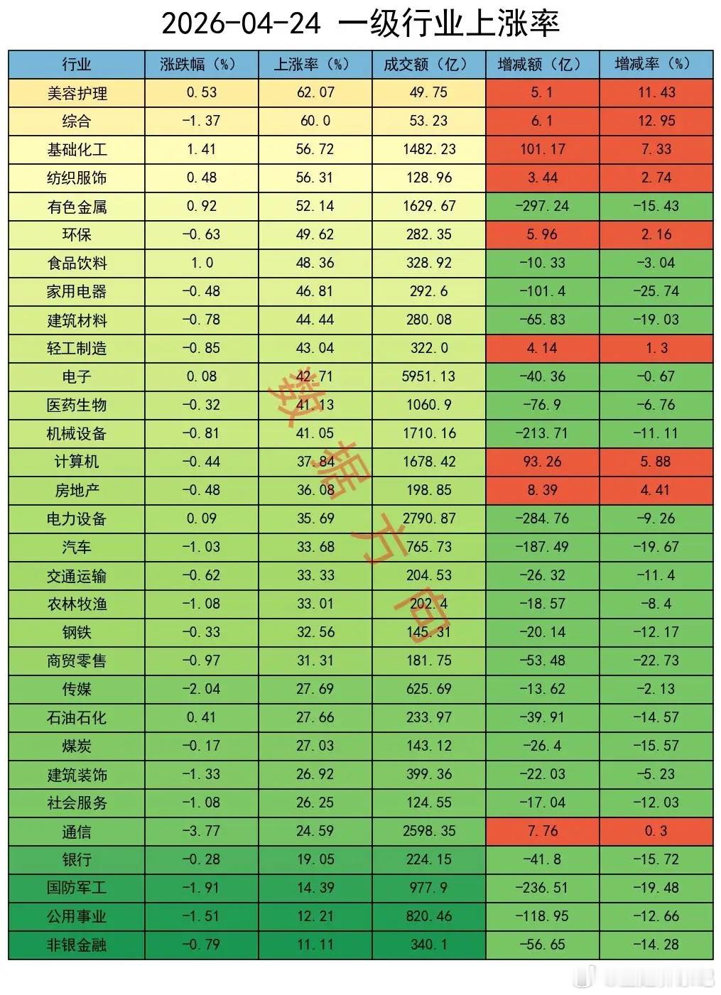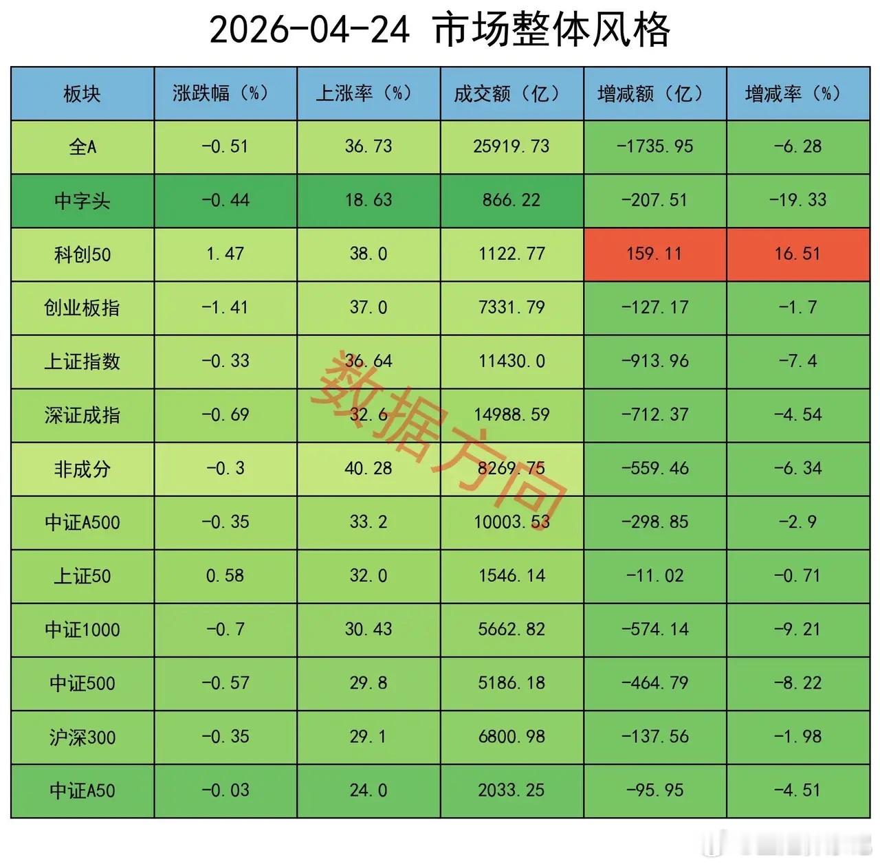 大盘全天弱势整理,全A指数跌幅0.51%,锂电池、半导体携手上涨,算力硬件方向回调明显,个股上涨率37%,成交额较昨天缩量6%。