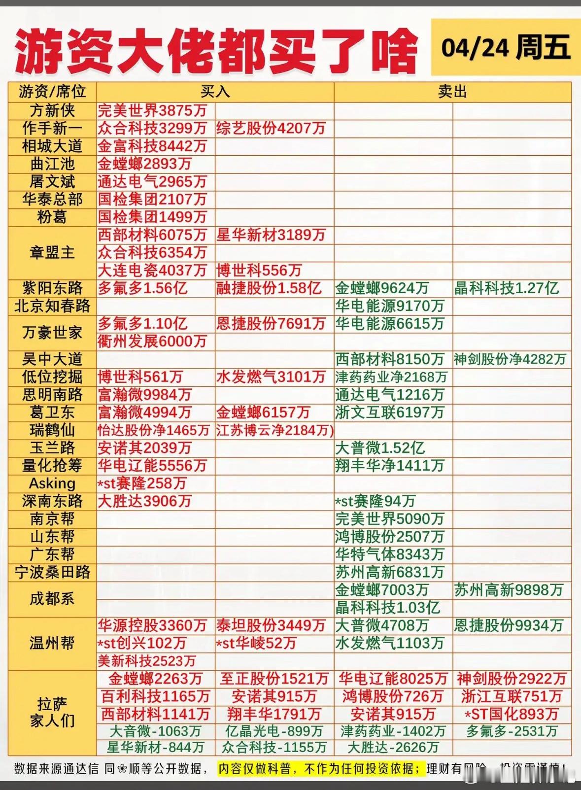 4月24日龙虎榜游资大佬的投资秘籍揭晓!💰📈4月24日龙虎榜游资大佬的投资秘