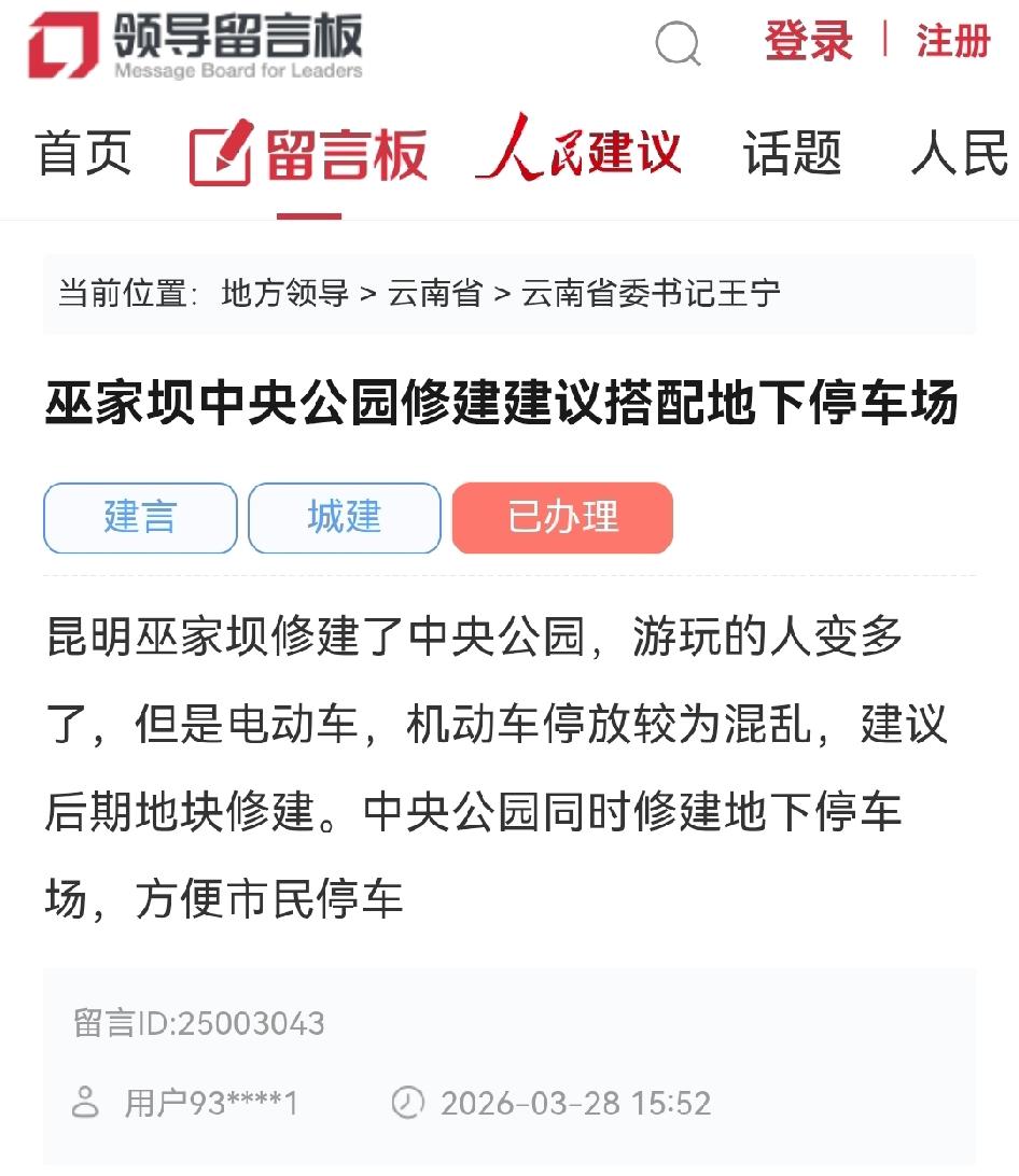 昆明网民给省委书记留言建议巫家坝中央公园修建配套搭配地下停车场 ✍➡️近日昆明网民通过人民网领导留言板给云南省委书记的留言 巫家坝中央公园修建建议搭配地下停车场 昆明巫家坝修建了中央公园,游玩的人变多了,但是电动车,机动车停放较为混乱,建议后期地块修建。中央公园同时修建地下停车场,方便市民停车 2026-04-21 19:00 📢📢昆明市官渡区综合行政执法局官方回复 网民同志:您好! 您通过人民网领导留言板的留言已收悉,经昆明市官渡区综合行政执法局认真调查处理,现将有关情况回复如下: 官渡区巫家坝中央公园五标段巫家坝壹号城市公园现已由巫建发建设完成,C地块正在建设中,后续巫家坝片区公园建设将会积极规划机动车及非机动停车位,规范管理市民车辆停放,加强日常管理,让巫加坝公园能更好的承载市民日常休闲,更好地呼应城市发展的时代节奏。 感谢您的理解与支持,顺祝身体健康、生活愉快!