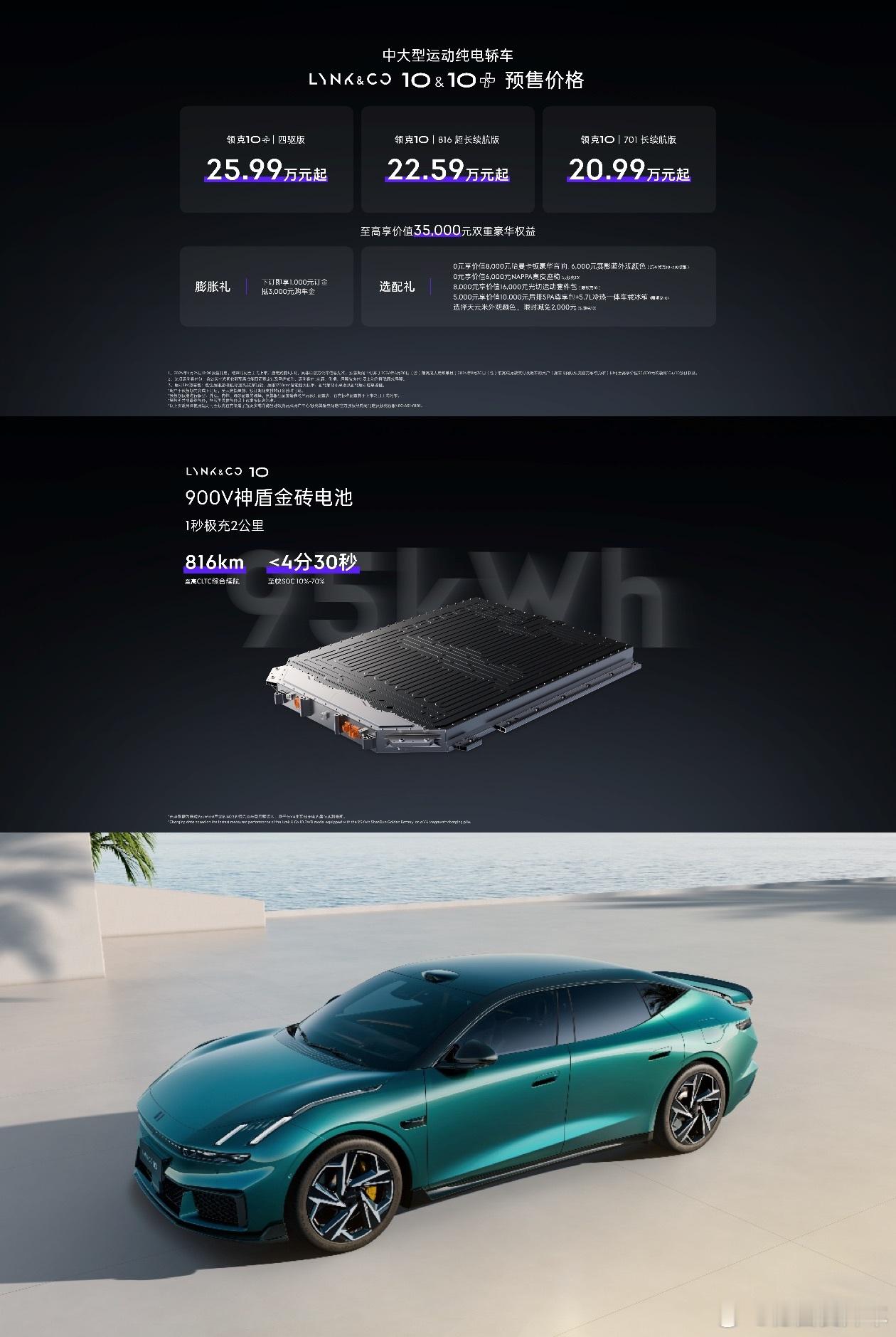 其次,中大型运动纯电轿车领克10与10+正式开启预售,预售价20.99万元起,5月上市;两款车基于900V高压平台打造,领克10+双电机四驱零百加速3.2秒,登顶亚洲山脊赛道圈速第一,领克10则实现10%-70%快充仅4分22秒,电池安全达超国标12倍。
