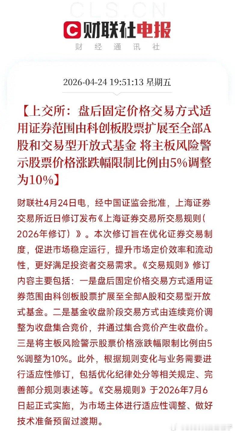 上交所深夜改规则:ST股涨跌幅扩大到10%了,盘后半小时也能买股票了