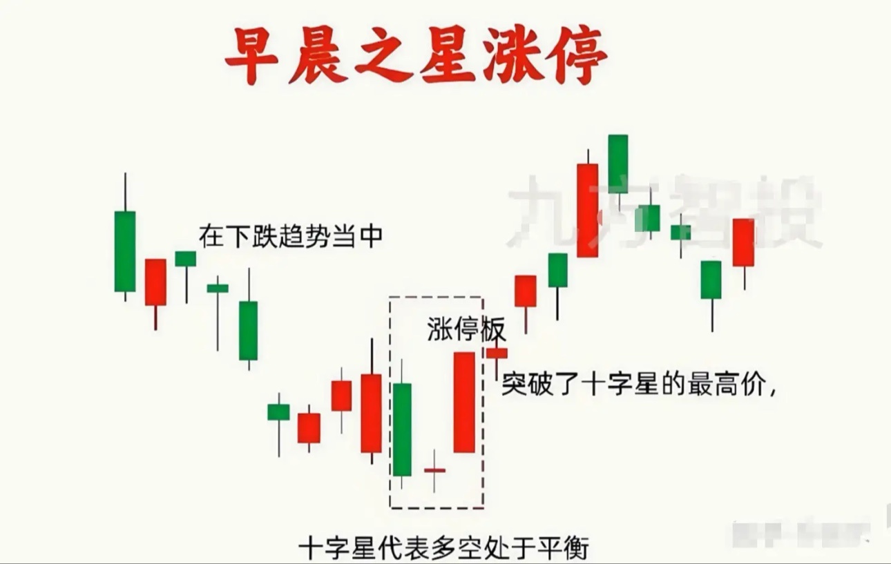 上海炒股冠军罕见发声:本金20W,建议死磕这早晨之星涨停形态早晨之星涨停是A股技术分析中经典的短期趋势反转形态,主要出现在股价持续下跌趋势末期,以“阴线+十字星+涨停阳线”的三根K线组合,清晰传递出多空力量的逆转信号,是短期可重点关注的技术形态,但需结合核心特征甄别有效性,同时严格遵守交易纪律,规避盲目跟风风险。以下从形态构成、核心特征、市场含义、交易纪律四大维度,进行详细拆解说明。一、早晨之星涨停的完整形态构成(详细拆解)