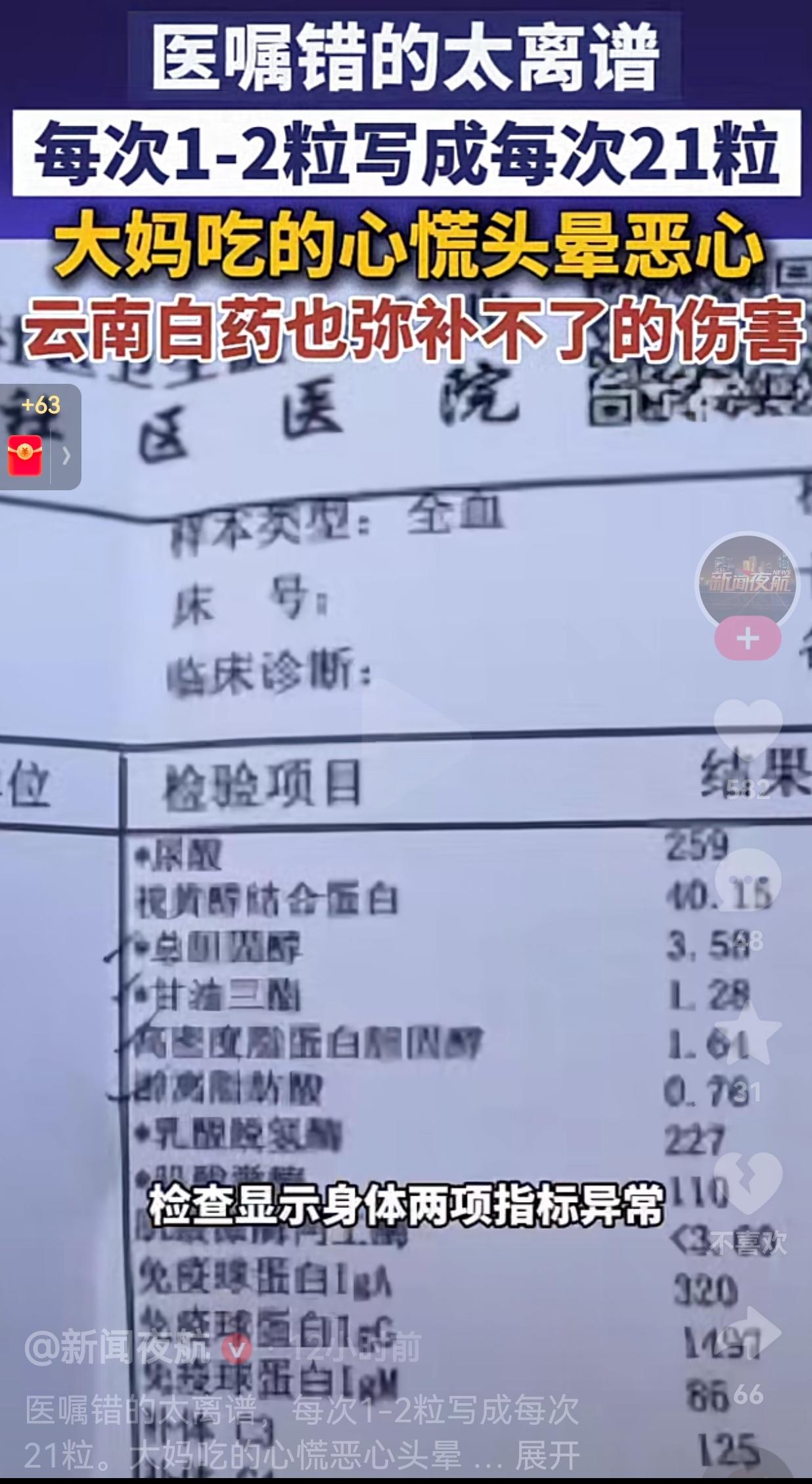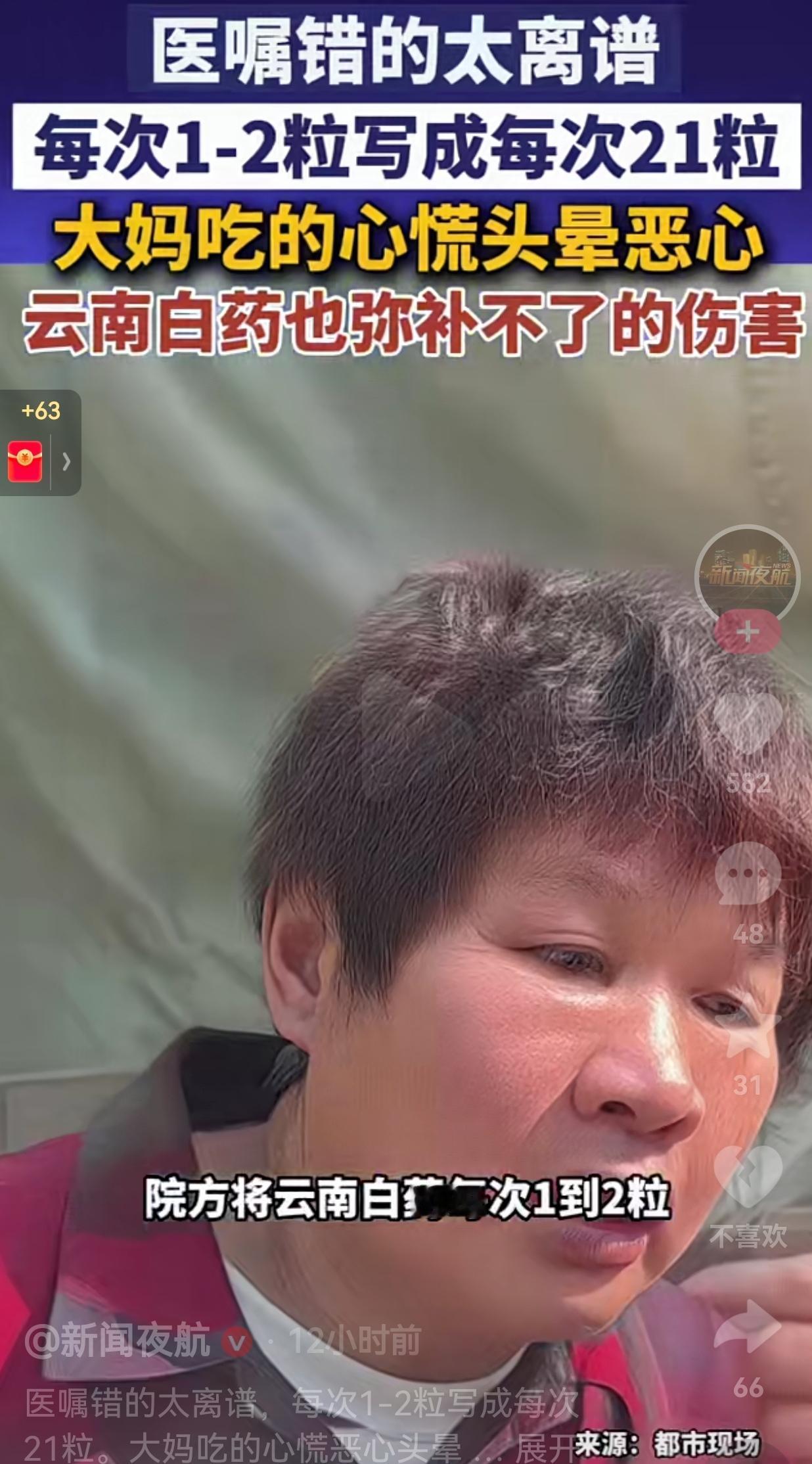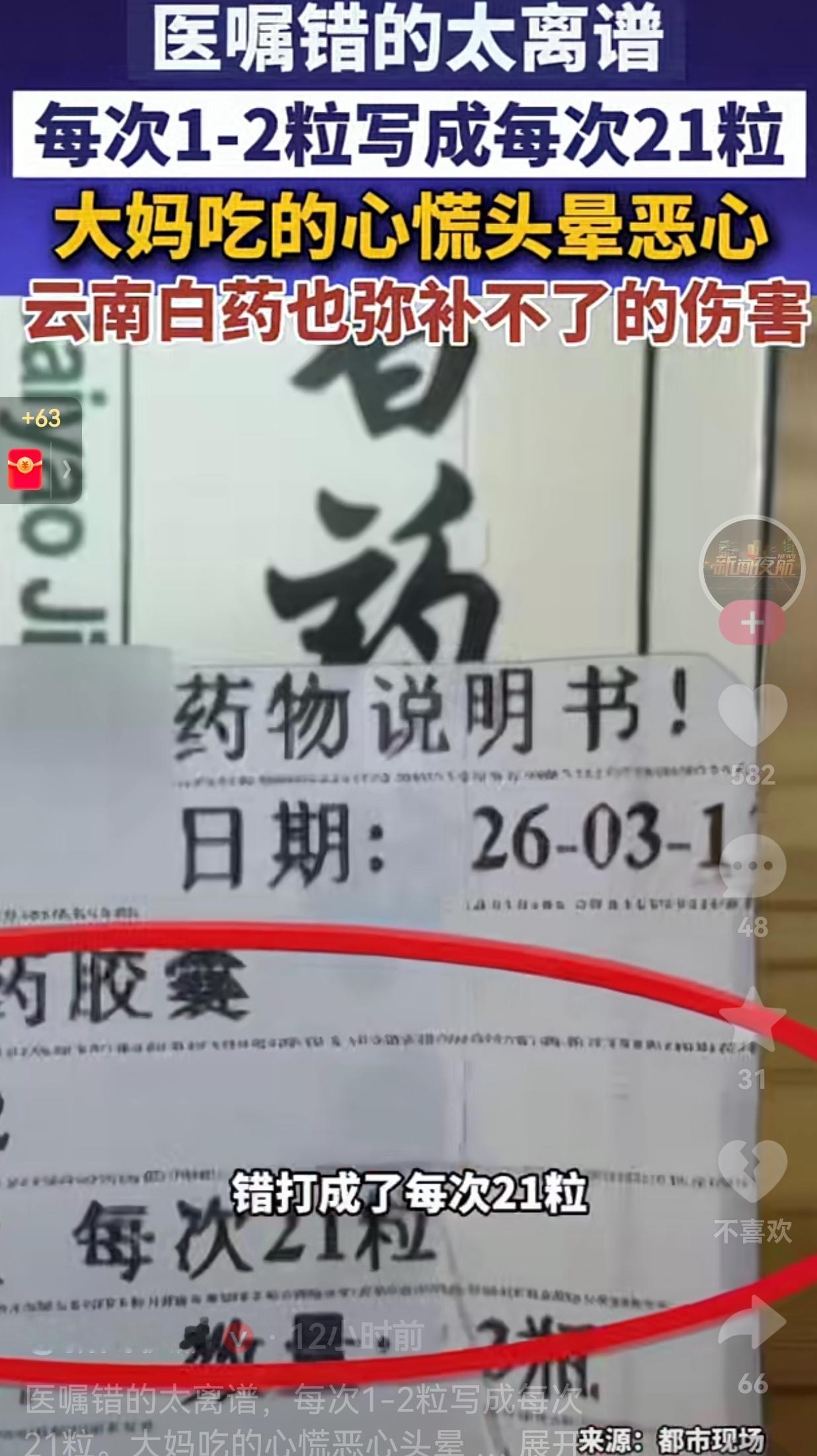 医嘱写成“每次21粒”,大妈乖乖遵医嘱吃药!结果头晕恶心险出事,处理结果引争议 真的很难想象,仅仅因为医生一次粗心录入错误,就差点酿成一场严重的用药事故。 浙江绍兴的应大妈,前段时间因为脚伤不适,去到当地社区卫生服务中心就诊,医生给开了云南白药胶囊。 这款药的官方说明书写得很清楚,正常成人用量,一次只需要1到2粒,每日两次就足够。 可不知道是操作手滑,还是工作粗心大意,医生在开具处方医嘱时,直接把用药量错写成每次21粒。 上了年纪的老人,从来都是完全相信医院和医生,根本不会去质疑处方对错。 应大妈老老实实按照单子吃药,一天两次、一次21粒,一天下来直接吃下42粒胶囊。 没过多久,身体立刻出现严重不适,频繁头晕、恶心反胃、心慌乏力,整个人精神状态极差。 后续复查检查,身体两项指标出现异常,好好的人,硬生生因为用药过量遭了大罪。 事后家属找到院方讨要说法,提出合理赔偿诉求,双方沟通差距很大。 家属诉求合理补偿,而院方只给出2000元补偿方案,分歧太大,一直僵持不下。 网友看到后评论说: “一次21粒明显不合常理,药房、审核环节全都没发现,太不严谨了。” 也有的网友说:“老人不懂用药常识,完全遵照医嘱,出错本来就不该由患者来买单。” 还有的网友说:“万幸只是身体不适,没造成严重后果,一旦出事,谁都承担不起责任。” 更有网友表示:“医疗流程层层把关,结果层层失守,这种疏忽真的太让人后怕。” 说真的,看完整件事,后背直发凉。 老百姓看病就医,天生就信任医护人员,医嘱怎么写,老人就怎么吃,压根不会多想。 谁能料到,本该严谨专业的处方,会出现这么离谱的低级错误。 一张处方,要经过医生开单、护士审核、药房发药好几道流程。 这么多工作人员,居然没有一个人发现,一次21粒药量明显反常,全部一路放行。 说到底,就是日常工作松懈、流程走过场,缺乏最基本的严谨和细心。 大妈本来只是简单外伤,不用遭这么大罪,却因为别人的粗心,白白损伤身体、承受病痛。 犯错不可怕,可怕的是出了问题之后,不能正视失误、好好协商解决。 这件事也给所有人提了一个醒: 不管年纪大小,拿药之后,一定要自己多看一眼说明书,核对用法用量。 不要一味盲从医嘱,多核对、多问一句,就能规避很多没必要的风险。 医疗行业可以允许偶尔失误,但绝对不能缺少对生命的敬畏。细节决定安全,严谨才是医疗行业最该守住的底线。 最后,我想说的是:一次小小的工作疏忽,背后可能就是一个家庭难以承受的代价。 对此,你怎么看? 来源:新闻夜航