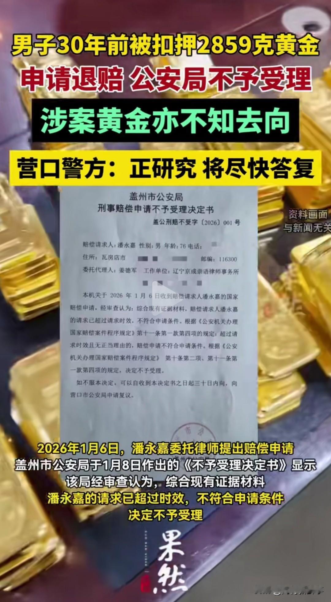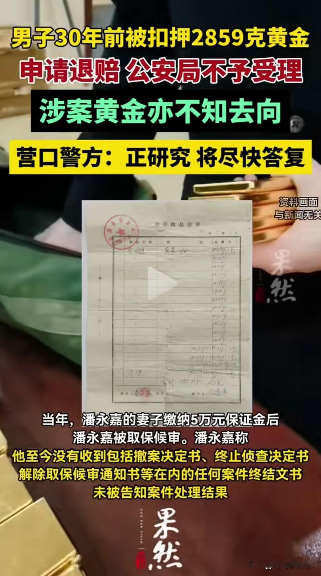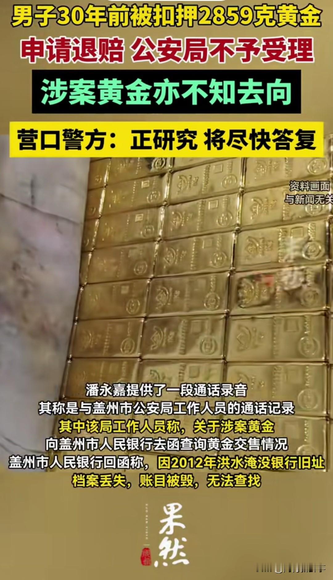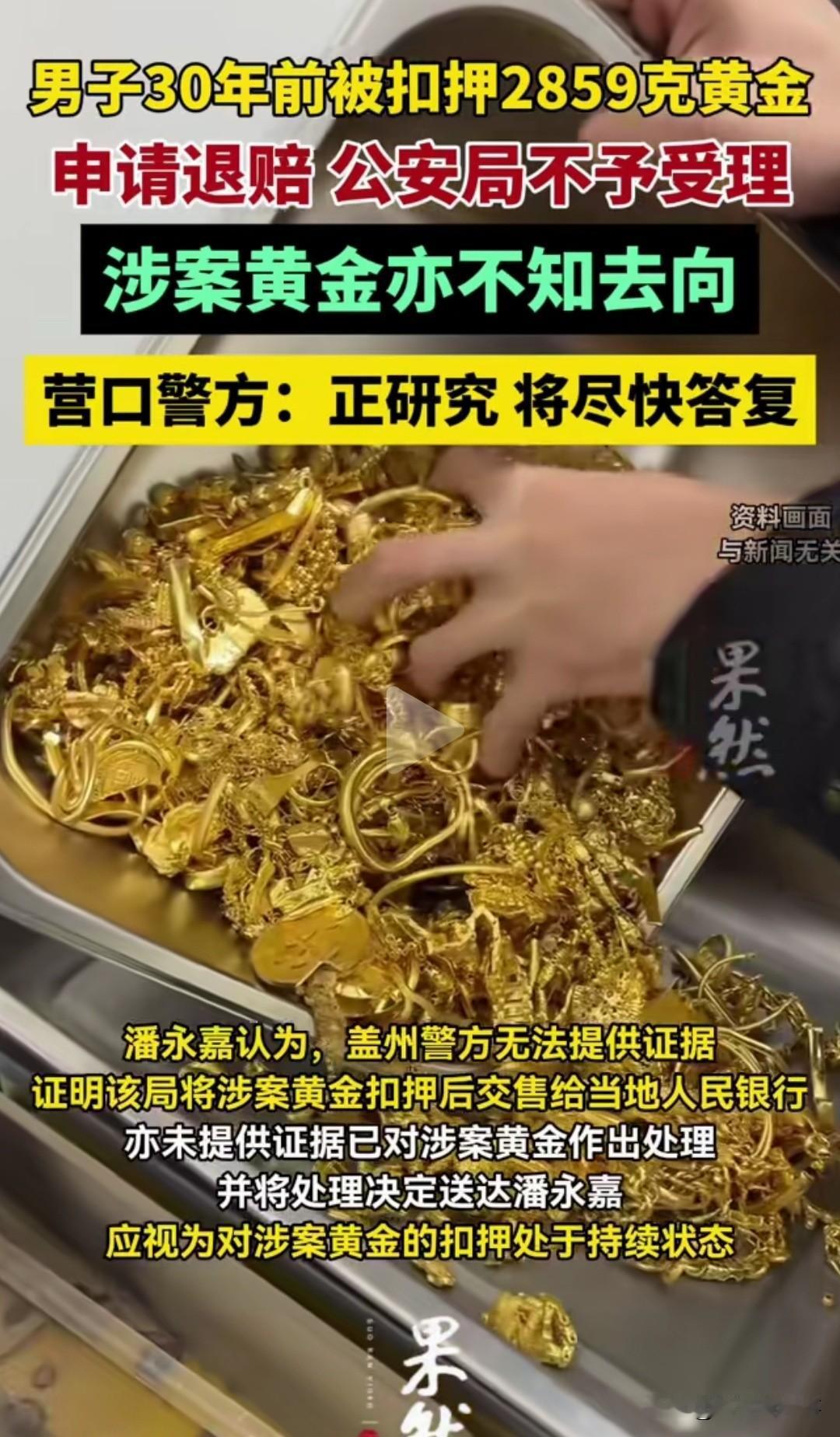 辽宁大连的潘永嘉,遇上了这辈子最憋屈的事。 2859克黄金被扣30年,警方竟说超时效不还。 30年案件没结论,黄金也没了下落 1996年,潘永嘉在大连周水子机场被盖州警方带走。 他随身的2859.2克黄金被当场扣押,警方出具了正式扣押清单。 妻子交了5万保证金后他取保候审,可这一等就是整整30年。 30年间,警方没给任何撤案、结案文书,案件状态至今成谜 。 当年80元一克的黄金,如今涨到1038元一克,总价近300万。 警方称黄金已移交银行,银行却说洪水冲毁档案,无从查证 。 2026年他申请国家赔偿,警方直接以超时效为由不予受理。 扣了财物不结案,凭什么算赔偿时效已过? 执法要有始有终,一笔糊涂账不能让老百姓买单。 你觉得这笔黄金,该不该按现价赔偿给当事人? 社会热点 黄金被扣30年维权事件 民生关注