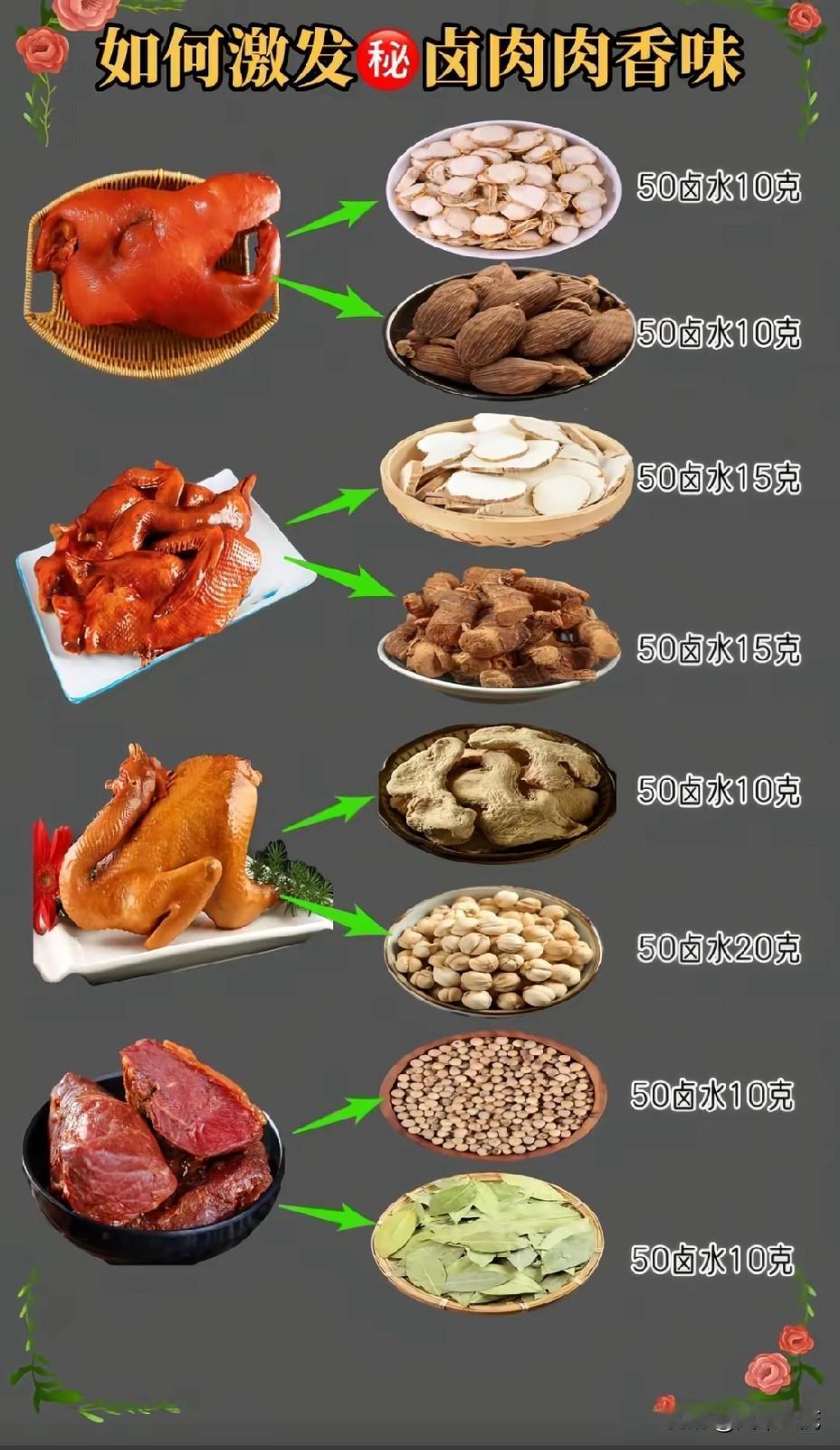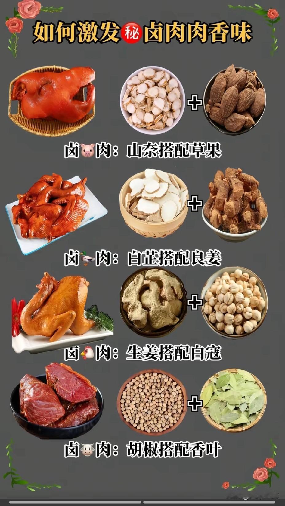 卤菜用的增香料怎么用? 卤菜增香料的使用秘籍,让你秒变卤菜大神! 你是否有过这样的经历,满心欢喜地准备做卤菜,结果卤出来的味道却差强人意,要么腥味重,要么香味寡淡。其实,卤菜好吃的核心全在增香料的搭配。今天就来给大家分享卤菜增香料的使用方法和经典配方,让你轻松做出香透骨髓的卤菜。 增香料的分类与作用 卤菜用的增香料按功效可分为几大类。去腥除膻型香料是卤味基础,能去除肉类腥膻异味,净化食材本味,像白芷、草果、砂仁、花椒就属于这类。增香提味型香料是卤味香味的核心,能提升卤汁香气,让香味更醇厚有层次,八角、桂皮、小茴香、香叶就是典型代表。上色增色型香料能让卤菜色泽红亮诱人,提升食欲,黄栀子、红曲米、紫草就有这样的功效。中和调味型香料则能平衡香料苦涩味,缓解辛辣,让卤味口感更柔和,比如甘草、陈皮、罗汉果。 经典特色风味的配料配方 五香卤味配方 这是一款经典且百搭的配方。准备八角 8 克、桂皮 6 克、小茴香 5 克、香叶 3 片、草果 2 个、白芷 5 克、甘草 3 克、陈皮 5 克。将这些香料用纱布包好,放入卤锅中。这种配方卤出来的菜品具有浓郁醇厚的五香味,适合卤制各种肉类、蛋类和豆制品。像卤鸡腿,肉质鲜嫩且充满五香的醇厚香气,让人回味无穷。 麻辣卤味配方 喜欢吃辣的朋友可别错过。取八角 6 克、桂皮 5 克、香叶 2 片、草果 1 个、小茴香 4 克、花椒 10 克、干辣椒 15 克、罗汉果 1 个。罗汉果能中和辣味,让口感更丰富。用这个配方卤制的鸭货,麻辣鲜香,啃起来超过瘾,是追剧、聚会的绝佳小吃。 清香卤味配方 如果你想尝试不一样的风味,清香卤味值得一试。准备香茅草 5 克、砂仁 3 克、排草 3 克、白豆蔻 3 克。香茅草带来柠檬果香,让卤味清新不油腻。用这个配方卤制素菜,如莲藕、海带,清爽可口,别有一番风味。 增香料的使用技巧 香料用量要根据食材多少来调整,一般 1000 克食材搭配 20 - 30 克香料。香料使用前可以用温水浸泡 15 - 20 分钟,这样能让香味更好地释放。卤制过程中,先用大火煮开,再转小火慢炖,让香料的味道充分融入食材。 掌握了这些增香料的使用方法和经典配方,你也能成为卤菜高手,做出性价比超高、味道独特的卤菜,让家人朋友赞不绝口。快来试试吧! 香料配比秘诀 卤三味卤味技术