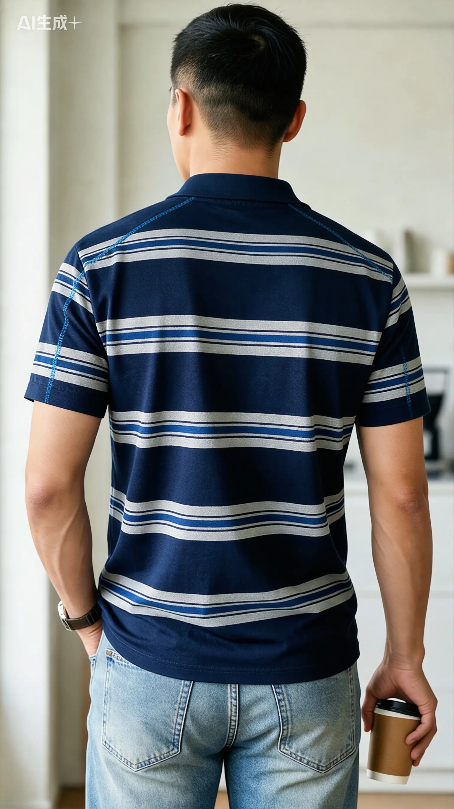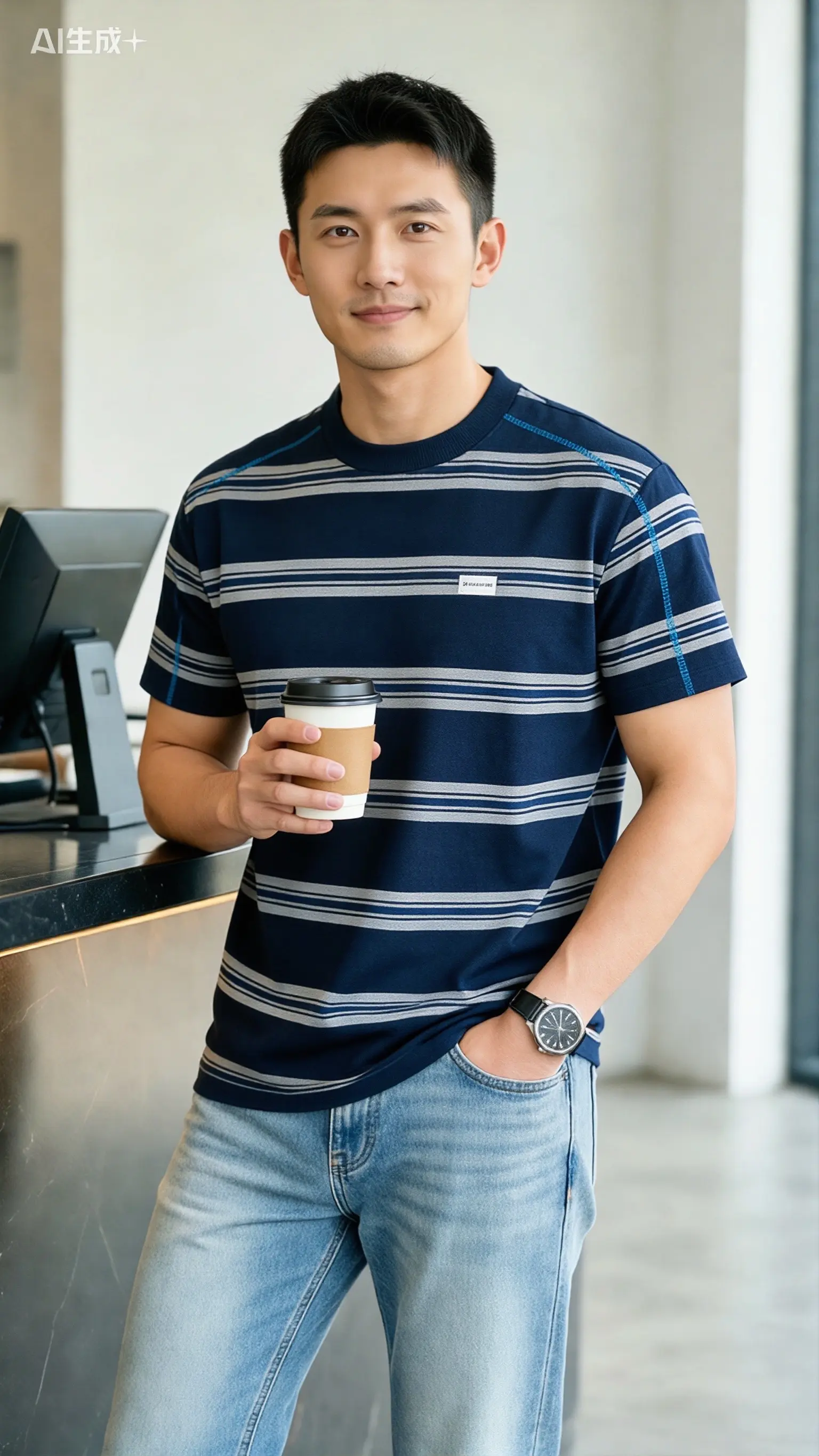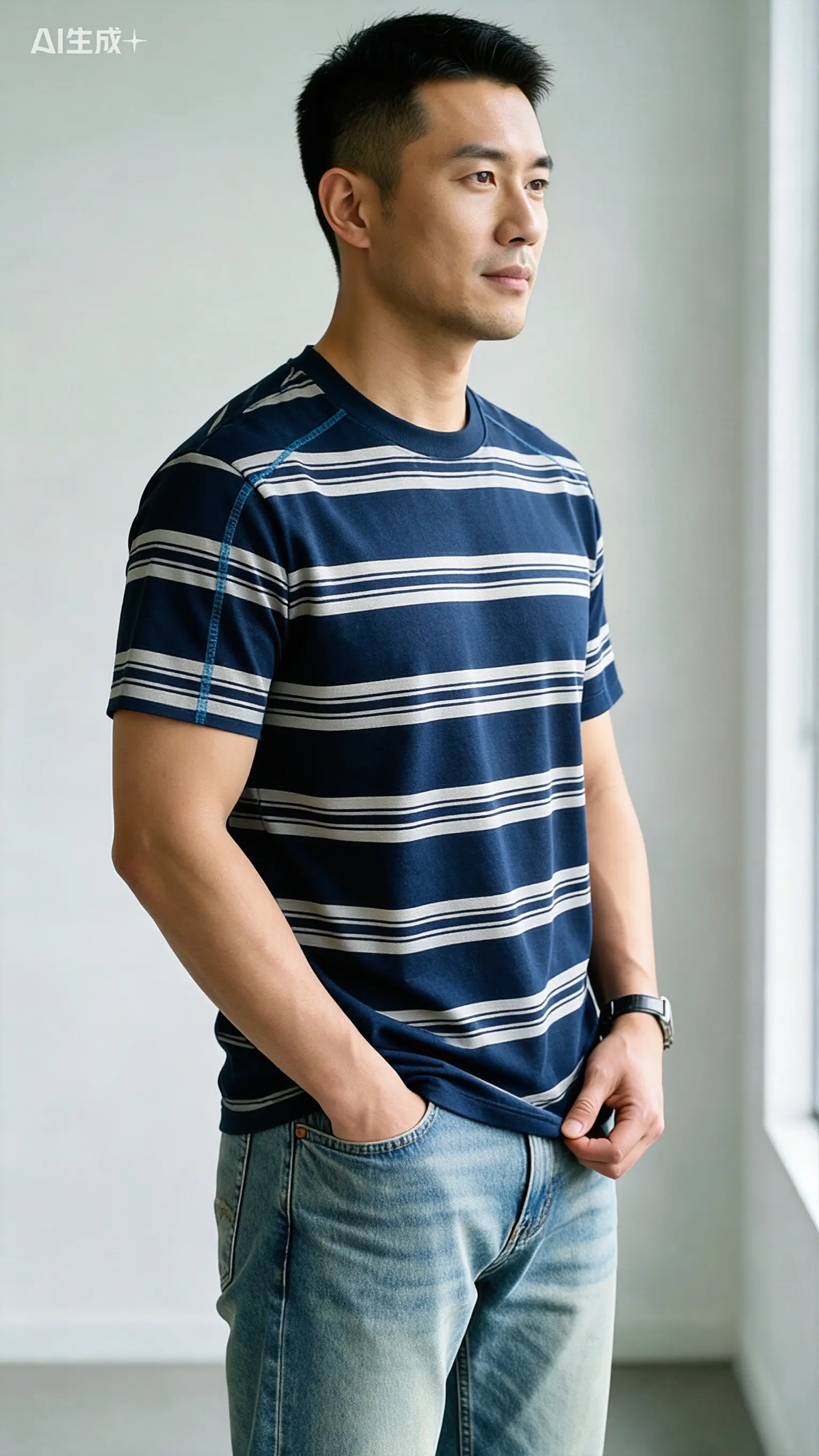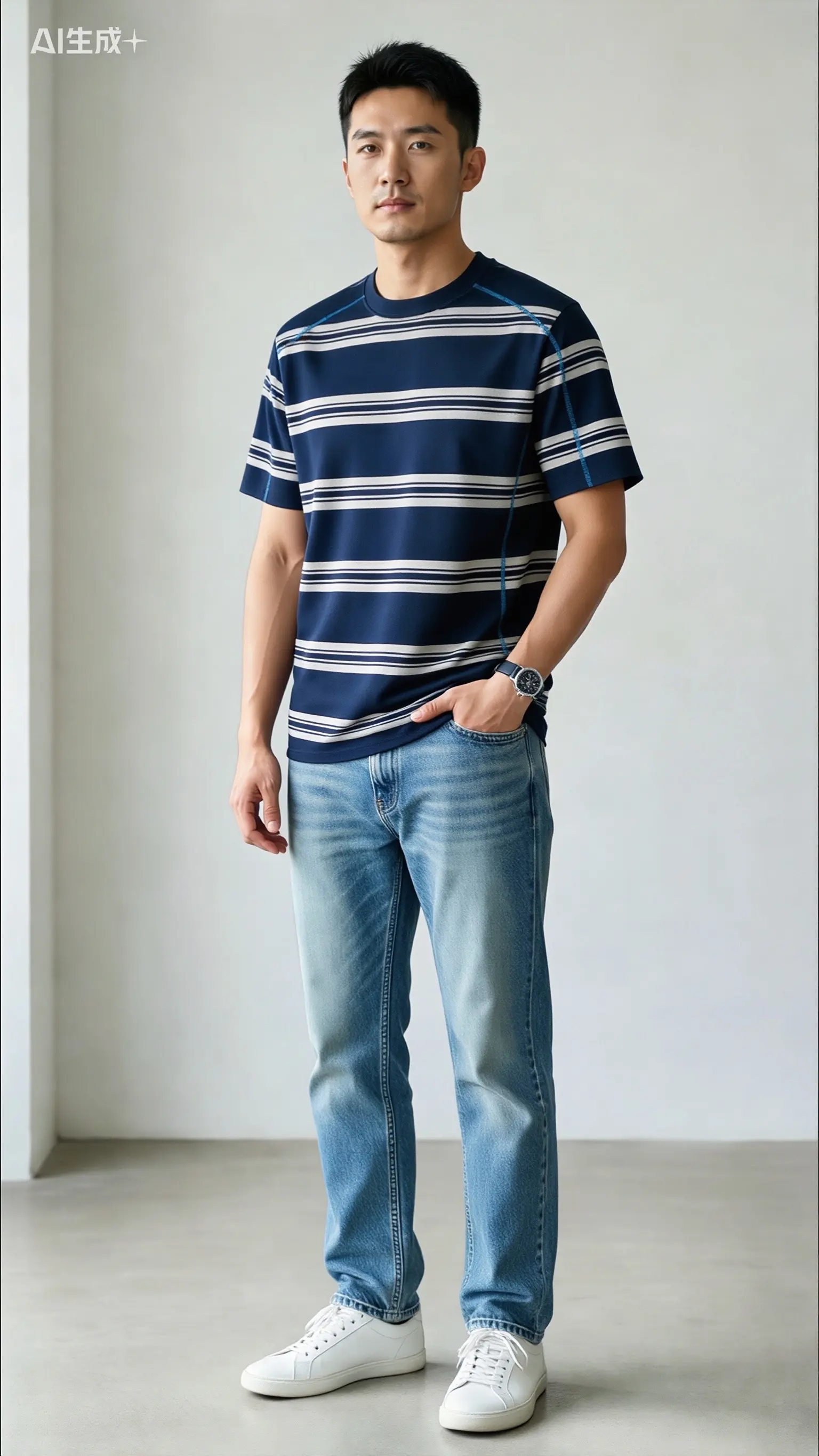 男生夏天不知道怎么穿,这件藏青条纹短袖闭眼入