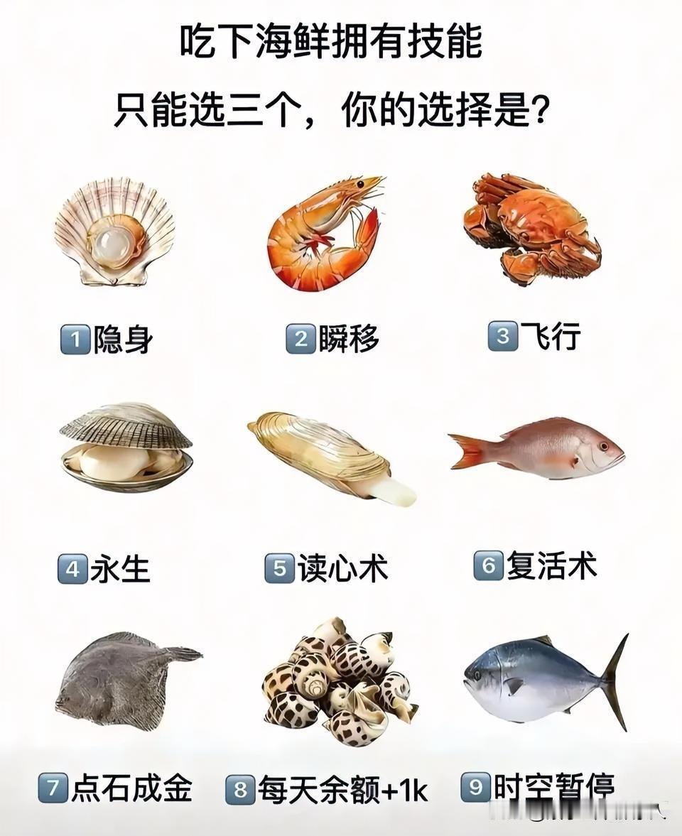 如果吃海鲜可以拥有一个技能,你愿意吃哪样海鲜?只能选三个,我先来,我要吃6.8.9。