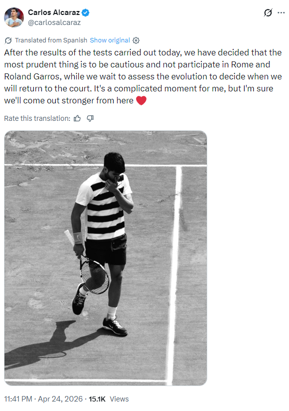 日前,阿尔卡拉斯宣布了自己因伤退出今年罗马大师赛和法网的决定,正在马德里站参赛的辛纳对好友伤病和退赛十分遗憾。