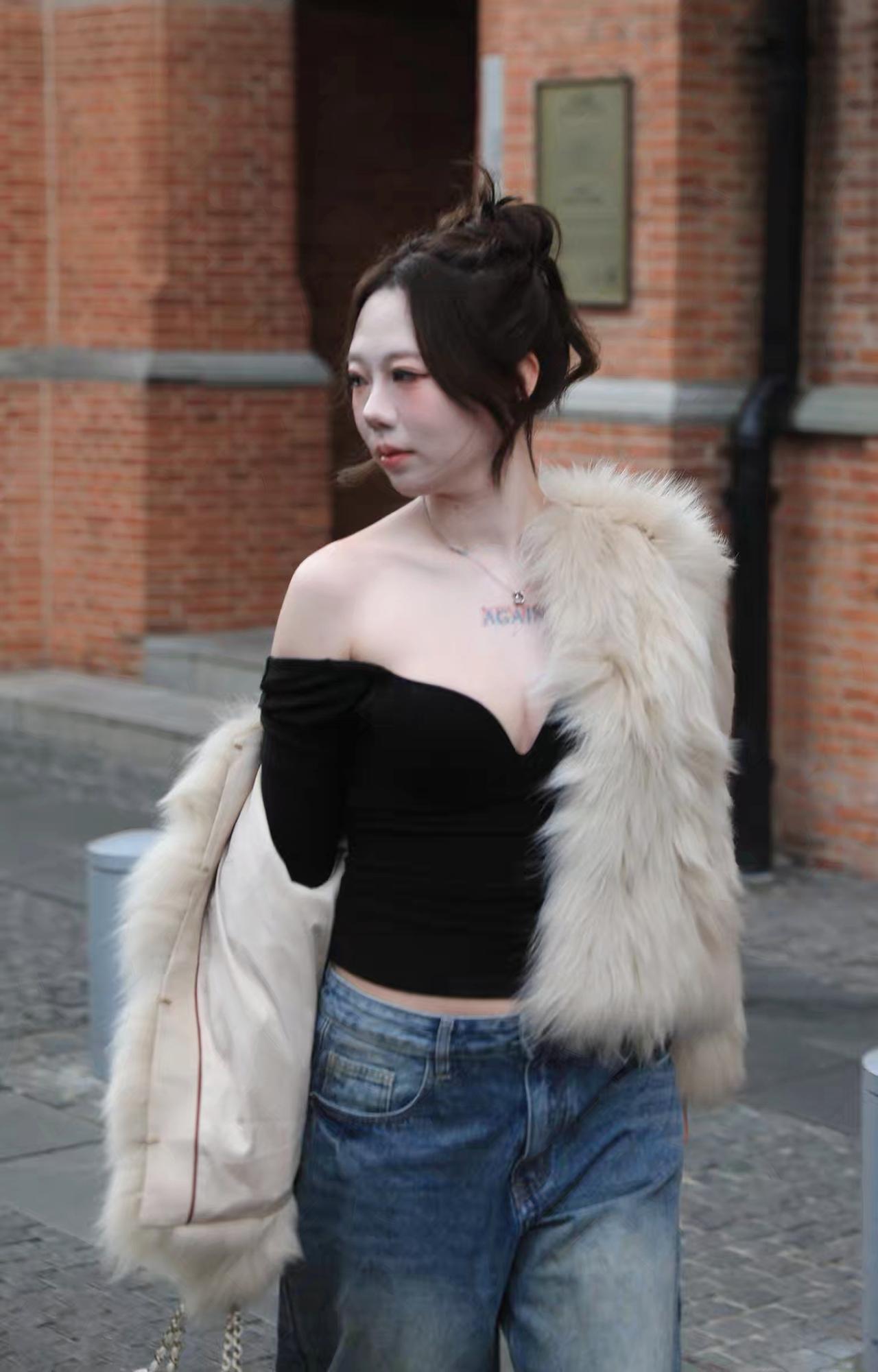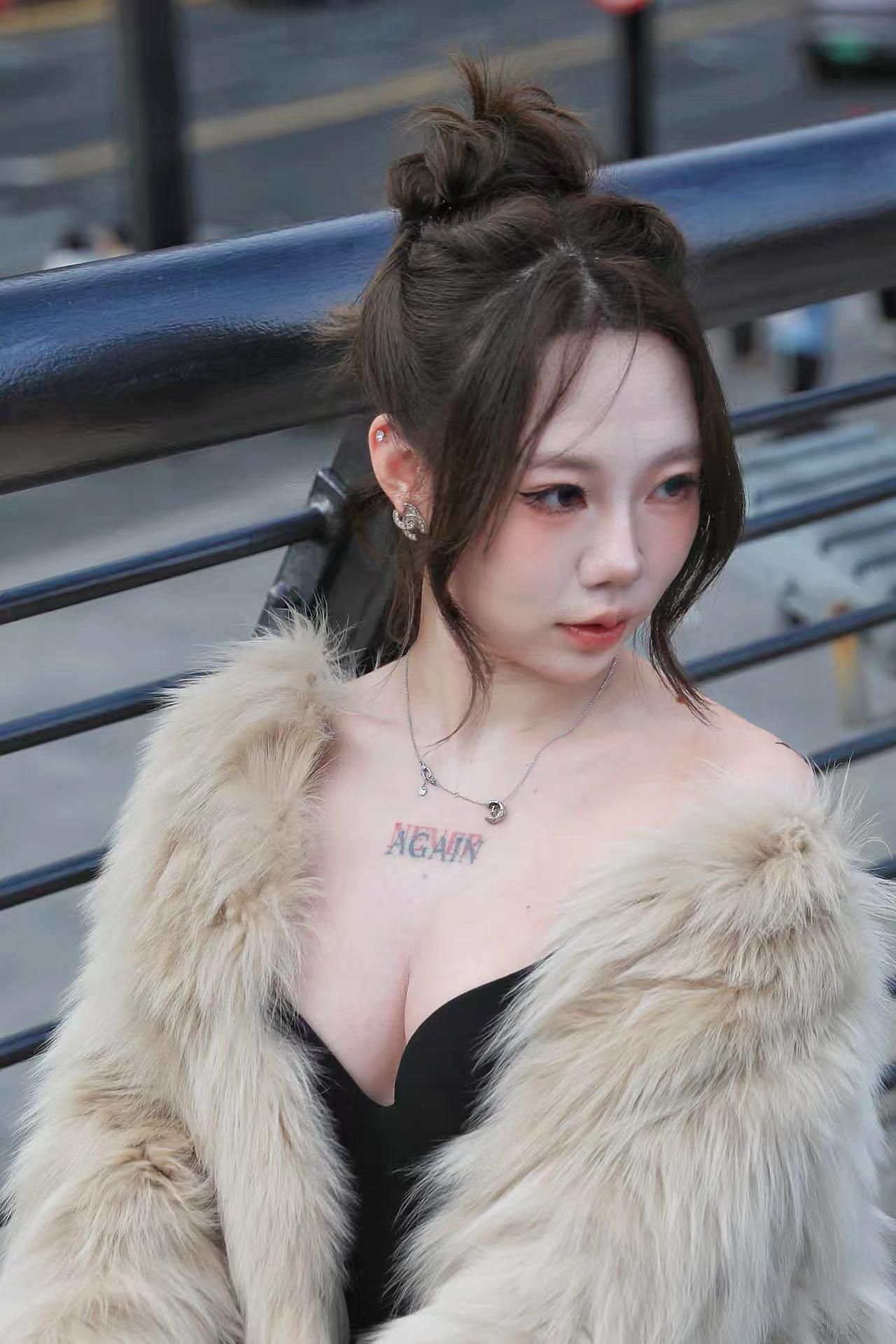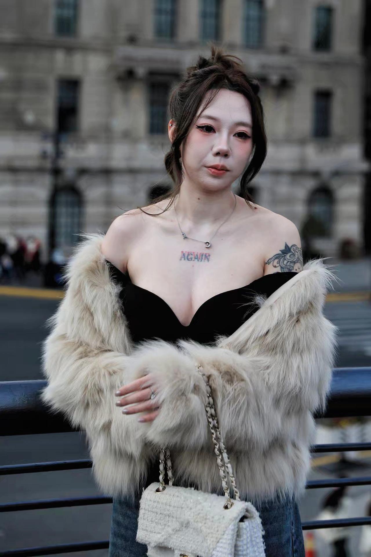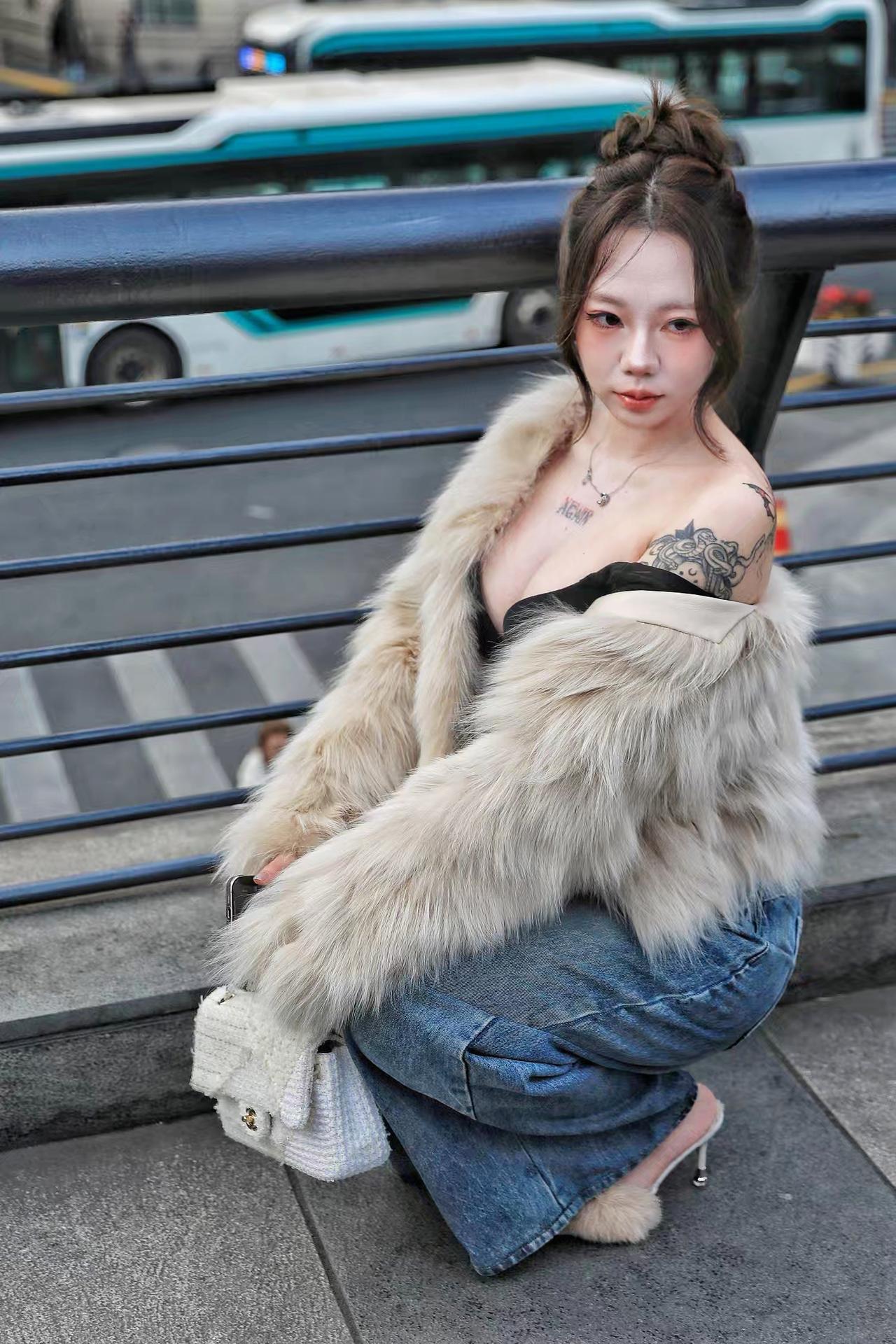 绒暖外滩 外滩的风裹着都市的气息掠过肩头,她立于栏杆边,一身米白色毛绒外套蓬松柔软,衬得黑色抹胸愈发利落。宽松的牛仔长裤垂落,搭配同色系链条包,松弛又贵气。高盘的发髻利落清爽,颈间的细链与胸前纹身,为这份温柔添上几分不羁。