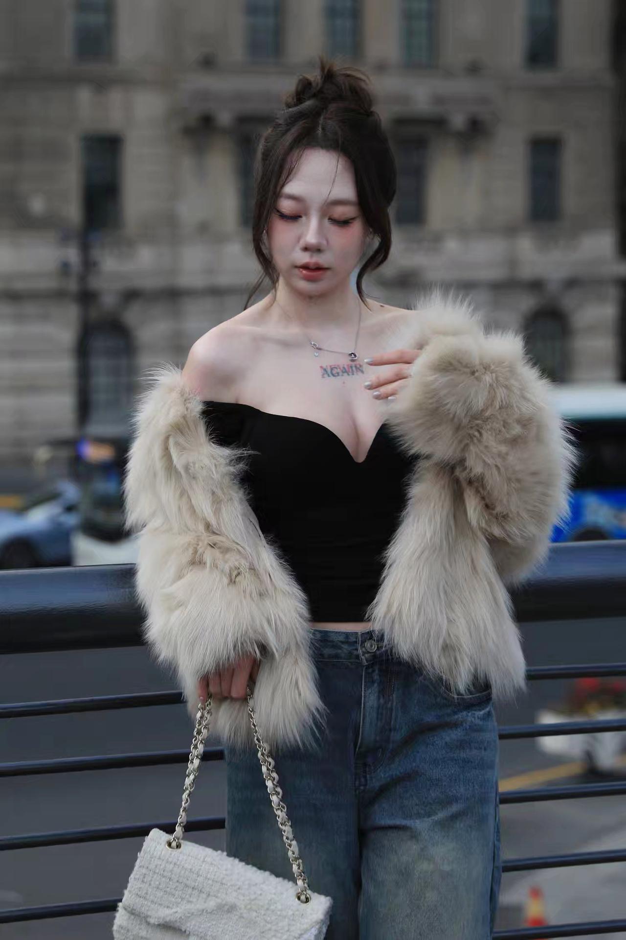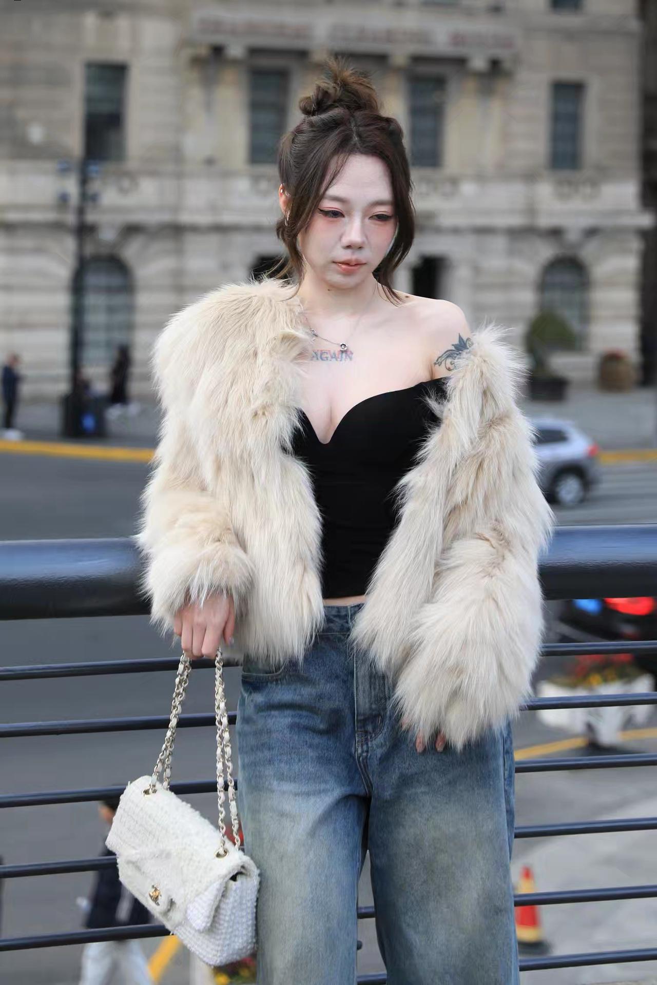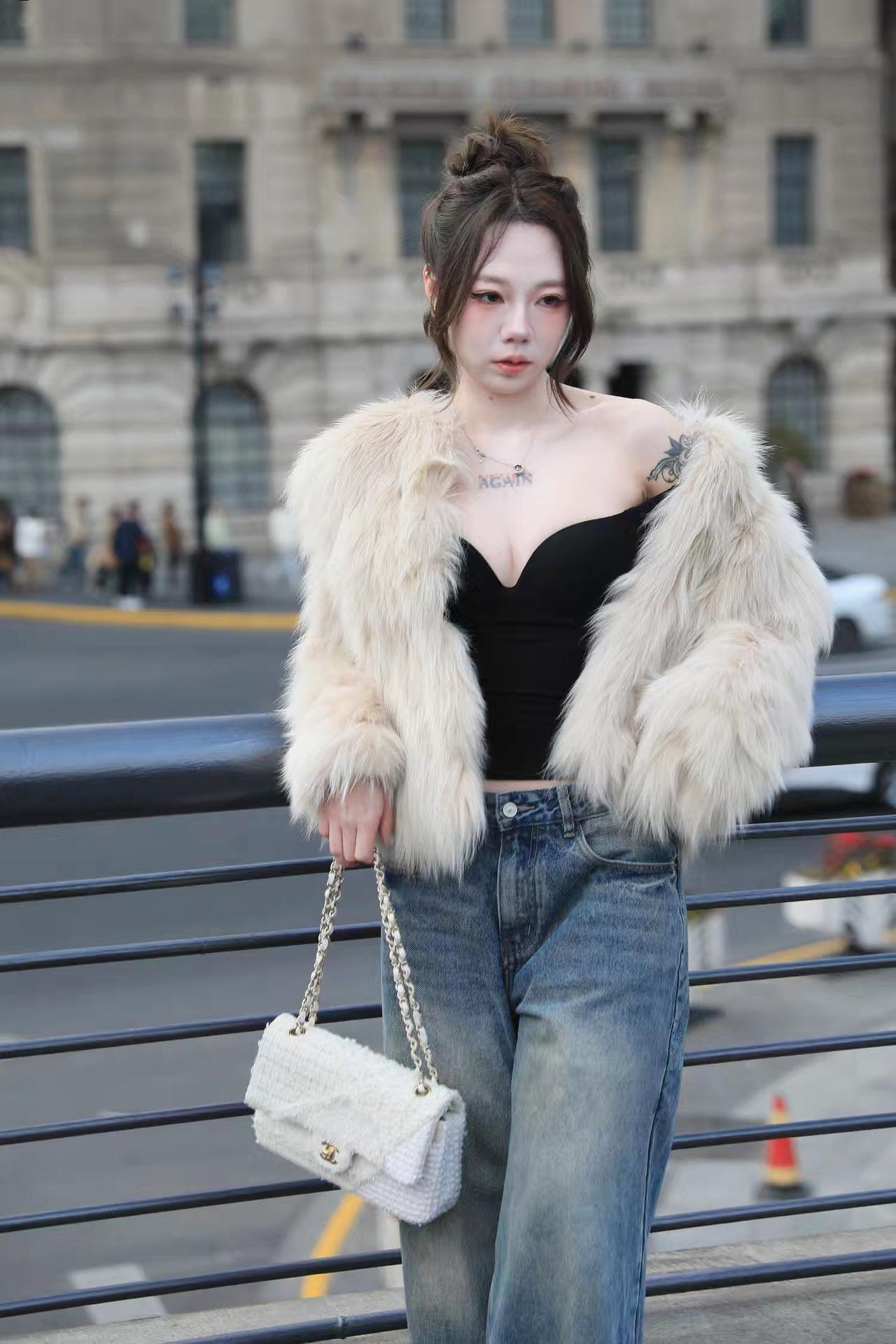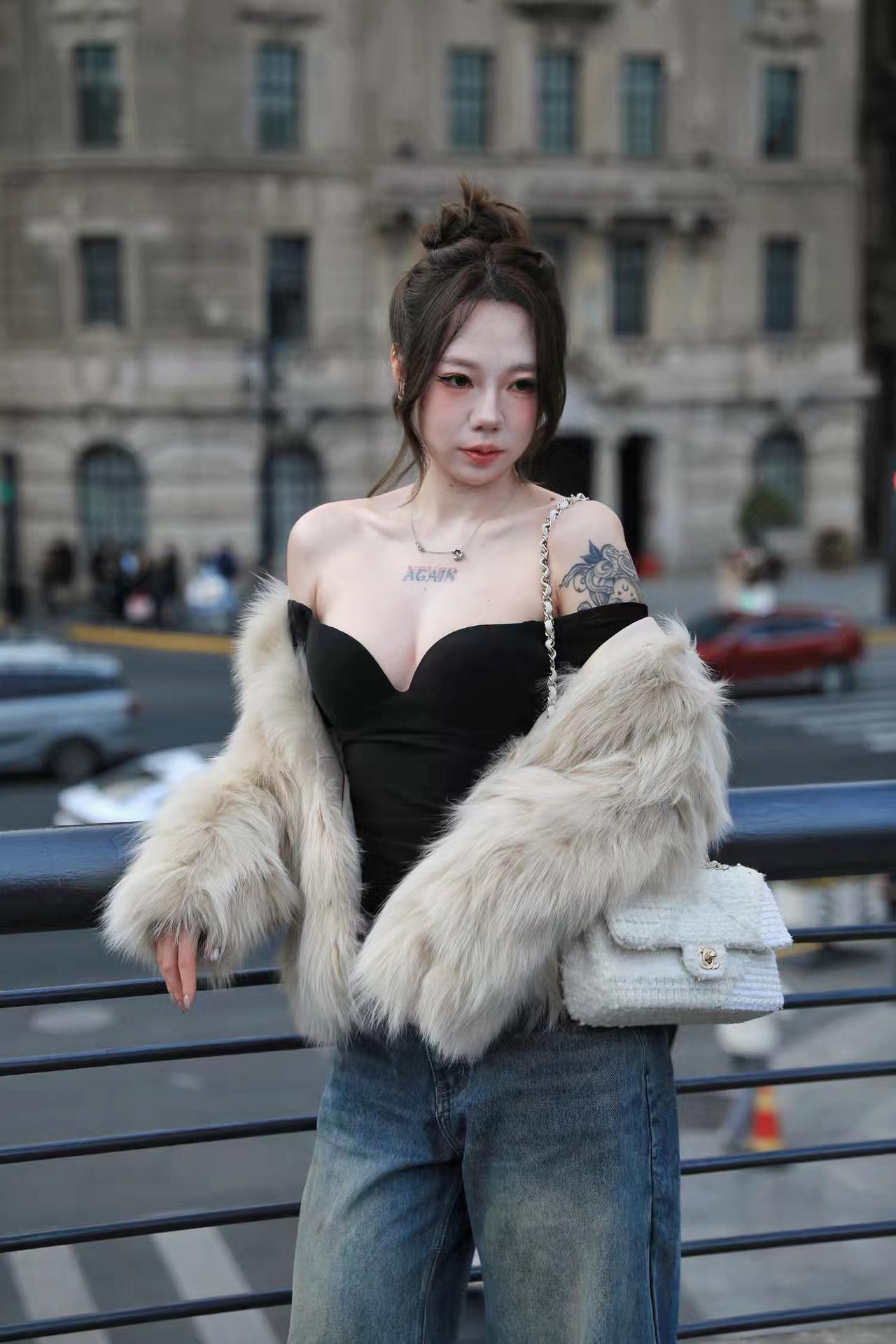 绒暖外滩 外滩的风裹着都市的气息掠过肩头,她立于栏杆边,一身米白色毛绒外套蓬松柔软,衬得黑色抹胸愈发利落。宽松的牛仔长裤垂落,搭配同色系链条包,松弛又贵气。高盘的发髻利落清爽,颈间的细链与胸前纹身,为这份温柔添上几分不羁。