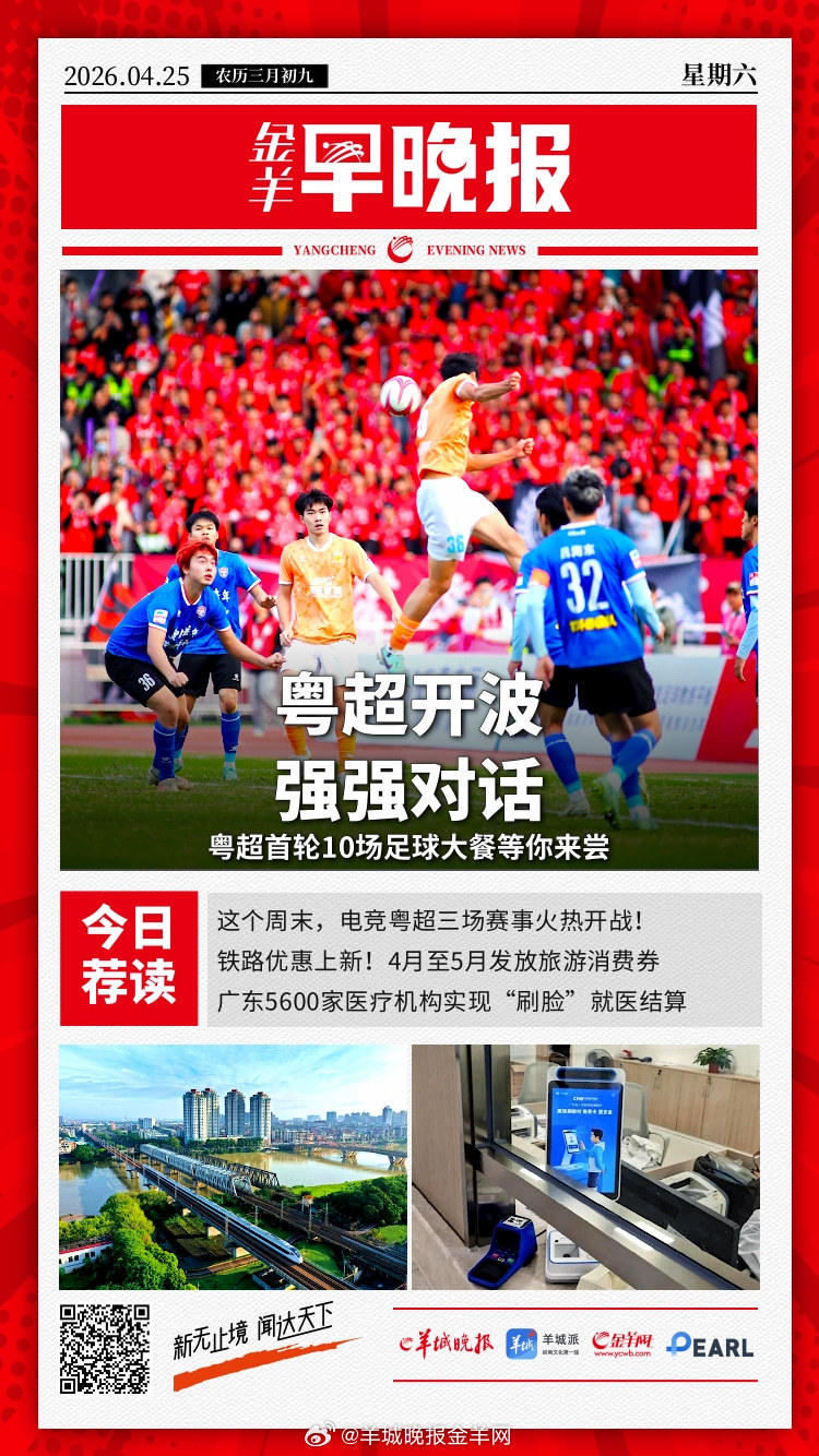 #金羊早晚报# 铁路优惠上新!4月至5月发放旅游消费券,试行“自行车随身行”服务;潮汕德比、两场强强对话!粤超首轮,10场足球大餐等你来尝;这个周末,电竞粤超广州站、清远站、惠州站火热开战!我国成功发射卫星互联网技术试验卫星;“0糖”是商标,东鹏特饮被骂冤不冤?如何辨别“心机商标”?宠物消费市场规模突破3100亿元,线上线下齐增长;多名中国公民被诱骗前往泰缅边境,我使馆发布安全提醒;“猪猪侠”IP维权案宣判!被告获刑一年并处罚金11万元;5600家医疗机构实现“刷脸”就医结算,广东医保“四支付”破解就医缴费痛点;“五一”堵怕了?广东高速将在重点路段19处点位开“三潮汐”;正式获批!华师石牌校园将改造升级;财政部:一季度全国财政收入增幅创3年来同期新高;今年首批超长期特别国债启动发行;五一档新片票房破1000万元,潮汕方言电影《给阿嬷的情书》居第一;陈茂贤执导电影版《燕食记》,许冠文黄子华有望再合作;特朗普欲与伊朗达成永久核协议,强调“已大赢特赢”:有时间、没压力、不着急;美国华盛顿一巴士爆炸,国会大厦上空黑烟弥漫!#以色列防长威胁将伊朗打回石器时期##看完孙杨直接内伤失眠了##浪姐 赢了被淘汰# 更多精彩报道,请扫码关注羊晚全媒体报道!