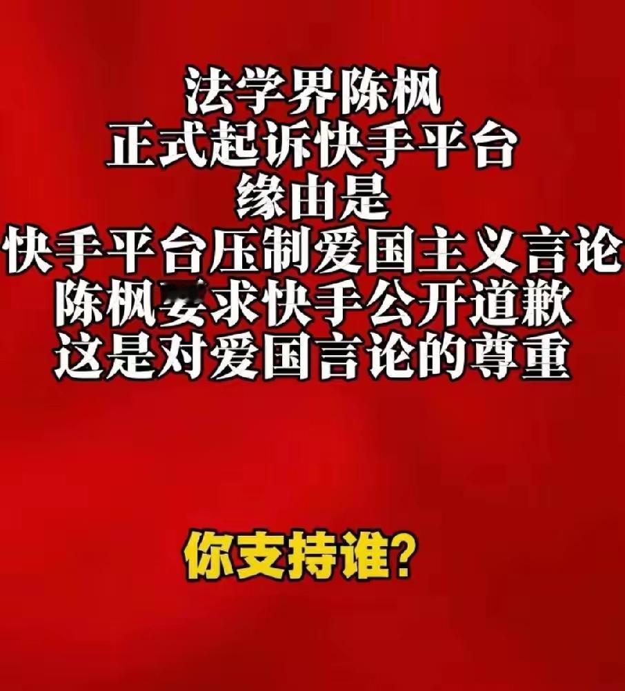 陈枫起诉快手压制爱国主义言论! 你们有没有发现,当你写爱国主义言论的时候,经常会被限流,或者说你作品违规,无法正常分享,你去找客服理论,客服也无法解决。多次理论后,连后台的客服人工按钮都会消失。 而那些明明是诋毁祖国的言论,反而能获得非常大的流量,广为传播推送。 相信不少经常在快手发布内容的网友,都有过类似的憋屈经历,明明是发自内心抒发爱国情怀、分享正能量爱国观点,却莫名被判定违规,要么作品流量被狠狠限制,要么直接无法发布、不能转发,满心的爱国热情就这样被泼了冷水。 法学界人士陈枫正是因为无法容忍这种不合理的现象,才在2026年4月正式站出来,下定决心通过法律途径起诉快手平台,想要为广大爱国内容创作者讨一个公道,也想彻底厘清平台内容审核的双重标准问题。 他在维权过程中反复尝试和平台沟通,可得到的回应始终含糊不清,人工客服渠道甚至在多次反馈后直接关闭,根本不给用户正常申诉的机会,这种敷衍的处理方式,也让更多网友感同身受,觉得自己的合法发声权利被忽视。 大家心里都很清楚,爱国本是每个公民最朴素的情感,在网络平台分享爱国言论,既不违反法律法规,也不违背公序良俗,本该得到平台的正常对待,不该遭遇莫名的限流和违规处罚。 可现实却恰恰相反,不少刻意抹黑、诋毁祖国的不良言论,却能躲过平台审核,靠着博眼球的内容获得大量推荐和流量,被更多人看到,这种明显的审核偏差,不仅寒了爱国网友的心,也扰乱了正常的网络舆论环境。 陈枫之所以敢站出来发起诉讼,不是为了个人私利,而是看不惯平台这种不合理的内容管控逻辑,他觉得网络平台理应承担起社会责任,主动守护正能量、抵制不良言论,而不是反过来压制正当的爱国发声。 他也公开表示,如果此次起诉和维权得不到合理的解决,后续还会前往北京,通过正规合法的途径继续反映问题,坚决要把这件事追究到底,不让爱国言论在网络平台上遭遇不公对待。 其实这也不是快手平台第一次被曝出内容审核相关问题,此前平台就曾因为未履行网络安全保护义务,没能及时处置低俗违法信息,在2026年2月被北京市网信办依法处以超1亿元的罚款,还被责令限期整改。 这足以说明平台在内容审核、算法推荐、用户管理上,一直存在明显的漏洞和不足,而爱国言论被压制、不良言论被纵容,更是把平台的审核漏洞放大,让大家看到了平台内容管控的失职。 作为受众基数庞大的短视频平台,快手掌握着巨大的流量话语权,更应该坚守正确的价值导向,公平公正地审核每一条内容,既要严厉打击诋毁国家、违背公序良俗的不良言论,也要全力保护正常的爱国发声,给正能量内容足够的传播空间。 不能为了所谓的流量利益,放任不良内容肆意传播,更不能无故打压充满正能量的爱国言论,辜负广大用户的信任。 这件事也给所有网络平台敲响了警钟,流量面前更要守住底线,社会责任永远不能抛之脑后,只有做到审核标准统一、对待内容一视同仁,才能营造健康清朗的网络空间。 各位读者你们怎么看?欢迎在评论区讨论。