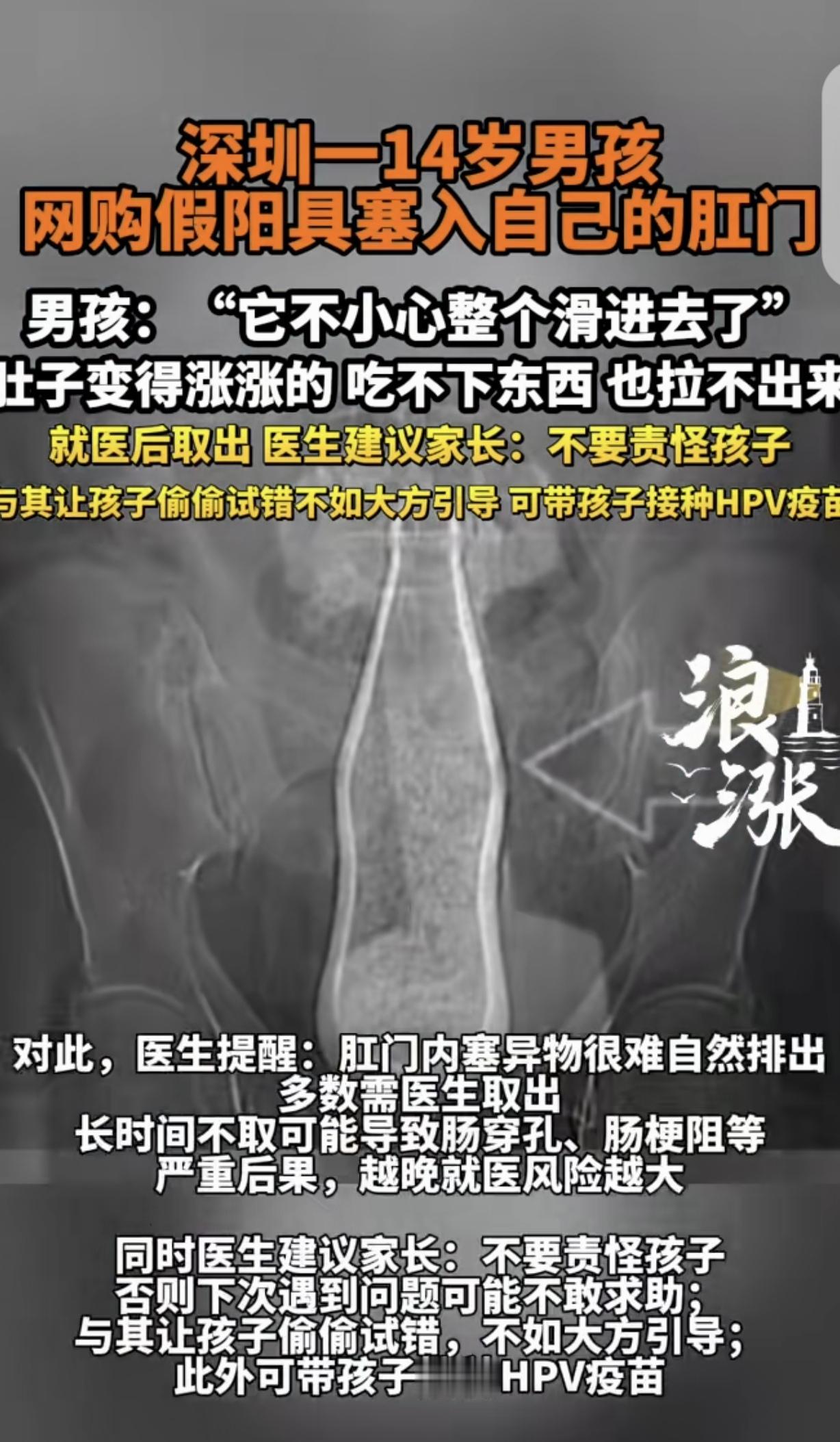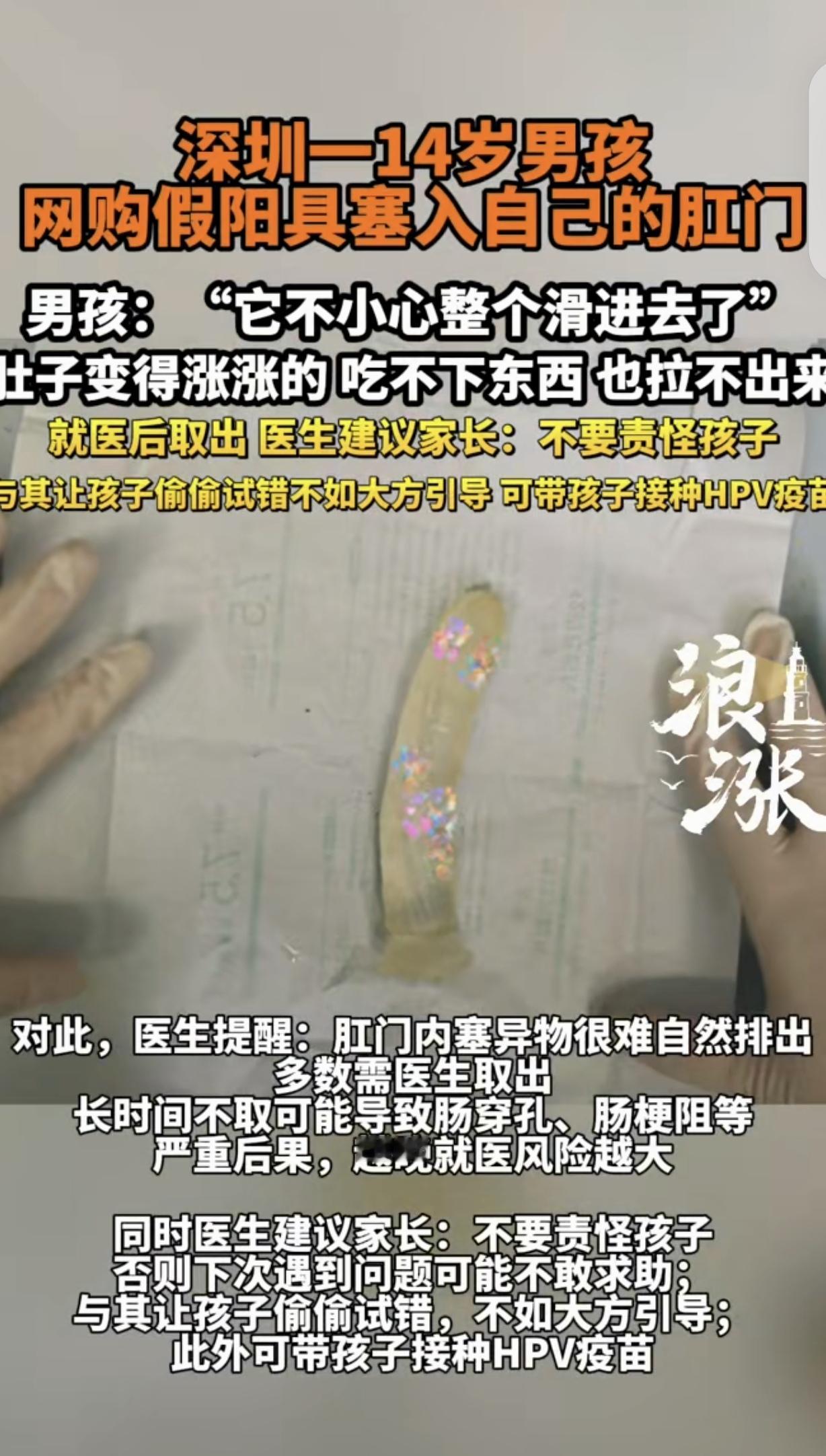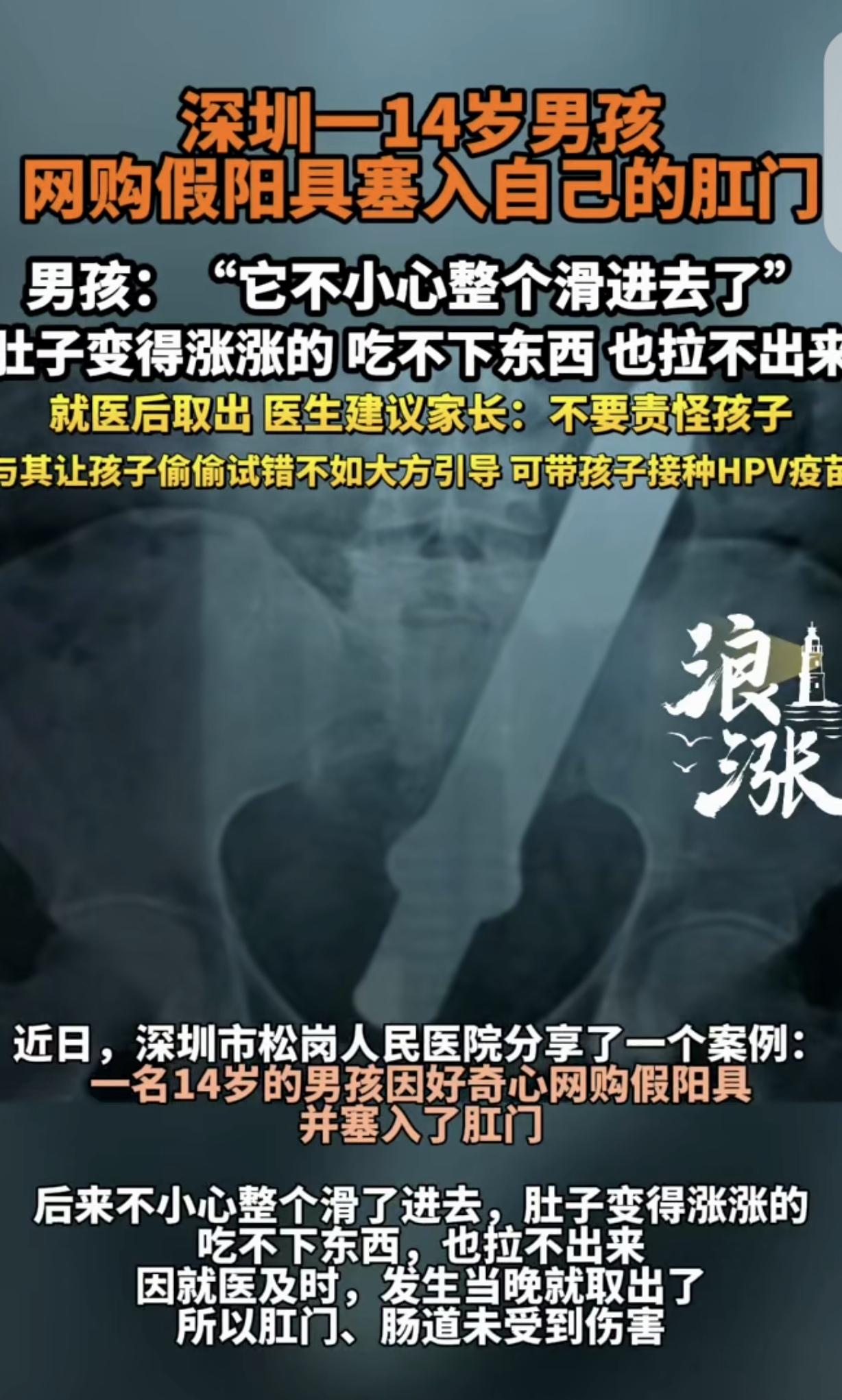 “悲剧了!”广东深圳,一14岁男孩好奇,网购“假阳具”塞入肛门,肚子涨的吃不下,也拉不出来。医生让男孩父母给孩子打HPV疫苗,但别骂孩子,让他偷偷试错,不如光明正大的引导。男孩崩溃:它不小心整个滑进去了。 一14岁青春期男孩,因为身心发育产生强烈好奇心。 他对自己身体变化、各类新奇私密物品都充满了莫名的探索欲望。 因为羞于启齿,平时也没有和父母说,父母还把他当小孩子,也没主动沟通这方面的事,更谈不给他普及正确的生理健康知识。 男孩一时头脑冲动,竟瞒着家里所有人,偷偷网购了一款成人私密用品。 他没有告诉父母,自己买,自己签收,打算私下里满足自己的好奇心,随意尝试把玩。 可万万没想到,悲剧就这么发生了,他直接把那东西塞进了肛门。他根本没想到,整件物品根本不受他控制,完完整整滑进了身体里。 男孩当场就慌了神,心里又害怕又慌张,根本不敢告诉父母,只能自己硬扛着,心里的焦虑和惶恐无以复加。 男孩以为,他会把那东西拉出来,可没过多久,男孩就不对劲了,肚子涨的不行,肠胃也不舒服,吃不下,也拉不出来。 男孩越来越难受,整个人状态越来越差。硬撑了一段时间后,实在扛不住了,也害怕出大问题,要了他的命。 所以男孩硬着头皮,鼓起勇气把事情告诉了自己父母。 父母又生气又心疼,顾不上责备孩子,第一时间赶紧带着他往医院跑。 医生检查了男孩的身体情况,确认异物滞留体内的位置,顺利取了出来。 整个过程,没有给孩子造成创伤,规避了肠道破损、感染发炎等一系列问题。 处理完后,医生专门单独和男孩家长沟通,联系给孩子打HPV疫苗。 同时,医生嘱咐孩子父母,别骂他,青春期的孩子都有好奇心,试错避免不了,打骂会伤害孩子自尊心强,让他自卑、叛逆。 孩子只是懵懂无知、单纯好奇犯错,并不是故意做错事,不如大方引导。 我将用通俗口语完成事件评论,再搭配对应法条与精准分析,严格控制整体350字左右,贴合大众视角、客观公正。 青春期孩子对身体产生好奇,是非常正常的生理心理现象,这个男孩的错误本质是无知,并非品行问题。 很多家长总觉得孩子小,刻意回避那方面的教育,导致孩子无法通过正规渠道获取知识,只能私下盲目探索,很容易造成身体伤害。 家长切忌打骂指责,只会让孩子封闭内心、畏惧沟通。 家长和学校都应该放下避讳,主动科普生理健康、自我保护知识,正视孩子的青春期需求,正向引导才能避免孩子盲目试错、发生危险。 《未成年人保护法》第40条规定,学校需开展适龄性教育,家庭也承担未成年人身心健康教育义务。 家长缺失青春期生理健康教育,没能履行家庭监护教育职责,导致孩子因认知匮乏受伤。 未成年人身心教育不是私事,是法定责任。 对此,你怎么看?