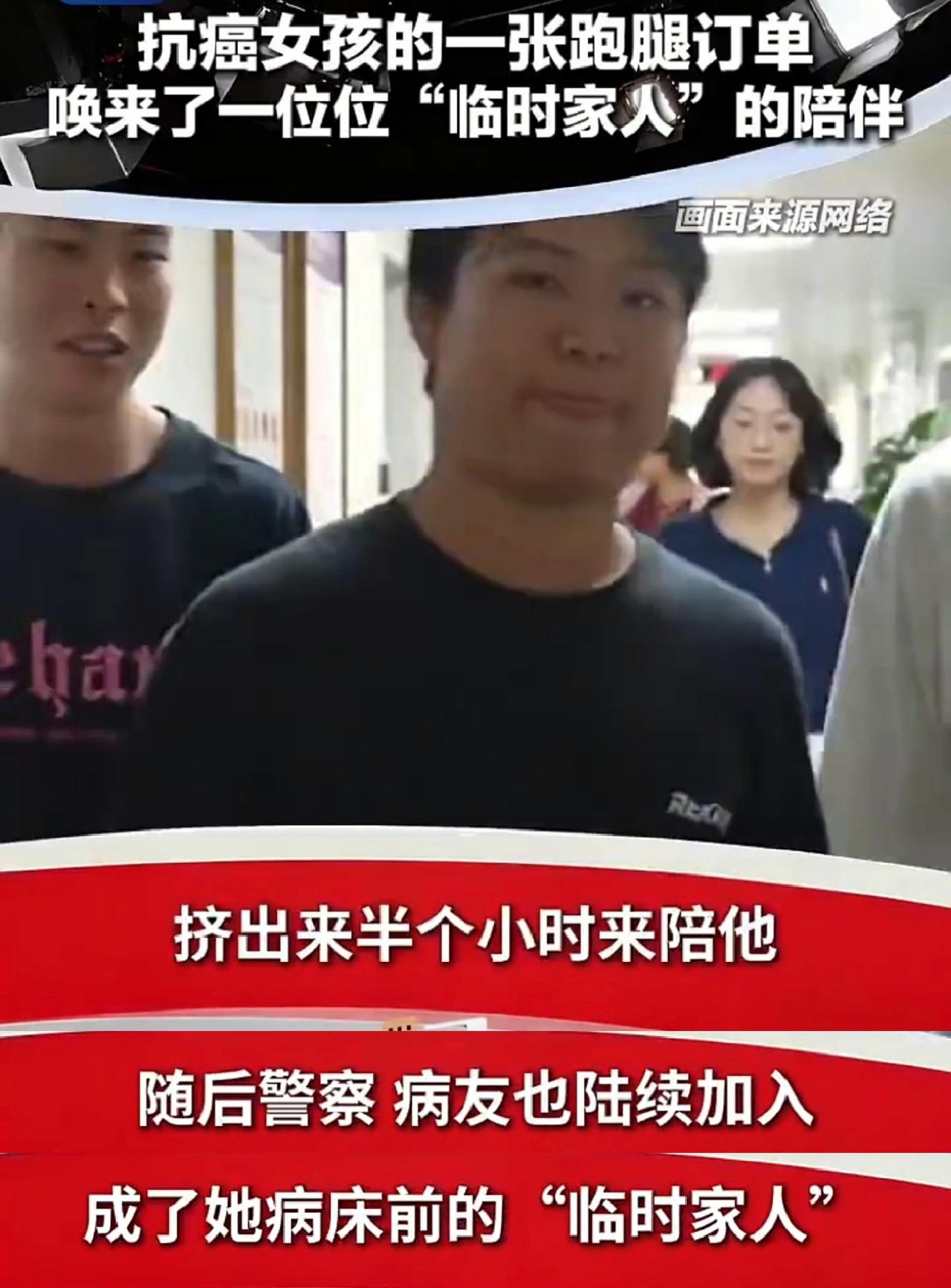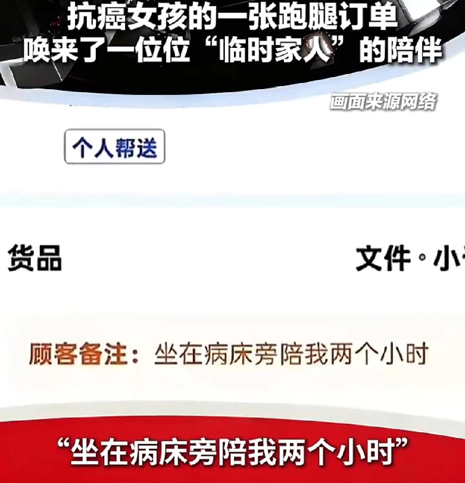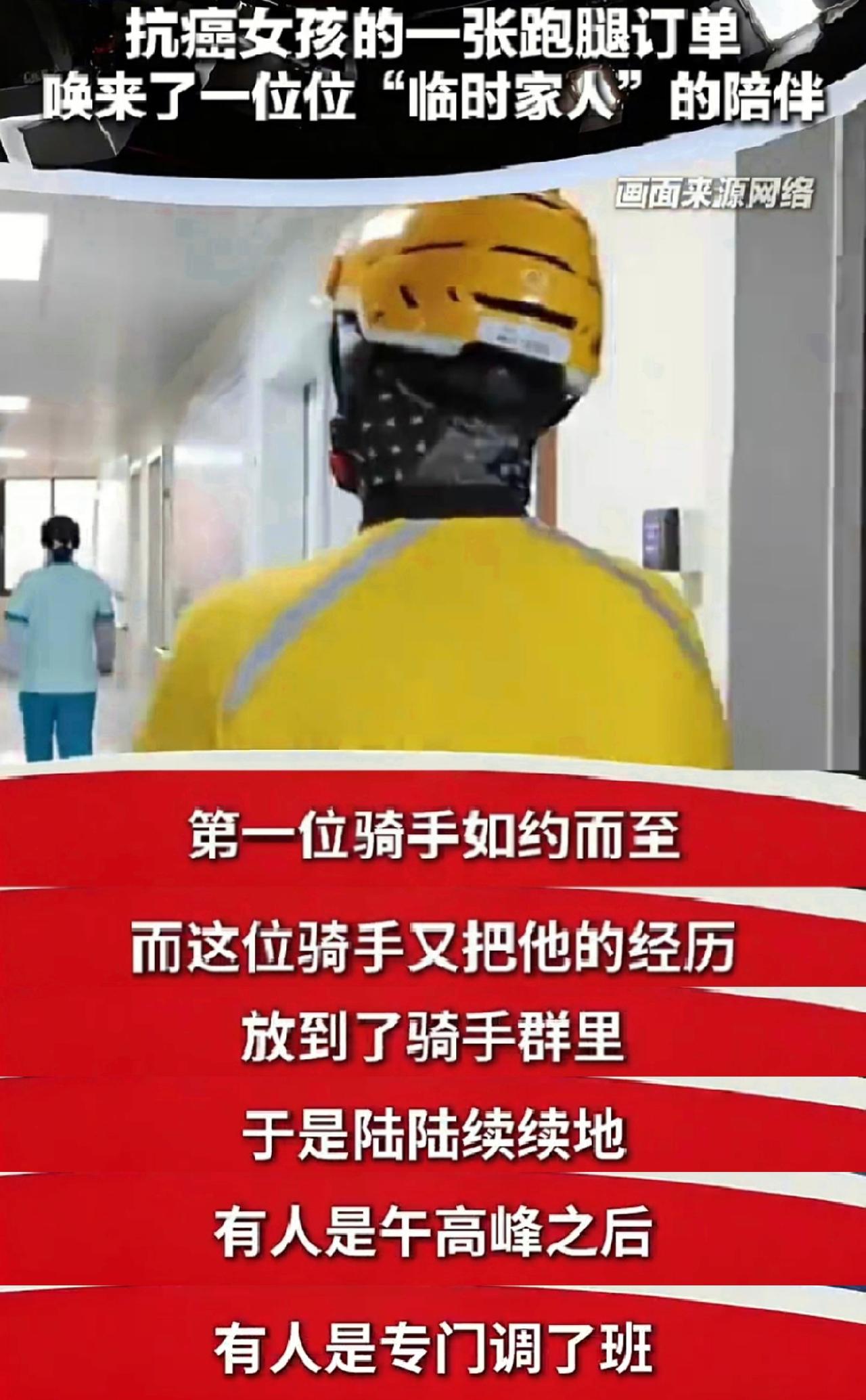 陌生人的善意照亮至暗时刻【24岁抗癌女孩一个订单看泪崩[心]你愿为这场接力点赞吗?】日前,广东佛山,独自住院的24岁抗癌女孩小黎,通过外卖APP下了一个跑腿订单,备注“坐在病床旁陪我两个小时”。不久后,第一位骑手如约而至,还带来了鲜花和水果。倾听两小时后,小哥征得女孩同意,将她的情况发进了骑手群。 于是,一场温暖的接力开始了……许多骑手自发赶来,民警、病友等也陆续到来,陪她说话、为她打气,成了她的“临时家人”。 目前,小黎已经出院。虽然还要继续接受治疗,但她说很温暖,陌生人的善意给了她战胜病魔的勇气。祝福!加油! (中国之声)