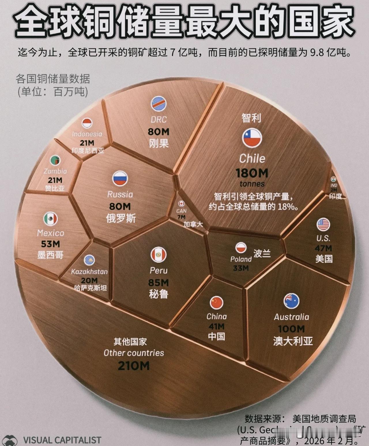铜,这枚“工业心脏”的全球版图,藏着未来十年的大国博弈密码! 当我们讨论石油、芯片的时候,往往忽略了一种贯穿人类文明始终,如今又重新定义时代格局的金属——铜。 它不再只是电线里的导体,更是新能源汽车的“血管”、光伏电站的“骨架”、数据中心的“脉络”,被称为“新石油”一点不为过。而这张全球铜储量分布图,就是一张赤裸裸的未来资源战地图。 🗺️ 资源版图:“一超多强”的南美霸权 全球已探明的9.8亿吨铜储量,分布极度不均。 - 智利,以1.8亿吨的储量,一骑绝尘,独占全球近18%的份额,几乎等于第二名澳大利亚和第三名秘鲁的总和。可以说,全世界每5块铜矿石里,就有1块来自智利。 - 澳大利亚、秘鲁、刚果(金)、俄罗斯紧随其后,这五个国家加起来,掌控了全球近60%的铜资源。而我们中国,储量仅为4100万吨,不足全球总量的5%,排在第七位。 这意味着,全球的铜资源命脉,牢牢掌握在南美、非洲少数几个国家手里。地缘政治的任何风吹草动,都可能在全球产业链上掀起惊涛骇浪。 🔍 供需错位:世界工厂的“铜荒”困境 一个残酷的事实是:资源在别人手里,需求却在我们这里。 中国是全球最大的精炼铜生产国,产量占全球近半,也是最大的消费国,小到家电、电线,大到新能源汽车、电网建设,都离不开铜。 但我们的铜精矿对外依存度超过80%,国内铜矿平均品位还不到1%,开采成本高,品质差。我们就像一个给全世界做饭的厨师,锅碗瓢盆样样俱全,可最关键的“米”,却要从别人家里买。 这种“资源在外、加工在内”的错位,让我们在国际市场上缺乏议价权,也让我们的新能源产业命脉,时刻被资源卡着脖子。 ⚡️ 为什么铜的战争,比芯片还严峻? 因为新能源革命,本质上是一场“电气化革命”,而铜是这场革命的血液。 - 一辆普通燃油车需要约20公斤铜,而一辆电动车,至少需要80公斤! - 一座风力发电站,每兆瓦装机容量就需要5吨铜。 - 随着AI算力中心、特高压电网的大规模建设,对铜的需求只会指数级增长。 但供给端的现实却很骨感:全球铜矿的平均品位,在过去20年几乎腰斩,开采成本越来越高,新矿投产周期长达十年以上。一边是爆发式增长的需求,一边是步履蹒跚的供给,铜的长期价值,不言而喻。 💡 写在最后:资源博弈背后的突围之路 这张地图,不仅是资源的分布,更是未来产业主导权的分布。 对于中国而言,这场铜资源的突围战,早已打响:从紫金矿业远赴刚果(金)开发铜矿,到大力发展再生铜回收体系,再到研发低铜、无铜的替代材料,我们正在用自己的方式,打破资源的枷锁。 铜,这枚古老的金属,正在被时代赋予全新的战略意义。它不再只是一种工业原料,而是大国博弈的筹码,是能源转型的命脉,更是我们通往未来的必经之路。