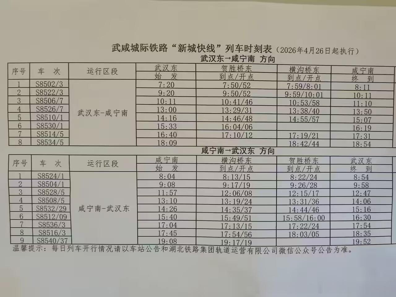 【武咸城际铁路日常时刻表】 2026年4月26日起武汉至咸宁城际铁路“新城快线”列车时刻表:每日8.5对。(网友)