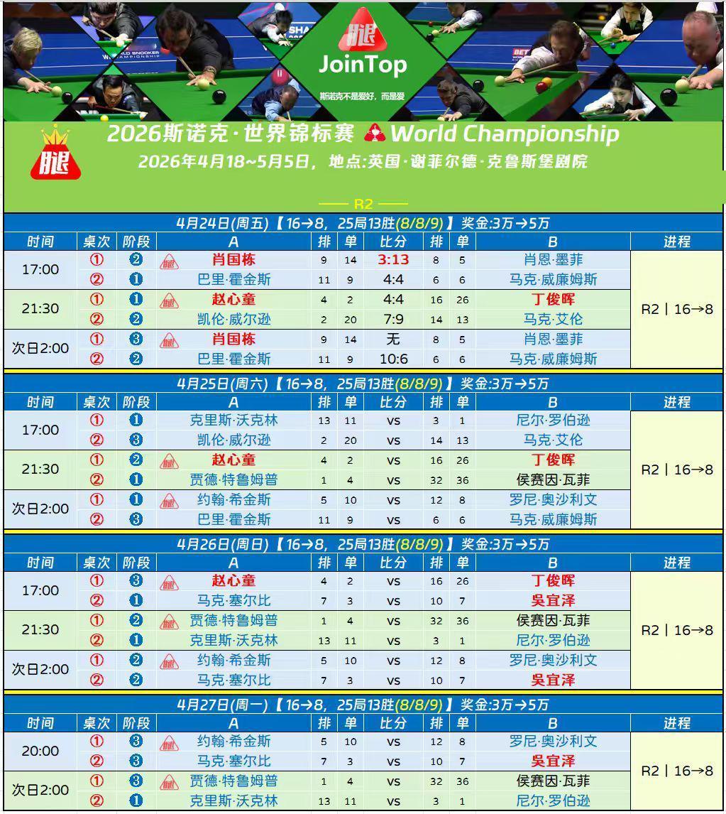 斯诺克16进8的比赛,墨菲免打第三阶段,13-3击败肖国栋晋级。 赵心童和丁俊晖平分秋色,第一阶段4-4平手。双方算是比较客气,相互送礼。 凌晨的比赛,艾伦保住了自己的优势,9-7领先凯伦威尔逊。本场比赛,打的也是荡气回肠,现场掌声一片。就开始艾伦打出5连鞭,凯伦连胜6局,6-5反超。最后定格在9-7。 4强专业户霍金斯和老将马克威廉姆斯,也打完第2阶段,目前比分10-6,霍金斯领先。 今天晚上9点半,丁俊晖对阵赵心童,其他时间段没有中国选手比赛了。不知道肖国栋会不会直播这一场比赛。