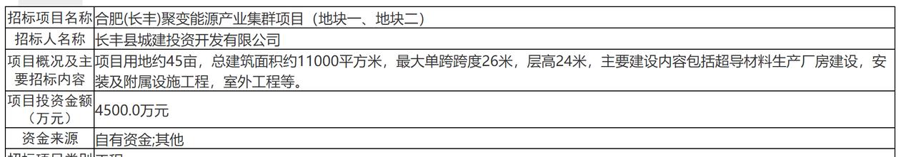 硬核赛道赋能区域发展提速】 近日,合肥(长丰)聚变能源产业集群项目(地块一、地块二)正式发布招标信息,标志着长丰县在前沿新能源与高端先进制造领域布局再落关键一子,产业发展势能持续迸发、势头迅猛向好。 本次招标由长丰县城建投资开发有限公司牵头推进。项目规划用地约45亩,总建筑面积约11万平方米,建筑最大单跨跨度26米、层高可达24米。建设内容聚焦超导材料生产专属厂房打造,同步配套安装工程、附属设施及室外基础配套工程,为聚变能源核心产业链落地筑牢硬件载体。 该项目总投资额达4500万元,资金来源为自有资金及其他配套资金,保障充足稳定。作为前沿能源赛道的重点产业平台,项目瞄准核聚变能源配套关键超导材料这一高精尖细分领域,建成后将进一步补全长丰新能源产业关键环节,集聚上下游优质资源,夯实长丰在合肥乃至全省新能源与先进制造业的产业根基。 近年来,长丰县持续抢抓新能源、高端科创产业发展风口,重大产业项目接连落地、产业集群加速成型、发展动能节节攀升。本次聚变能源产业集群项目的推进,既是长丰深耕硬核科技产业、推动产业转型升级的生动缩影,更将持续为县域经济高质量跨越式增长注入强劲持久新动力,助力长丰持续跑出产业发展“加速度”。
