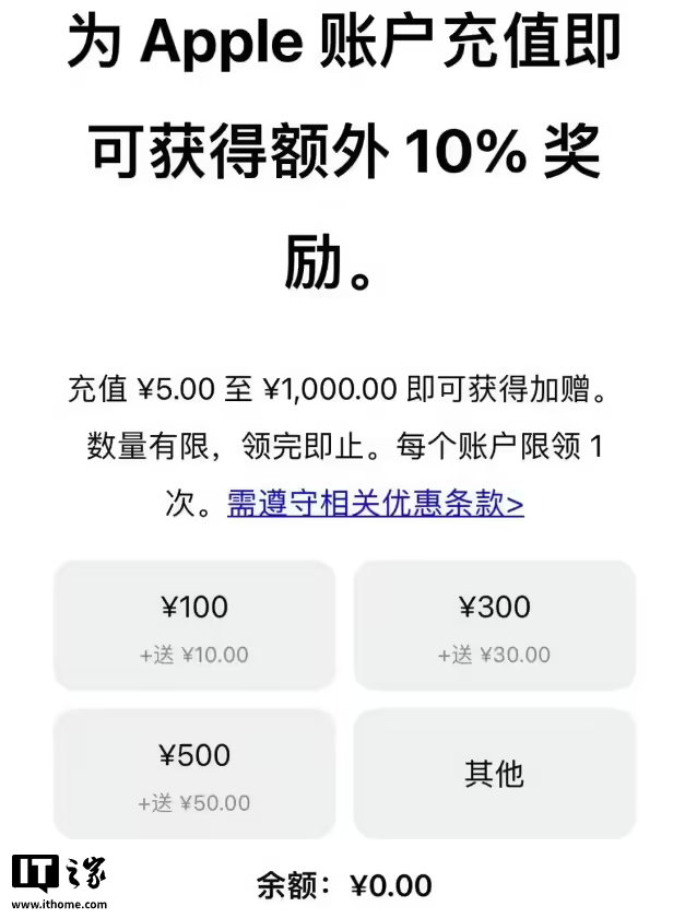 【苹果国区充值可获额外10%奖励】苹果 App Store 国区今天上线了充值加赠优惠活动,可获得额外 10% 奖励,数量有限,领完即止。