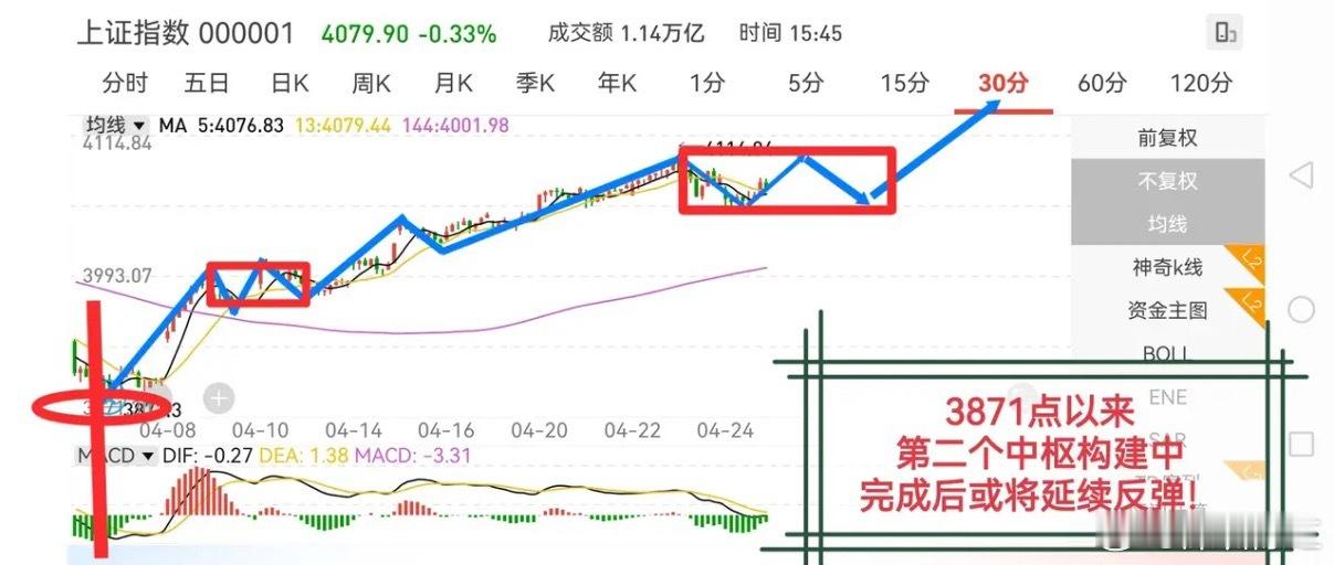 从周线看,2635点以来三浪主升中,3040点以来中枢构建或将完成,正向上离开,后市还有很大上升空间(图1);从日线看,4197的后一笔下,见底3794的后一笔上过程中,不能判定结束,反弹力度超预期,3794点或将是短期调整结束点,下周关注何时开启日线一笔下(图2);从30分钟K线看,3871点以来第二个中枢构建中,下周或将延续反弹(图3)。财经a股