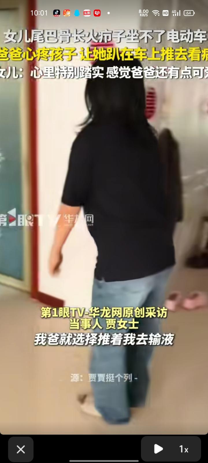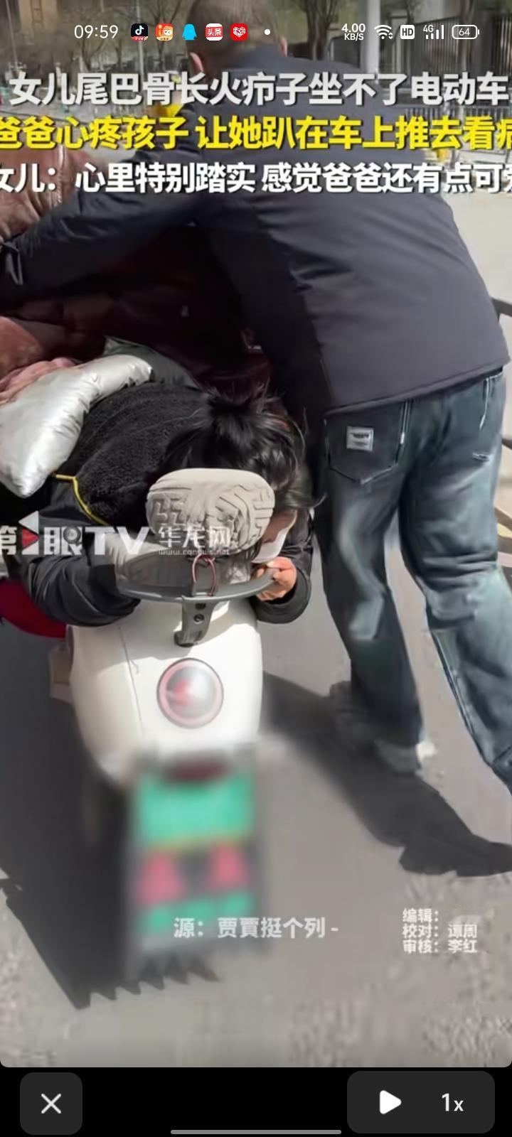 4月17日,山西大同。女儿尾巴骨长火疖子坐不了电动车,老父亲心疼她,让她趴在车上推着电动车去医院。 当事人贾女士称,当时挺害怕,总感觉电动车挺沉,然后自己也挺沉。有爸爸在身边,心里就特别踏实,感觉爸爸挺可爱的。