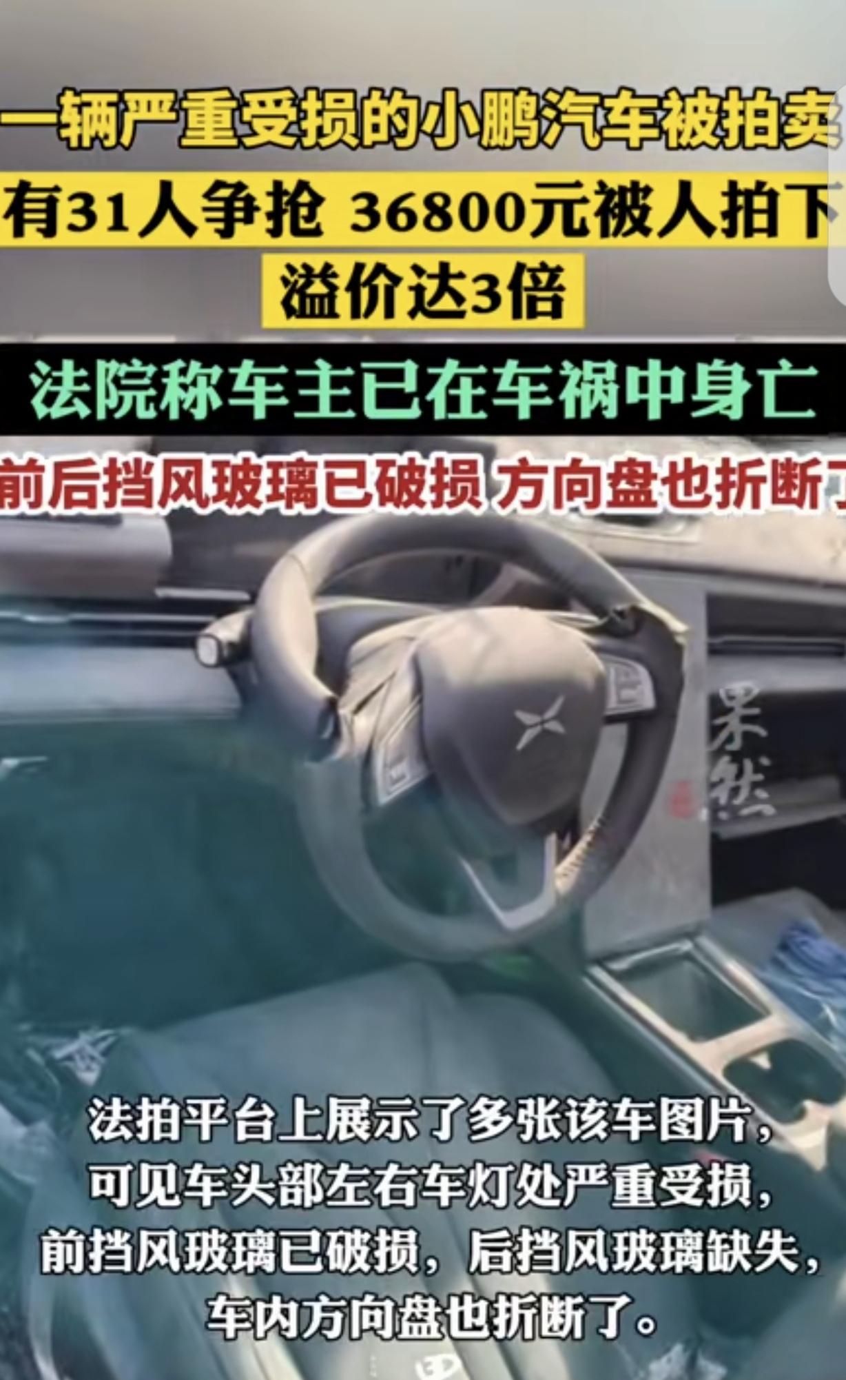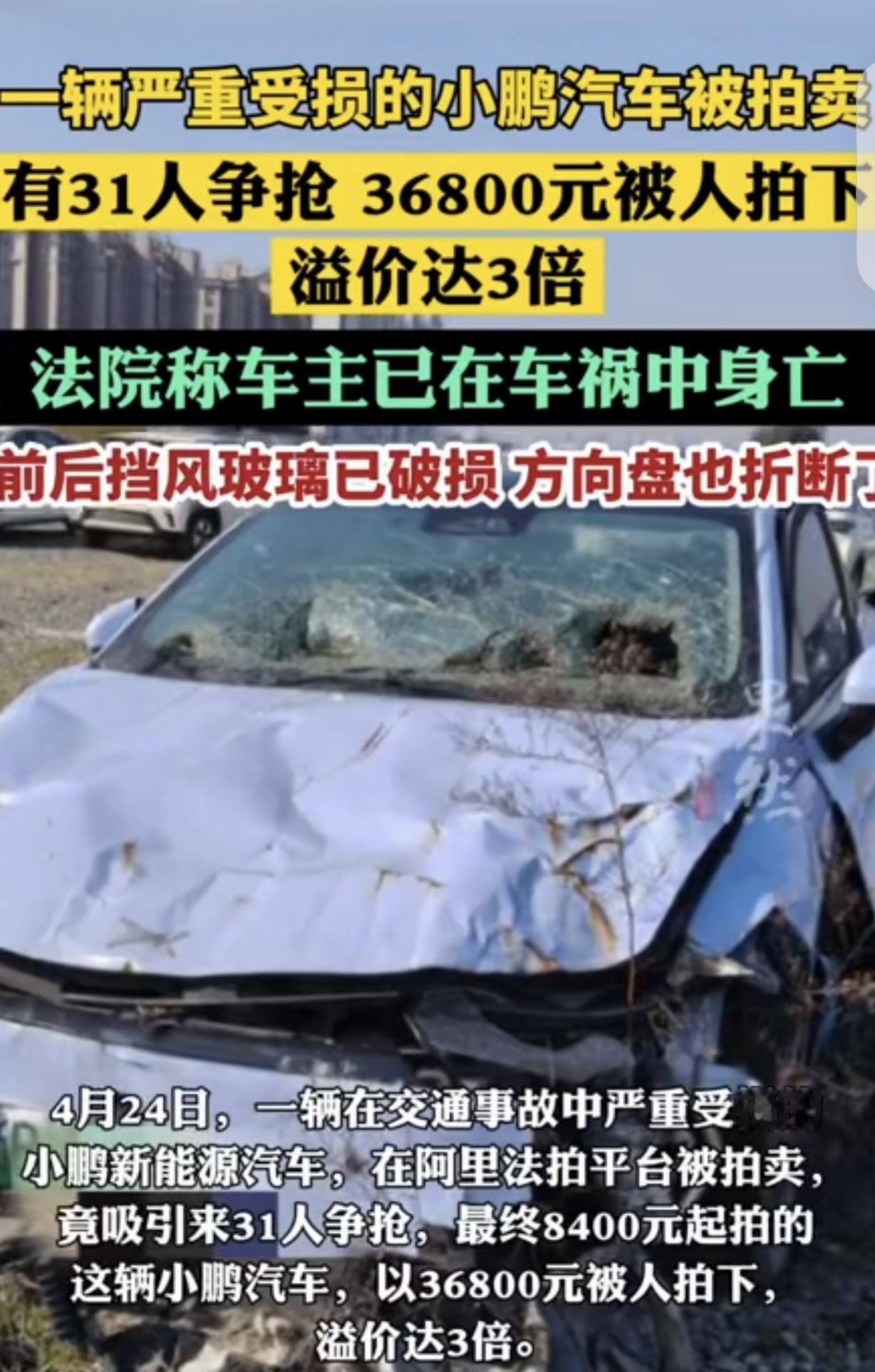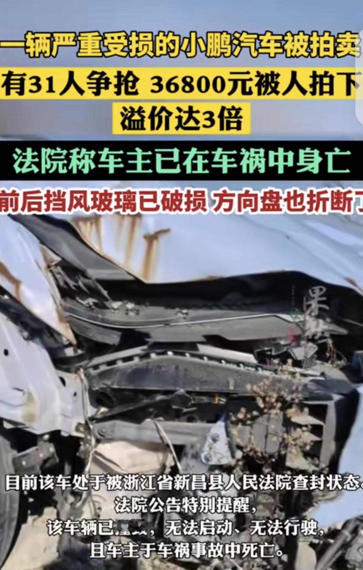 “奇了怪了!”浙江,一男子开车出了车祸,人当场身亡,车子被撞报废,前后挡风玻璃全碎了,方向盘也折断,不能开了,法院以8400元价格拍卖,车牌还不随车转让,竟吸引31人竞拍,最终以36800元成交,溢价高达3倍。为啥一辆破车这么多人疯抢?明白人一番话让人恍然大悟。 据4月24日齐鲁壹点报道,浙江最近出了桩新鲜事,一辆撞得稀巴烂的小鹏新能源车,在法拍平台上被抢破了头。 这车的来头可不简单,2022年7月,车主在奉化区江口路段开车时偏离车道,一头撞上隔离栏,人当场没了,车也成了废铁。 从那以后,它就停在宁波江北区的一个停车场里,一待就将近4年。 如今,法院把它拿出来拍卖,起拍价才8400块,还明说车牌不随车转让,车辆没法启动、没法开。 甚至,连有没有没处理的违章都不管,结果愣是引来31人报名争抢。 打开法拍平台的图片,就能看到这车惨成啥样:车头左右大灯全碎了,前挡风玻璃裂得像蜘蛛网,后挡风玻璃干脆没了影。 方向盘也断成两截,整个车厢里乱糟糟的。评估公司去看了后,直接按报废车算,给出12000块的评估价。 可就是这么一辆没人看好的破车,从4月23日10点开拍,起拍价8400元,愣是拍到了24日11点24分。 经过167次加价,最后以36800块成交,比起步价翻了3倍还多,围观的网友更是超过3.3万人。 有人纳闷,这破车到底值啥?难不成是想拿去以旧换新?或者拆废铁卖? 可查了浙江2026年的以旧换新政策才知道,得是2019年12月31日前登记的新能源车,才能享受补贴,这车2022年才买,根本不符合条件。 武汉一位干二手车的内行人一语道破天机:这里面都是生意。 别看这车外表惨,可它是2022年才买的,当年就出了事故,跑的里程肯定不多。 新能源车最金贵的就是电池、电机、电控这“三电系统”,它们一般都在车底或者车尾,说不定这次事故没伤到这些核心部件。 要是真没坏,光拆下来卖零件都值不少钱。 就算核心部件受损,只要不是结构性的大问题,花点钱修好,再以正常二手车的价格卖出去,利润空间大得很。 毕竟收这种事故车的价格,往往只有正常二手车的40%-60%。 有的甚至只比报废价高一点,而修车的零配件和人工成本,行内人都有办法压得很低。 法院那边也说了,拍卖的钱给车主还债,法院协助过户,其他的,买家自己掂量。 看来,这31个竞拍者,个个都是抱着捡漏的心态,想在这堆废铁里挖出金疙瘩呢。 这场法拍闹剧,本质是“信息差”催生的捡漏。 31位竞拍者盯着的,从来不是这辆撞得稀烂的壳子,而是新能源车最值钱的“三电系统”。 2022年上牌当年出事,意味着车辆大概率没跑多少里程,核心部件可能完好无损。 哪怕修修补补,只要成本能控制在正常二手车价的一半,转手就是翻倍利润。 在商言商,这种“废墟淘金”的生意经无可厚非,但也提醒普通买家:法拍车水很深,没有专业眼光,别轻易碰。 《最高人民法院关于人民法院网络司法拍卖若干问题的规定》第10条规定,网络司法拍卖应当确定保留价,拍卖保留价即为起拍价。 法院以评估价70%8400元作为起拍价,符合规定。 但需注意,该规定第13条明确,拍卖财产已知瑕疵和权利负担应在公告中充分披露。 法院虽提示“车辆无法启动、车牌不随车转让”,但没明确“三电系统”状态,可能存在信息披露不充分,竞拍者需自行承担瑕疵风险。 对此,你怎么看?