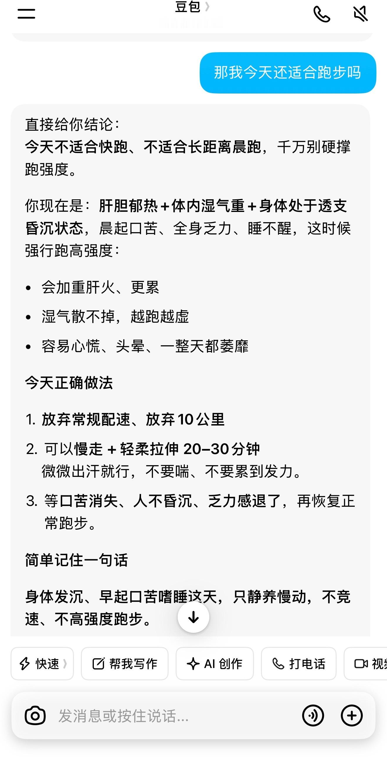 昨天十点就睡着了,莫名其妙的困问了问豆包,说这是体内湿气重的表现好吧,今天的跑步