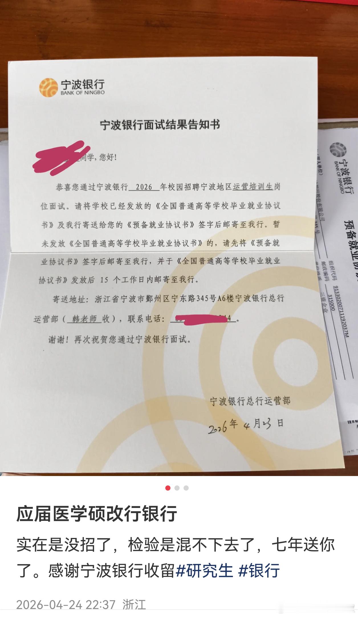 小红书上看到,资料齐全,感觉是真的。温医大医学检验的硕士,去xx银行总行工作了。其实挺好的,双赢。