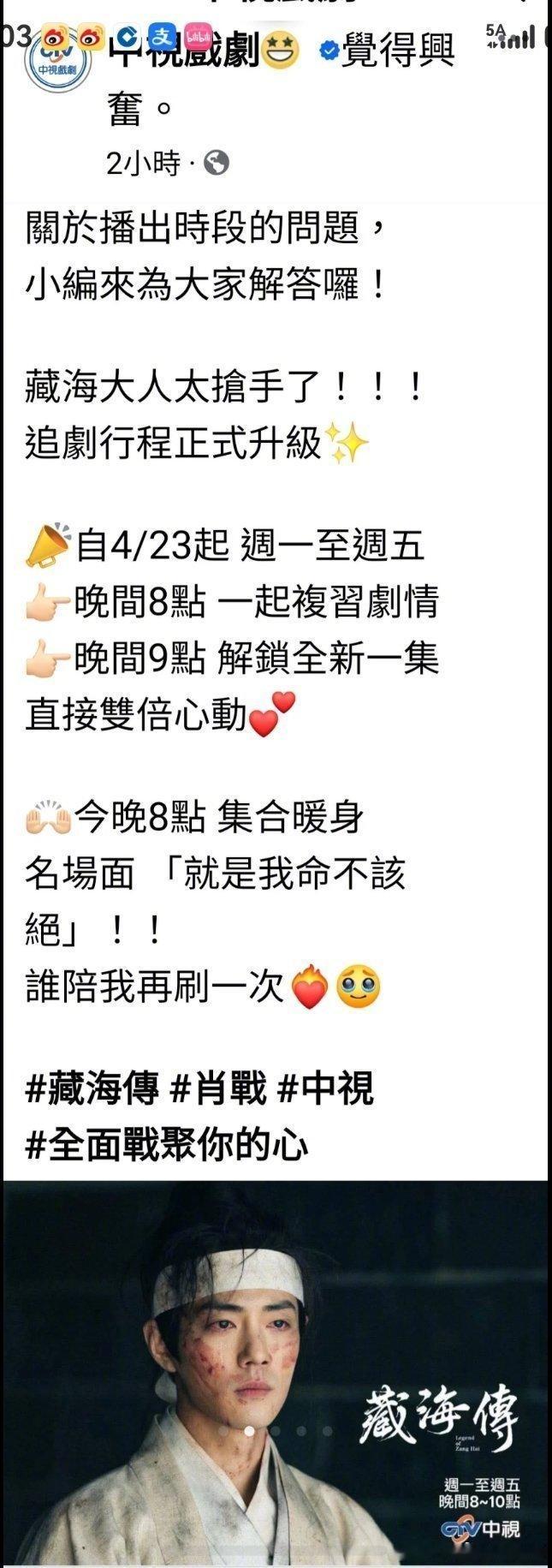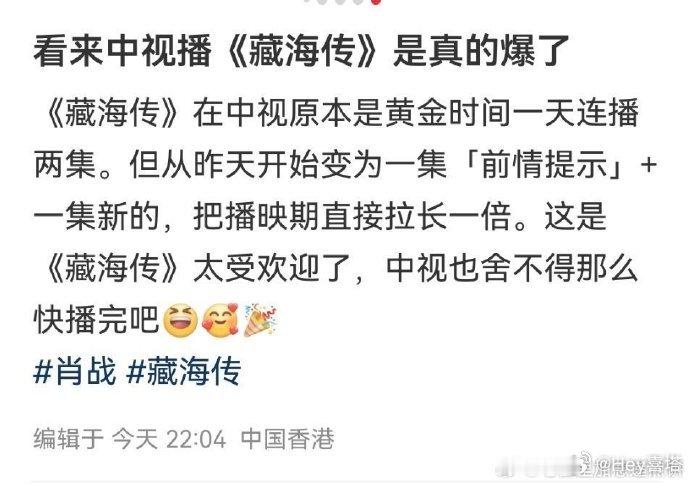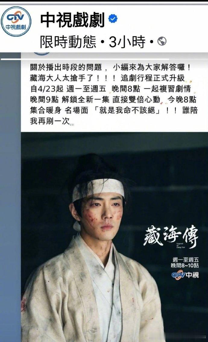 剧王就是剧王!藏海传实隔一年在湾湾中视黄金档播出,咋还是那么牛...开播就是现象级爆剧中视还修改了剧播时间...一天一集新内容,一集重播前一日的。就这样收视率也好牛