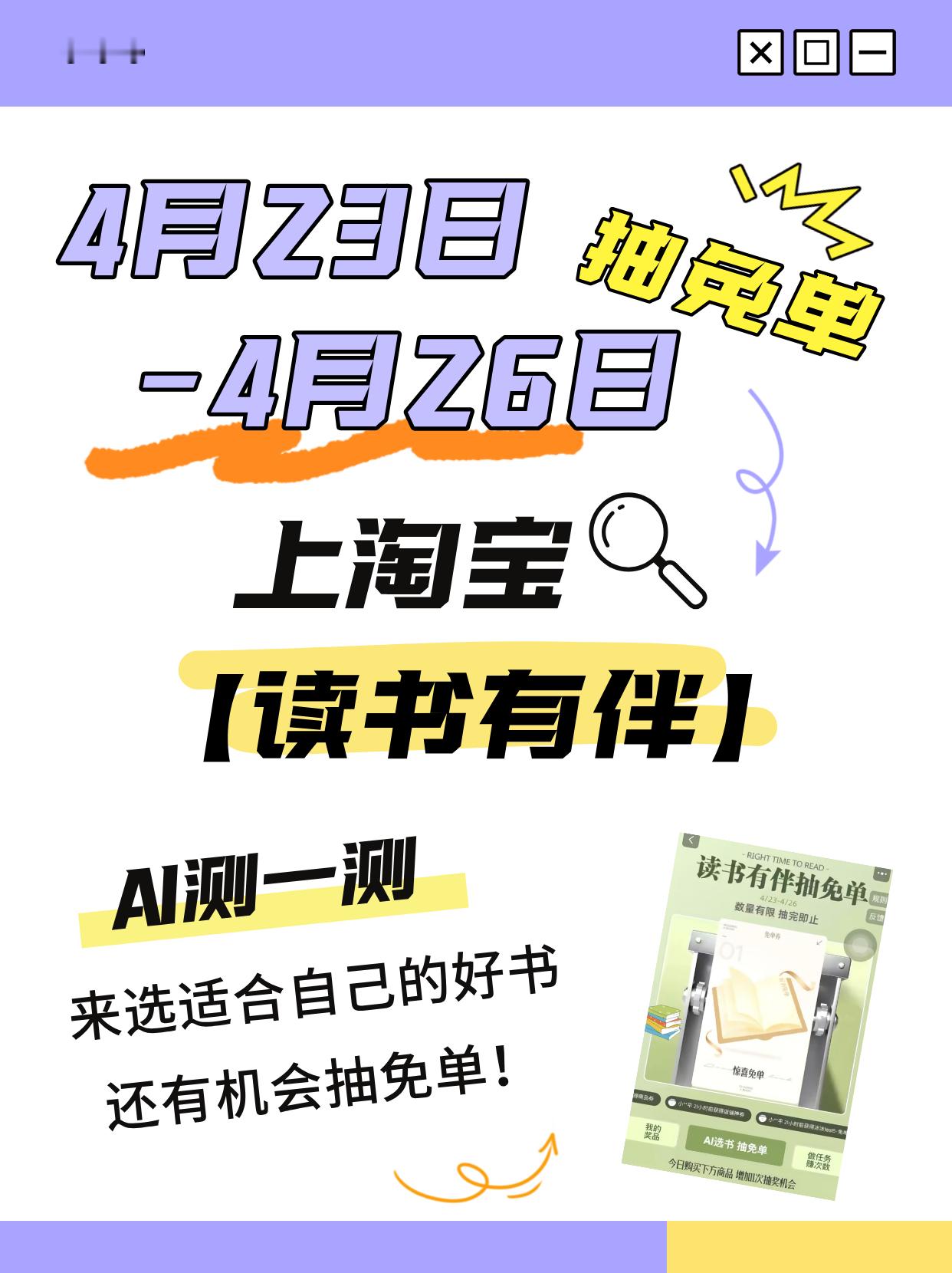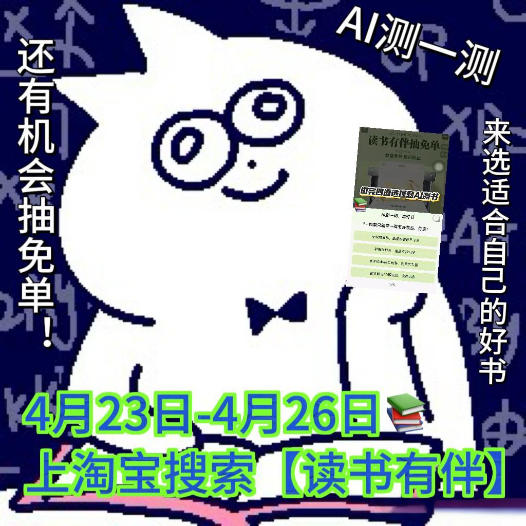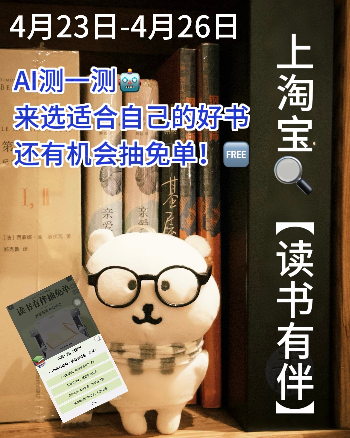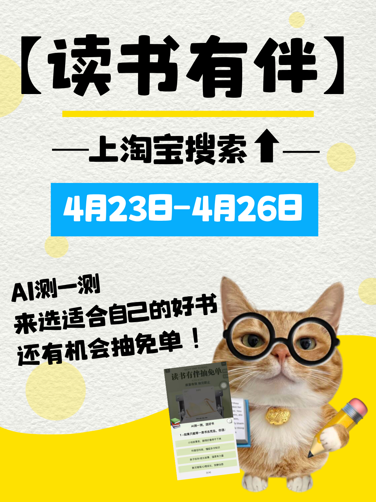 读书有伴沉浸式共读的快乐来了!4.23-4.26,上淘宝搜索【读书有伴】抽免单,AI化身专属阅读向导帮你精选好书,参与活动就能抽取免单福利,书香相伴,快来解锁读书惊喜 天猫图书天猫世界读书日