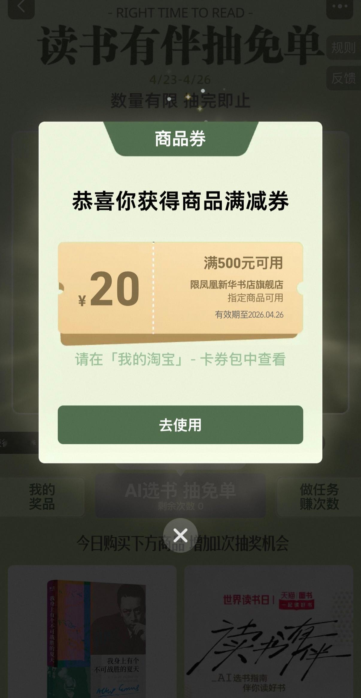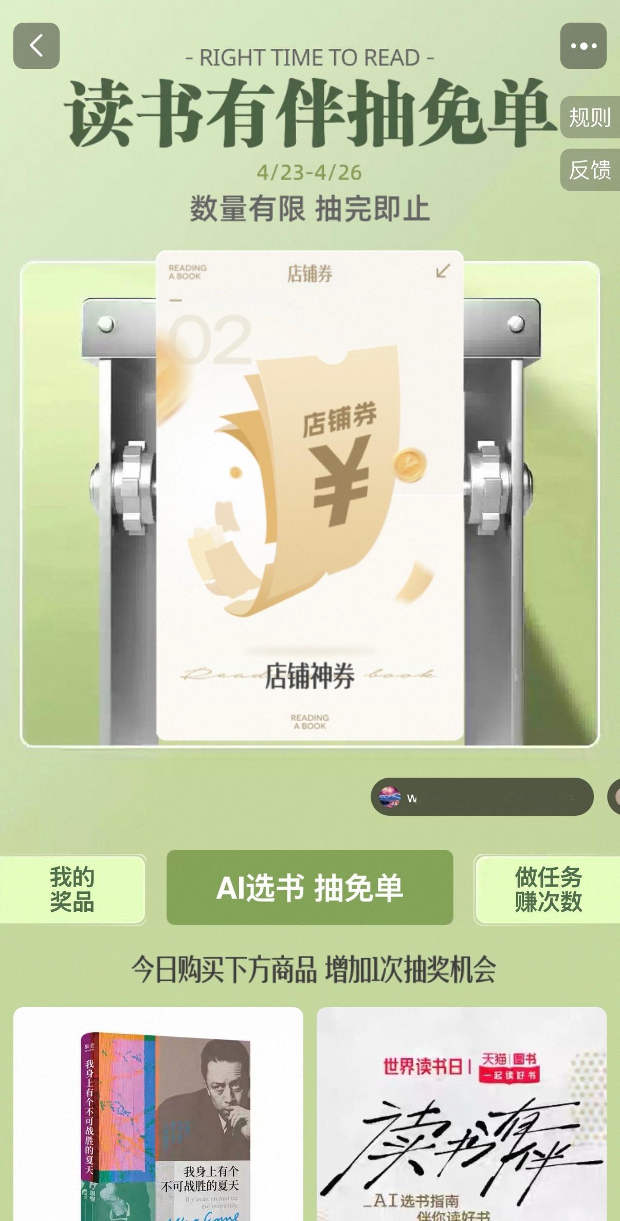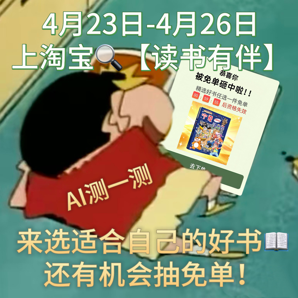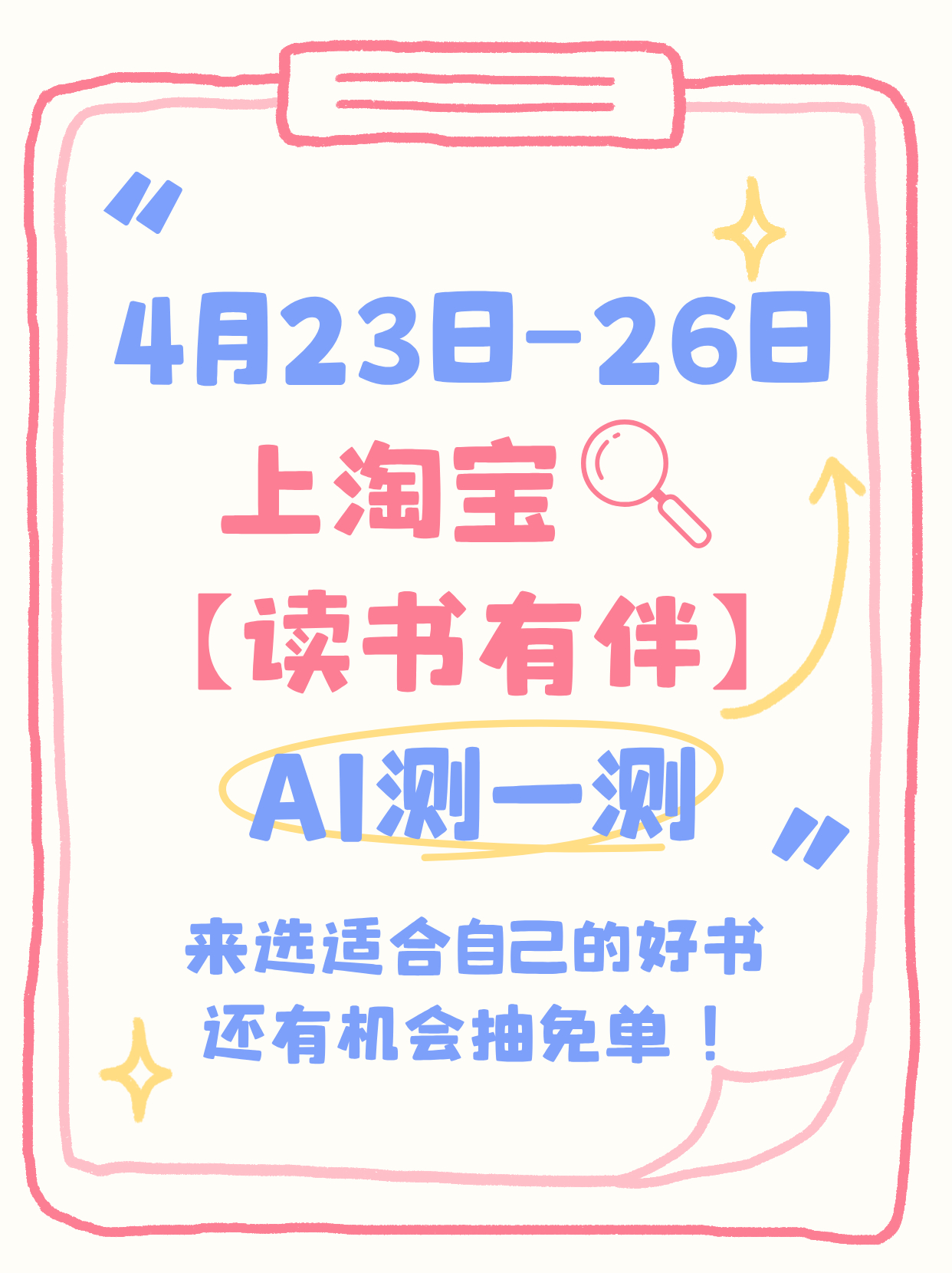 读书有伴沉浸式共读的快乐来了!4.23-4.26,上淘宝搜索【读书有伴】抽免单,AI化身专属阅读向导帮你精选好书,参与活动就能抽取免单福利,书香相伴,快来解锁读书惊喜 天猫图书天猫世界读书日