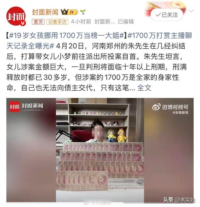 50岁的朱先生,小学三年级辍学,辛苦打拼30多年,开了个农贸档口。离异再婚,女儿小梦跟着他。2020年,小梦中专读了一年辍学,才15岁。2021年,16岁开始管账。2023年,公司资金全交给她。然后,1700万没了。 全部打赏给了直播平台。从早上八九点刷到晚上十一点,一天花好几万,2025年3月多次单日消费超16万。朱先生发现时,档口没钱进货,外面还欠几百万货款。他带女儿自首,女儿说:“坐牢也无所谓。” 这不是故事,是大河报报道的真实案件。 曾仕强先生说过:养儿子不教,害死自己全家;养女儿不教,害死别人全家。时代变了——养女儿不教,照样害死自己全家。 朱先生的问题出在哪?三句话: “我文化有限,忙着跑生意,跟女儿沟通少。” ——不养。 “她是我女儿,怎么会坑我?” ——不教。 “她说改,我就没换人管账。” ——不管。 一个16岁的小姑娘,中专辍学,没有任何财务训练,突然掌握公司全部资金。她懂什么?她只知道刷手机有人夸、打赏有排面。感情缺失的孩子,会在虚拟世界里疯狂寻找存在感。一天16万,不是她坏,是她根本不知道钱意味着什么。 平台表态很得体:成年人消费,你情我愿;如果涉嫌违法,我们配合。MCN也说了:钱是平台收的,我们跟女儿没有直接合同关系。法律上,没毛病。 朱先生现在担心女儿职务犯罪要坐牢。早干嘛去了? 这件事给所有中小老板敲响警钟:别让你的孩子,成为你唯一的“财务总监”。 别用“忙”当借口,养而不教,结局就是家破人未亡,但钱没了,债压身,女儿还觉得坐牢无所谓。 幸好,朱先生只有一个档口。倒闭了,不至于连累太多人下岗。但这样的教训,一个就够了。