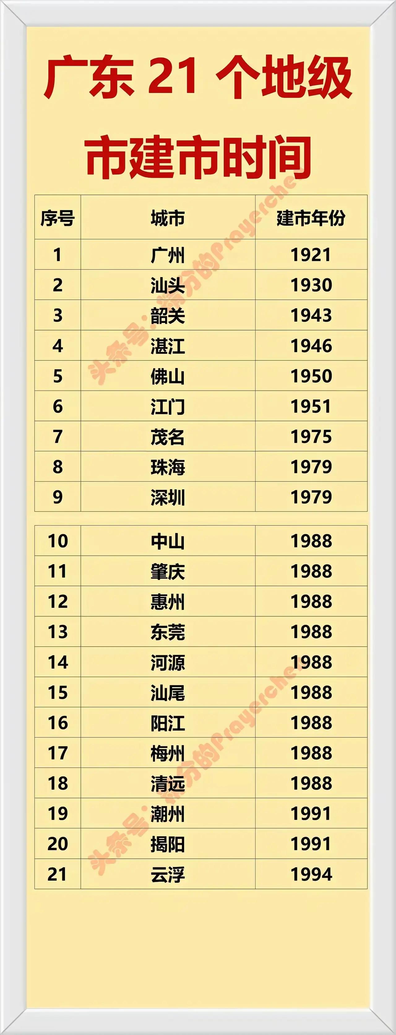 广东省全省21个地级市名字诞生年龄榜。 广东省全省21个地级市建市时间一览表。