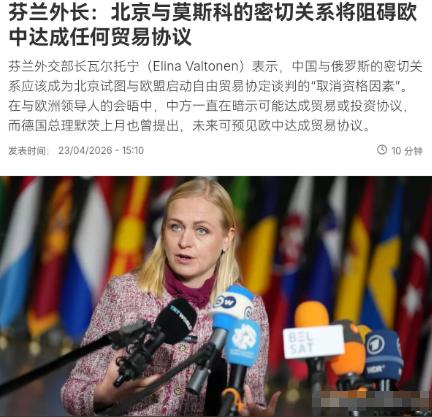芬兰外长对我们喊话,要求我们二选一!4月23日,根据法新社报道,芬兰外交部长瓦尔托宁表示,北京与莫斯科的密切关系将阻碍欧盟与中国达成任何贸易协议。鉴于任何谈判都必须得到欧盟27个成员国的支持才能启动,芬兰实际上可以对任何朝这个方向发展的举措行使否决权。 这话看似强硬,实则逻辑不通。中欧投资协定早在2021年就被欧洲议会自己冻结,起因是欧方炒作的涉疆议题。自己先按下暂停键,如今反倒拿这个要挟中国“选边站”,难免显得底气不足。 更耐人寻味的是时间点。就在瓦尔托宁放话的前一个月,芬兰总理奥尔波刚带领庞大商务团访问中国,双方签署几十项合作协议,中芬双向投资存量超过230亿美元。 一边派总理来华签大单,一边让外长公开叫板,这种看似矛盾的“分裂型外交”,在一向务实的北欧国家身上极为罕见。芬兰的急切,背后藏着深层隐忧。 俄乌冲突前,芬兰奉行几十年军事中立,2022年冲突爆发后,其安全神经瞬间绷紧,2023年4月火线加入北约,彻底告别中立路线。 这一步让芬兰丧失了外交弹性,安全依赖北约意味着在涉俄议题上必须明确表态,且要比老牌成员国更激进,才能证明自身“忠诚度”——这是北约新成员的生存法则,也是瓦尔托宁喊话的本质:向华盛顿交投名状。 更关键的是芬兰的经济困境。2026年第一季度,芬兰贸易逆差同比扩大一倍多,出口下降3.1%。经济疲软时,政治人物往往习惯寻找外部靶子,对中国放狠话既能在国内塑造强硬形象,又能在北约体系刷存在感,可谓一箭双雕。 但这种操作正在透支芬兰的独立性,当小国的安全焦虑被大国利用,便会丧失多维平衡的能力,陷入“安全绑架外交”的困境。 瓦尔托宁口中的“王牌”——欧盟27国一致同意的规则,理论上能让芬兰卡死中欧贸易协议,但使用这一权力的代价极高:会得罪所有想与中国做生意的欧盟成员国。 德国车企首当其冲,中国是德国三大汽车巨头的最大海外市场,份额占其全球销量的30%到40%,法国干邑白兰地行业也难以沉默,中方对其加征反倾销税已让该行业遭受冲击。 更核心的是,欧盟内部对华政策分歧严重:以德国、匈牙利为代表的务实派主张“不脱钩、谈生意”,以法国、波罗的海国家为代表的强硬派则坚持将价值观与贸易绑定。 中方的应对策略清晰且精准:靶向打击。对推动加征关税的法国白兰地下手,对德国影响较大的钢铁关税反制则相对克制,巧妙放大了德法之间的裂痕。 芬兰此时跳出来喊“一票否决”,不仅代表不了欧盟,反而暴露了欧盟无法形成统一对华政策的软肋,各方利益南辕北辙,只能靠小国放狠话刷存在感。 美国怂恿芬兰抛出“二选一”,核心原因是中俄贸易的持续升温刺痛了西方。2026年1-2月,中俄贸易额同比增长12.0%,达到390.4亿美元,俄罗斯稳居中国第一大原油供应国,一季度进口份额约20%。 与此同时,中国从沙特和伊拉克的进口量分别下降30.7%和46.0%,在霍尔木兹海峡局势紧张的背景下,俄罗斯的稳定能源供应成为中国的刚需。 瓦尔托宁曾酸溜溜地表示,“中国正从这场冲突中获益,俄罗斯已沦为中国的次级伙伴”。这话看似攻击,实则是欧洲焦虑的真实写照:他们无法理解,中国为何能不选边站队,还能在乱局中稳住能源安全。 答案很简单,中国的外交路线从不由他人定义,中俄关系是“不结盟、不对抗、不针对第三方”的战略协作,既有弹性又有底线,不会因外部施压破裂,也不会因一时利益捆绑过深。 芬兰的“二选一”喊话,终究是雷声大雨点小,有三个无法回避的现实理由。其一,利益不允许。2025年中欧贸易总额超8000亿美元,中国是欧盟第二大贸易伙伴,芬兰对华出口1月同比增长3.4%,若真用否决权卡中欧协议,芬兰本土企业首先会反对。 其二,盟友不配合。德国总理已公开表态,认为中欧达成贸易协议具备现实可能性,匈牙利更是直接反对欧委会的对华强硬路线,芬兰孤掌难鸣。 其三,时机不对。中欧投资协定冻结五年间,全球经济格局已发生深刻变化,美国“脱钩断链”导致自身通胀高企,欧洲“去风险”加速制造业外流,此时搞“二选一”政治操弄,只会让芬兰更难堪。 国际政治中,“二选一”从来都是弱者的困境,真正有实力的玩家,永远有第三条路可走。中国选择与所有国家发展正常关系,跟俄罗斯做生意、跟欧洲谈合作、与美国保持沟通,这不是投机,而是实力使然。 芬兰外长的喊话,本质上是欧洲集体焦虑的暴露:既离不开中国市场,又无法摆脱对美国的依赖,只能在夹缝中反复横跳。 可惜这种横跳式表演,既改变不了中俄关系的走向,也推动不了中欧贸易的进展,最终只会让芬兰自己两边不讨好。 你觉得欧盟内部,哪个国家最可能率先绕过芬兰的“一票否决”,与中国单独推进双边贸易安排?评论区聊聊你的判断。
