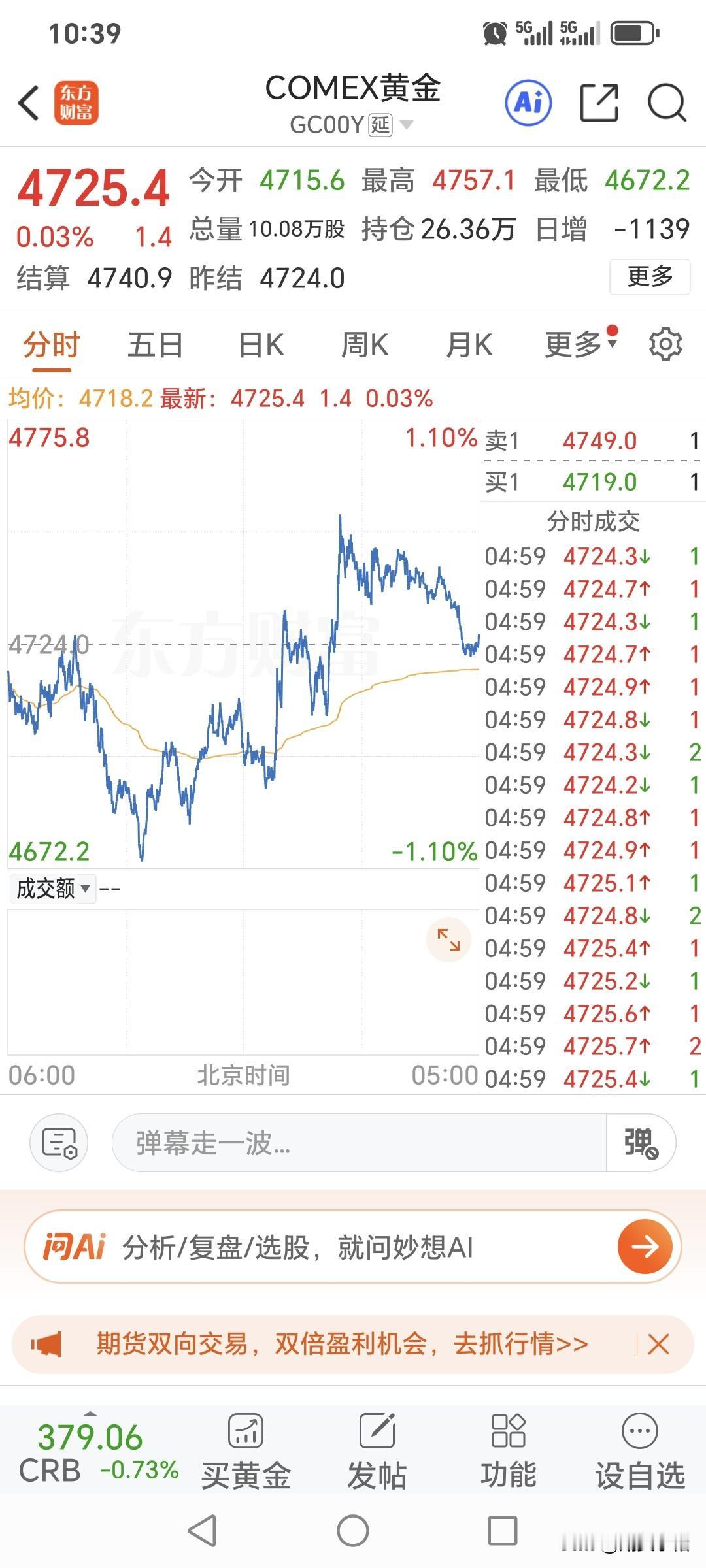 周五, 国际金价低开高走, 震荡运行,略微收红。 开盘价为4715.6美元, 盘中最高升至4757.1美元, 最低价位4672.2美元, 最终收盘于4725.4美元, 略微上涨1.4美金。 对于国际金价, 期货小褚认为有望止跌企稳!