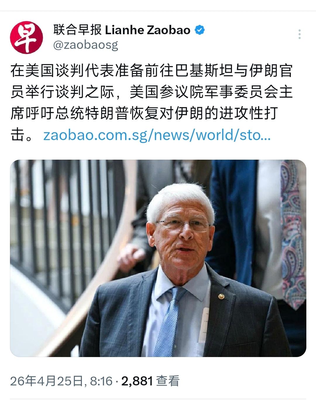 新加坡联合早报今天(4月25日)报道:“在美国谈判代表准备前往巴基斯坦与伊朗官员举行谈判之际,美国参议院军事委员会主席呼吁总统特朗普恢复对伊朗的进攻性打击。” [机智]评几句:美方这出“边谈边打”的戏码演得实在拙劣。谈判代表前脚刚飞往伊斯兰堡,参议院军事委员会主席威克后脚就鼓吹特朗普“彻底摧毁伊朗军力”。这种赤裸裸的极限施压,与其说是维护安全,不如说是军工复合体和亲以色列政客企图让中东火药桶更易燃易爆。