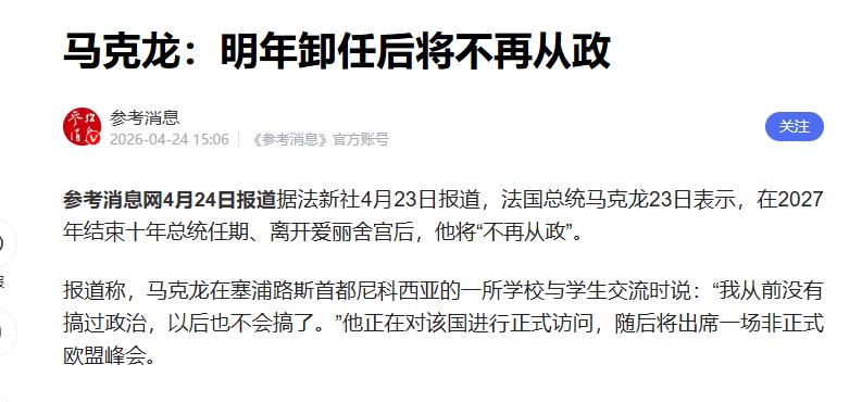 当地时间4月23日,法国总统马克龙在一场公开活动上表示,自己结束连续两届、十年任期后将彻底退休、不再从政,马克龙强调以后绝对不会再涉及政治,必然会回归生活,马克龙当年就像一个“天降猛男”,打着打破常规的旗号,喊着“前进!”的口号,一下子就把法国那些老牌政客给干蒙了。 马克龙上台时,确实风光无限,2017年,39岁的他横空出世,一举击败左翼和极右翼对手,带着改革的热血冲进爱丽舍宫,他誓言要打破传统,搞养老金改革、推动欧洲自己说了算,甚至想带着欧盟在全球刷存在感。 但理想很丰满,现实很骨感,养老金改革搞出黄马甲运动,大家上街抗议了好几个月,乌克兰危机里,他一会儿说可能派兵,一会儿又往回缩,被国内骂得狗血淋头。 虽然连任成功了,但支持率一路下跌,议会里说话越来越不管用,极右翼的勒庞还虎视眈眈盯着总统宝座,说白了,这十年,他有过高光时刻,但也摔过不少跟头。 现在说要退休,说白了就是“打不过就溜”,国际形势一团糟:特朗普万一回来,美国可能又要搞单边主义,欧盟得看美国脸色,中东打得不可开交,欧盟说话没人听,国内极右翼势力越来越猛,他推的改革也没彻底解决经济和社会矛盾。 他想在美国和中国之间找平衡,推动欧洲自己说了算,但现实太骨感,想法经常碰壁,他自己也清楚,再干下去可能晚节不保,不如趁现在体面退场,留个好名声。 马克龙这十年,给法国和欧洲留下了啥?好的方面,他确实推动了欧盟国防合作,法德关系更铁了,欧洲想摆脱美国单干的念头更强烈了。 但坏的方面,改革没彻底治好法国社会的病根,经济问题还是没解决,更关键的是,他一走,法国政坛可能更乱,万一勒庞上台,法国政策可能大反转,欧盟一体化也可能被拆台。 说白了,他的退休不是一个人的事,而是法国甚至欧洲政治风向标的一次大变动。 再往深了说,马克龙的退休,其实暴露了欧洲现在有多难,他曾被视为欧洲“自己说了算”的希望,想在美中博弈间走出第三条路。 但现实是,欧洲经济靠美国,安全靠北约,自己内部还天天扯皮。 马克龙的想法很好,但实力不够,最后只能妥协,他的退休,等于告诉欧洲:单靠一两个领导人的雄心,救不了欧洲的困境。 说白了,马克龙这时候退休,其实挺聪明的,很多领导人为了权力死磕到底,结果晚节不保,他趁着自己还没彻底“翻车”,主动退场,至少能保住现在的名声。 但他留下的烂摊子,够法国和欧洲头疼的,现在法国社会分裂严重,极右翼势力抬头,经济问题也没解决,万一勒庞上台,可能直接推翻马克龙的政策,甚至动摇欧盟根基。 更深层看,马克龙的退休反映出欧洲的根本问题:没有足够的实力,却想当全球玩家,经济不给力,内部不团结,光靠喊口号搞不成战略自主。 未来欧洲能不能挺住,不取决于有没有马克龙这样的明星领导人,而要看各国能不能放下小算盘,一起解决问题。 比如,应对气候变化、能源危机、难民问题,必须欧洲各国齐心合力,光靠法国一国根本玩不转。 马克龙走了,但“前进”的口号不能丢,欧洲现在需要的不是英雄主义,而是踏踏实实的合作。 如果他留下的政治遗产能变成各国共同的努力,那他的退休也算有意义,否则,欧洲可能继续在迷茫中打转,被全球浪潮甩得更远。 信息来源:参考消息2026-04-24 马克龙:明年卸任后将不再从政