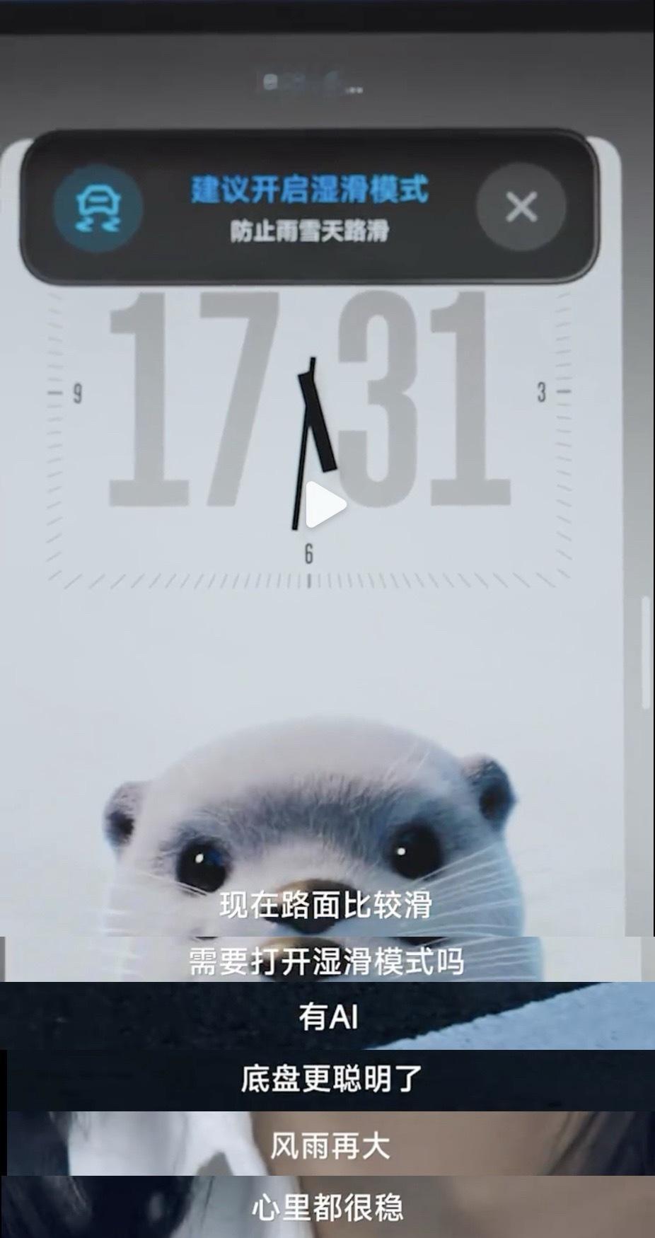 而且小米SU7还有很多功能和细节值得关注。首先,就是那个“湿滑模式”配上AI提醒,小爱会根据路况来给你建议开启哪种模式,这种主动为你着想的功能,确实是够安心。